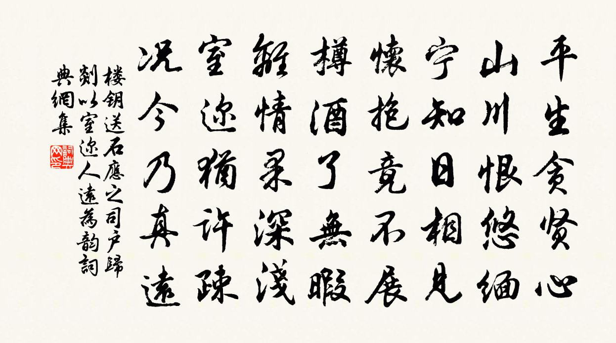 詩詞名句歷史字典書法欣賞書法字典國語詞典說文解字康熙字典古漢語字典標 題 作 者 詩 句 送石應之司戶歸剡以室邇人遠為韻作者:樓鑰 朝代:宋代原文平生貪賢心,山川恨悠緬。寧知日相見,懷抱竟不展。樽酒了無暇,離情果深淺。室邇猶許疎,況今乃真遠。詩詞問答問:《送石應之司戶歸剡以室邇人遠為韻》的作者是誰?答:樓鑰問:該詩寫於哪個朝代?答:宋代書法欣賞送石應之司戶歸剡以室邇人遠為韻書法作品詩詞推薦謹和老人雪晴洪咨夔〔宋代〕雲屏九折跨三休,公欲行春雪不愁。逗暖流澌鳴暗谷,送晴倒景漾層樓。似無似有草痕動,半落半開花氣浮。婆餅首陽石延年〔宋代〕遜國同來訪聖謨,適觀爭國誓師徒。恥生湯武干戈日,寧死唐虞揖讓區。大義充身安是餓,清魂有所未應無。始終送羊振文先輩往桂陽歸覲皮日休〔唐代〕桂陽新命下彤墀,彩服行當欲雪時。登第已聞傳禰賦,問安猶聽講韓詩。竹人臨水迎符節,風母穿雲避信旗。無限吳徐知院題意一堂吳勢卿〔宋代〕幾載辛勤有此堂,芝峰直面麗譙傍。千章山木朝煙合,百尺樓陰夜月涼。物我本於仁上一,居諸偏向靜中長。衰年宮詞王珪〔唐代〕禁里春濃蝶自飛,御蠶眠處弄新絲。碧窗盡日教鸚鵡,念得君王數首詩。定西番(執胡琴者九人·般涉調)張先〔宋代〕焊撥紫槽金襯,雙秀萼,兩回鸞。齊學漢宮妝樣,競蟬娟。三十六弦蟬鬧,小弦蜂作團。聽盡昭君幽怨,莫重彈。江月樓薛濤〔唐代〕秋風仿佛吳江冷,鷗鷺參差夕陽影。垂虹納納臥譙門,雉堞耽耽俯漁艇。陽安小兒拍手笑,使君幻出江南景。馬嵬賈島〔唐代〕長川幾處樹青青,孤驛危樓對翠屏。一自上皇惆悵後,至今來往馬蹄腥。水龍吟(丁卯生日)劉克莊〔宋代〕此翁幸自偏盲,那堪右目生微翳。羽流禳謝,緇郎懺悔,天乎無罪。客曰不然,也因口腹,也因瞻視。汝夜披黃卷昭慶寺朱繼芳〔宋代〕幽尋得勝趣,城市幾人能。古柳深呂磬,長廊盡處燈。畫龍聽說法,塑佛看齋僧。別寺經行遍,茲游昔未曾。為黃仲宣賦山中四章章四句方回〔宋代〕山中之人,耘夫耕民。鯖厥五侯,其如子真。冬眺宋祁〔宋代〕城外斜光角已催,城頭倦客首空回。星霜牢落凋年往,天地蒼茫暝色來。千尾昏鴉愁迥戍,幾蹄征馬思窮埃。使君戊午喜罷和糴姚勉〔宋代〕到處相思虎政苛,設官本意果如何。民今不足將誰足,糴本名和豈是和。一例冉求增聚斂,幾人陽子拙催科。昨來古風二首上湯丞相范成大〔宋代〕抱瑟游孔門,豈識宮與商?古曲一再行,乃雜巴人倡。知音顧之笑,解弦為更張。歸來掩關臥,冰炭交愁腸。平生又九月朔同諸將觀石馬橋王邁〔宋代〕萬年石馬勝緣楊,千萬金鰲跨水橫。法從福田勤播種,小庵心匠自經營。不緣打破工夫到,那得中流砥柱平。我輩壯別梁啓超〔清代〕赫赫皇華記,淒淒去國吟。出匡恩未報,贈縞愛何深。重話艱難業,商量得失林。隻身浮海志,使我憶松陰。沁園春(壽岳君舉)蔣捷〔宋代〕昔裴晉公,生甲辰歲,秉唐相鈞。向東都治第,才娛老眼,北門建節,又絆閒身。燠館花濃,涼台月淡,不記弓刀南浦胡仲弓〔宋代〕修途無好況,滿面受風埃。見說山窮處,曾經水患來。溪橋橫獨木,田野長荒萊。薄暮投孤館,寒猿聲更哀。紅梅方惟深〔宋代〕清香皓質世稱奇,謾作輕紅也自宜。紫府與丹來換骨,春風吹酒上凝脂。直教臘雪無藏處,只恐朝雲有散時。溪上宿石門葉適〔宋代〕好溪瀉百壑,南北傾萬峰。山凡堆阜俗,映岸羞為容。石門忽秀出,老幹蔭渟洪。舍舟從口入,便已離塵中。眾芳名句推薦橫眉冷對千夫指,俯首甘為孺子牛。魯迅《自嘲》 不才者進,則有才之路塞。宋祁、歐陽修、范鎮、呂夏卿等《新唐書·列傳·卷四十一》 長風幾萬里,吹度玉門關。李白《關山月》 眼前直下三千字,胸次全無一點塵。于謙《觀書》 漆燕黃鸝夸舌健,柳花榆莢斗身輕。王禹偁《清明日獨酌》 從臣皆半醉,天子正無愁。李商隱《陳後宮》 內不失真,而外不殊俗王通《中說·卷六·禮樂篇》 江天一色無纖塵,皎皎空中孤月輪。張若虛《春江花月夜》 善為吏者樹德,不善為吏者樹怨。韓非及後人《韓非子·外儲說左下》 記得舊時,探梅時節。老來舊事無人說。呂本中《踏莎行·雪似梅花》