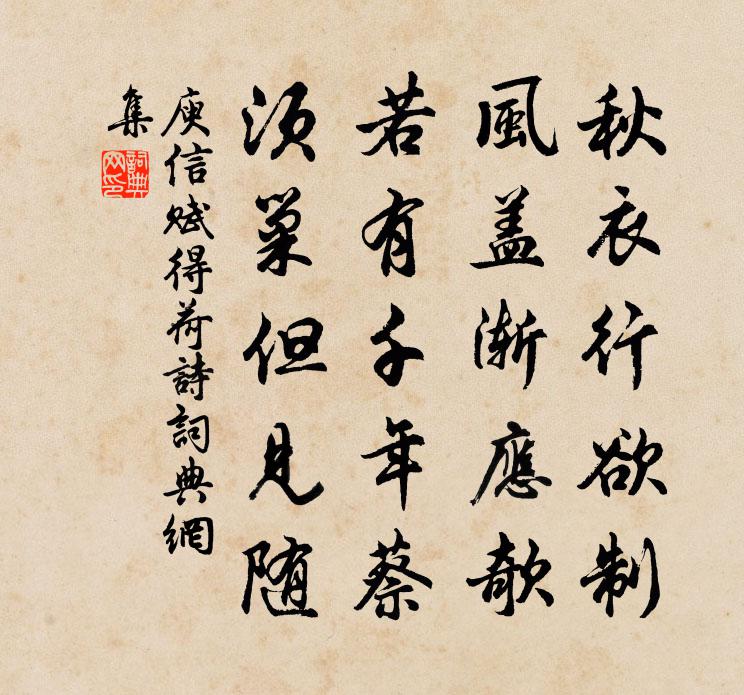 詩詞名句歷史字典書法欣賞書法字典國語詞典說文解字康熙字典古漢語字典標 題 作 者 詩 句 賦得荷詩作者:庾信 朝代:南北朝賦得荷詩原文秋衣行欲制。風蓋漸應欹。若有千年蔡。須巢但見隨。詩詞問答問:賦得荷詩的作者是誰?答:庾信問:賦得荷詩寫於哪個朝代?答:南北朝問:庾信的名句有哪些?答:庾信名句大全庾信賦得荷詩書法欣賞賦得荷詩書法作品詩詞推薦和之美舟行雜詩八首船行遇風司馬光〔宋代〕蔡水僅成波,不若江湖濬。誠無頃側憂,纜弱終難進。再次韻馬主簿二首陳造〔宋代〕冥搜成癖漫勤斯,緬想騷人正坐馳。點化今逢萬金劑,神奇蒸出九華芝。三吳才雋應焚硯,萬里風煙盡入詩。盍與禪人並化主寫真求贊釋正覺〔宋代〕老發衰髭,頂雪頷絲。方頭似鑿,鈍口如椎。相逢閒受用,慣喫落便宜。蒲鞋價賤陳尊宿,漿水錢還王老師。法不寄顧次岳五首許月卿〔宋代〕鏡湖扁字無今古,無古無今只此心。雲入枕邊堂署玉,月窮天外日鎔金。樓台仿佛水墨畫,煙霧空濛岩壑岑。須信呈鞏睡翁周文璞〔宋代〕家本汶陽縣,累世事耕蠶。室廬既焚盪,飄零住江潭。幼及識故老,頗聞鄉里談。最盛陽和時,梨杏春酣酣。岱宗以坡公君如大江日千里我如此水千山底為韻作趙蕃〔宋代〕落此鼪鼯野,宜從麋鹿群。何知交友內,而乃得夫君。題六代祖師畫像張元乾〔宋代〕一葦浮江雙履歸,花開震旦共傳衣。本來心印無文字,畫到盧能足是非。浣溪沙張孝祥〔宋代〕已是人間不繫舟。此心元自不驚鷗。臥看駭浪與天浮。對月只應頻舉酒,臨風何必更搔頭。暝煙多處是神州。偶賦姜特立〔宋代〕勇退知幾自古難,人情宦路險於山。勸君休唱眉間曲,放我山中自在閒。登塔強至〔宋代〕身世如追汗漫遊,丹梯一步擬三休。漢唐前後漫陳跡,城郭是非勞寸眸。寒日微明飛鳥背,孤煙漸起暮山頭。姓名滾繡球楊巽齋〔宋代〕琢玉英標不染塵,光涵月影愈清新。青皇宴罷呈餘技,拋向東風展轉頻。王氏園置燭觀梅李復〔宋代〕堂前梅樹花初遍,露坐看花對夕風。苦恨夜收春色去,故移燈入素光中。亂爭短髮愁邊白,清映衰顏酒後紅。醉眼三竺道中三首方回〔宋代〕少人行處路方佳,半著僧鞋半草鞋。直到全無馬糞處,山僮竹箒掃松釵。龍興寺楊備〔宋代〕高剎長幡敞淨居,方袍圓笠照通渠。龍興舊額加新榜,不見金輪皇帝書。題共樂堂錢暄〔宋代〕疏就湖山秀氣濃,花林茂列景爭雄。管弦交奏客歡合,台榭競登人喜同。環嶂鷺行飛早晚,平波魚陣躍西東。荒蕪題山中故靜禪師劉得仁〔唐代〕寂滅身何在,門人隔此生。影懸塵已厚,塔種柏初成。溪院秋先雪,山堂古有精。當時掛錫處,樹老幾枝傾。乙丑元日大雪,自飲自醉,遂呼王山人過尚徐渭〔明代〕元日獨酌不成酡,穿林喚客雪中過。三百六旬又過矣,四十五春如老何。幘軟漸知簪發少,興豪那計酒籌多。小園思佳客令/思佳客趙彥端〔宋代〕天似水。秋到芙蓉如亂綺。芙蓉意與黃花倚。歷歷黃花矜酒美。清露委。山間有個閒人喜。秋懷赤松道士貫休〔唐代〕仙觀在雲端,相思星斗寒。常憐呼鶴易,卻恨見君難。石罅青蛇濕,風榸白菌乾。終期花月下,壇上聽君彈。避暑女冠李益〔唐代〕霧袖煙裾雲母冠,碧花瑤簟井冰寒。焚香欲降三青鳥,靜拂桐陰上玉壇。名句推薦樓前綠暗分攜路,一絲柳、一寸柔情。吳文英《風入松·聽風聽雨過清明》 悵臥新春白袷衣,白門寥落意多違。李商隱《春雨》 靜夜沉沉,浮光靄靄,冷浸溶溶月。丘處機《無俗念·靈虛宮梨花詞》 彩袖殷勤捧玉鍾。當年拚卻醉顏紅。晏幾道《鷓鴣天·彩袖殷勤捧玉鍾》 綠萼添妝融寶炬,縞仙扶醉跨殘虹曹雪芹《詠紅梅花得“紅”字》 寧知寸心裡,蓄紫復含紅!沈約《詠新荷應詔》 綠陰不減來時路,添得黃鸝四五聲。曾幾《三衢道中》 人生如寄,何事辛苦怨斜暉。朱熹《水調歌頭·隱括杜牧之齊山詩》 離恨又迎春,相思難重陳。和凝《菩薩蠻·越梅半拆輕寒里》 游女帶花偎伴笑,爭窈窕,競折團荷遮晚照。李珣《南鄉子·乘彩舫》