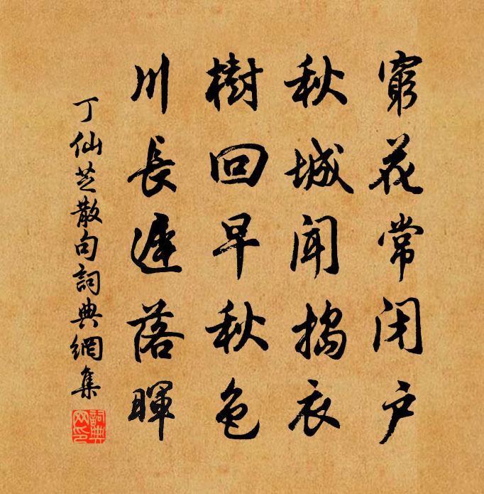 詩詞名句歷史字典書法欣賞書法字典國語詞典說文解字康熙字典古漢語字典標 題 作 者 詩 句 句作者:丁仙芝 朝代:唐代句原文窮花常閉戶,秋城聞搗衣。樹回早秋色,川長遲落暉。(見《吟窗雜錄》)詩詞問答問:句的作者是誰?答:丁仙芝問:句寫於哪個朝代?答:唐代問:句是什麼體裁?答:句丁仙芝句書法欣賞句書法作品注釋全唐詩:卷114_24詩詞推薦失調名佚名〔宋代〕莫怪沈腰易瘦。偈頌八十七首釋慧開〔宋代〕針芥相投,體用俱全。衲僧門下,十萬八千。慶伯以二詩送別已而又辱同廣聲追送慶伯復有趙蕃〔宋代〕試問為黔郡,何如與質要。其行既穹絕,有思只飄蕭。但悔嶮投足,未論官折腰。同舟故能送,折簡不勞招。龍翔真歇和尚求詩贈一首蘇籀〔宋代〕象骨岩居閩府教,江海兩封黃紙召。孤雲自南仍更東,阻覲堯蓂友廊廟。講通時論毗曇經,一佛出世只為人。凝師上平江陳侍郎十絕張元乾〔宋代〕功名碎啄與時同,譬似 * 中。不覺片雲隨雨雹,適從何處運神通。送趙守備解南漳赴湖北倉陳淳〔宋代〕前年邦人迎公來,人人喜公來何暮。今年邦人送公去,人人恨公去何遽。公在南漳甫三年,仁政率起百年慕。在民次韻宮師相公南遊還舊山及闕下二首宋祁〔宋代〕武當宴席揮金罷,鄭圃聯章驛霧成。莫獨名山藏秘本,別須留副在華京。第一百六十文天祥〔宋代〕春水滿南國,慘澹故園煙。三年門巷空,永為鄰里憐。以前韻再繼五絕王洋〔宋代〕老眼非慳不愛花,慣逢開謝不須嗟。君看桃李成陰後,也自能回長者車。寓目孔武仲〔宋代〕清灣氣象暮潭潭,漁客車罾似引帆。三尺鯉魚投密網,西江雖廣爾何堪。西江月·堂上謀臣尊俎劉過〔宋代〕堂上謀臣尊俎,邊頭將士干戈。天時地利與人和,“燕可伐歟?”曰:“可”。今日樓台鼎鼐,明年帶礪山河。大昭君怨陸游〔宋代〕晝永蟬聲庭院。人倦懶搖團扇。小景寫瀟湘。自生涼。簾外蹴花雙燕。簾下有人同見。寶篆拆官黃。炷薰香。春日與裴迪過新昌里訪呂逸人不遇王維〔唐代〕桃源一向絕風塵,柳市南頭訪隱淪。到門不敢題凡鳥,看竹何須問主人。城上青山如屋裡,東家流水入西鄰。閉戶竹杖郭印〔宋代〕長短身為度,洪纖節自明。時時勤執捉,處處伴經行。峻坂腰能直,危橋步亦輕。化龍他日事,靈壽若為榮。晚歸聞韓子華見訪梅堯臣〔宋代〕門外多車騎,後跡亂前蹤。誰識此來過,塵蹄重複重。歸有野仆言,恨不故人逢。豈無餚酒設,所向乖所從。未能送穆寂赴舉皎然〔唐代〕天子錫玄纁,傾山禮隱淪。君拋青霞去,榮資觀國賓。劍光既陸離,瓊彩何璘玢。夙駕別情遠,商弦秋意新。冥冥一剪梅·舟過吳江蔣捷〔宋代〕一片春愁待酒澆。江上舟搖,樓上簾招。秋娘渡與泰娘橋,風又飄飄,雨又蕭蕭。(渡 一作:度。橋 一作:嬌哭刁景純蘇軾〔宋代〕讀書想前輩,每恨生不早。紛紛少年場,猶得見此老。此老如松柏,不受霜雪槁。直從毫末中,自養到合抱。宏材題神移仁壽塔黃庭堅〔宋代〕十二觀音無正面,誰令塔戶向東開。定知四梵神通力,曾借六丁風雨推。蠅說冰霜如夢寐,鷃聞鐘鼓亦驚猜。從今十用喜雨韻三首吳潛〔宋代〕江南九月菊花香,獵子牽黃與臂蒼。歲幸豐登連楚越,地非磽薄比渠涼。雨收甘澤歸三印,雷斂神功入五箱。作解名句推薦己不自信,何以信於人?張廷玉《明史·列傳·卷四十九》 願天上人間,占得歡娛,年年今夜。柳永《二郎神·炎光謝》 花徑不曾緣客掃,蓬門今始為君開。杜甫《客至》 雪後燕瑤池,人間第一枝。趙令畤《菩薩蠻·春風試手先梅蕊》 斜陽照墟落,窮巷牛羊歸。王維《渭川田家》 臣心一片磁針石,不指南方不肯休。文天祥《揚子江》 不經一番寒徹骨,怎得梅花撲鼻香。黃櫱禪師《上堂開示頌》 池台竹樹三畝餘,至今人道江家宅。劉禹錫《金陵五題·並序》 珠玉在側,覺我形穢。劉義慶《世說新語·容止》 故人在其下,塵土相豗蹴。蘇軾《送頓起》