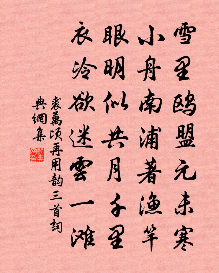 詩詞名句歷史字典書法欣賞書法字典國語詞典說文解字康熙字典古漢語字典標 題 作 者 詩 句 再用韻三首作者:裘萬頃 朝代:宋代再用韻三首原文雪裡鷗盟元未寒,小舟南浦著漁竿。眼明似共月千里,衣冷欲迷雲一灘。詩詞問答問:再用韻三首的作者是誰?答:裘萬頃問:再用韻三首寫於哪個朝代?答:宋代裘萬頃再用韻三首書法欣賞再用韻三首書法作品詩詞推薦知樞密院孫溫靖公輓辭二首蘇頌〔宋代〕位冠樞機輔,名高羽翼臣。一言曾寤意,四近久同寅。丹旐都城遠,青松隧路新。西瞻裕陵道,想從屬車塵。枕上崔敦禮〔宋代〕輾轉孤燈夢不成,念家憂國總關情。月明定到棠梨上,時有啁嘈格磔聲。瓦店雨作四首楊萬里〔宋代〕詩人長怨沒詩材,天遣斜風細雨來。領了詩材還又怨,問天風雨幾時開。挽李閩師母夫人三首劉宰〔宋代〕旌旗直指陣雲開,文駟雕軒壽母來。萬古歡呼和氣盪,胡兒不戰倒戈回。次日再鎰韻三首陳造〔宋代〕微吟緩步愜晴沙,聊謝愔愔載婦車。時遣貰貂邨店酒,回思縛虎長官衙。春山好著屏中色,吟筆誰添錦上花。不妨新月甚佳方思明叔乃忽見過作此詩趙蕃〔宋代〕出戶江山好,入門風月新。荒涼如宅舍,窘束是官身。念子豈為遠,能來端可人。笑談殊未了,催去阻重闉。歲暮絕句四首晁說之〔宋代〕沈沈欲雪岫雲平,月尾年頭此有情。童稚歡欣學秦語,不知家世本東京。又和自官舍夢歸南湖釋寶曇〔宋代〕夢中身世亦間關,覺後懸知去不難。陶令歸來猶有酒,子云老去不遷官。時供採擷花千樹,醉共團欒竹萬竿。想見臨川從事還別崔法曹戴叔倫〔唐代〕謬官辭獲免,濫獄會平反。遠與故人別,龍鍾望所言。陰天寒不雨,古木夜多猿。老病北歸去,餘年學灌園。句應傃〔宋代〕嘉木灌業春意好,可憐不種紫荊花。奉和九月九日登慈恩寺浮屠應制趙彥昭〔唐代〕出豫乘秋節,登高陟梵宮。皇心滿塵界,佛跡現虛空。日月宜長壽,人天得大通。喜聞題寶偈,受記莫由同。栩菴力高士與同散步二首白玉蟾〔宋代〕功名不直一杯水,富貴於我如浮雲。詩句清妍仍淨遠,遊絲飛絮聽繽紛。久欲乞歸未得一日蒙恩放歸不勝欣喜塗中得十吳芾〔宋代〕淡煙斜日媚郊原,中有人家似輞川。地側忽驚車馬過,三三兩兩竹籬邊。雙雙燕 春山丘處機〔元代〕春煙淡盪,青山媚,行雲亂飄空界。花光石潤,秀出洞天奇怪。戶牖平高萬丈,盡耳目、臨風一快。多生浩劫塵情秋野五首杜甫〔唐代〕秋野日疏蕪,寒江動碧虛。繫舟蠻井絡,卜宅楚村墟。棗熟從人打,葵荒欲自鋤。盤餐老夫食,分減及溪魚。易識留題毘陵潘氏宅假山梅堯臣〔宋代〕人心本好靜,世事方擾擾。丘壑未去時,庭中結山小。長欲見蒼翠,何須聽猿鳥。有志同尚平,當期婚嫁了。昭君怨王哲〔元代〕奉報早離火院。棄了一家攀戀。自在水雲前。樂安然。便結長生鍛鍊。得做上仙親眷。搜出碧潭玄。月團圓。締盟楊氏〔宋代〕珠簾半床月,青竹滿林風。何事今宵景,無人解與同。孫常州輓詩戴表元〔宋代〕白髮何人在,青山此老歸。殉攜貧日硯,斂著賜余衣。文物鷗興滅,園林鶴是非。諸公莫惆悵,英爽世間稀。秋興三首蘇軾〔宋代〕故里依然一夢前,相攜重上釣魚船。嘗陪大幙全陳跡,謬忝承明愧昔年。報國無成空白首,退耕何處有名田。黃雞名句推薦江淮度寒食,京洛縫春衣。王維《送綦毋潛落第還鄉 / 送別》 自暴者,不可與有言也;自棄者,不可與有為也。孟子《孟子·離婁章句上·第十節》 天涯倚樓新恨,楊柳幾絲碧。晏幾道《六么令·雪殘風信》 停車數行日,勸酒問回期。王建《送人游塞》 長夏村墟風日清,檐牙燕雀已生成。張耒《夏日三首·其一》 念去去,千里煙波,暮靄沉沉楚天闊。柳永《雨霖鈴·寒蟬淒切》 至今思項羽,不肯過江東。李清照《夏日絕句》 梅花大庾嶺頭髮,柳絮章台街里飛。李商隱《對雪二首》 為惡而畏人知,惡中猶有善路;為善而急人知,善處即是惡根。洪應明《菜根譚·概論》 千山鳥飛絕,萬徑人蹤滅。柳宗元《江雪》