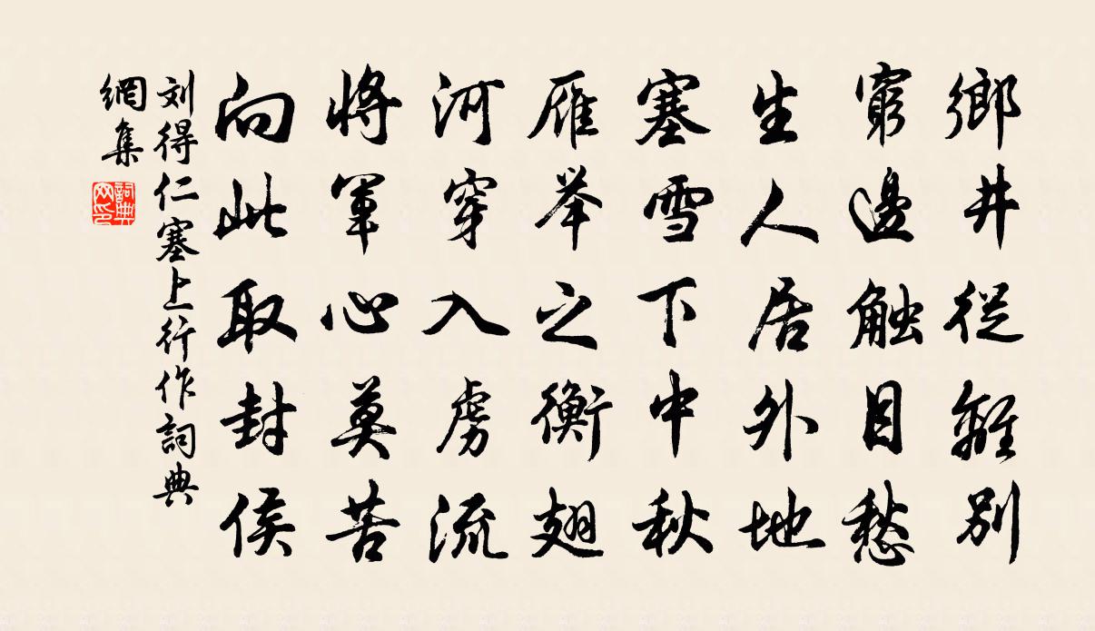 詩詞名句歷史字典書法欣賞書法字典國語詞典說文解字康熙字典古漢語字典標 題 作 者 詩 句 塞上行作作者:劉得仁 朝代:唐代塞上行作原文鄉井從離別,窮邊觸目愁。生人居外地,塞雪下中秋。雁舉之衡翅,河穿入虜流。將軍心莫苦,向此取封侯。詩詞問答問:塞上行作的作者是誰?答:劉得仁問:塞上行作寫於哪個朝代?答:唐代問:塞上行作是什麼體裁?答:五律劉得仁塞上行作書法欣賞塞上行作書法作品注釋全唐詩:卷544-13詩詞推薦送宋省元教授吉州徐璣〔宋代〕州名因水得,此地昔曾游。自有歐公宅,常多儒者流。野花開別岸,春色在行舟。勉就詩書教,名高不用求。閏六月,立秋後暮熱,追涼郡圃二首楊萬里〔宋代〕夏欲盡頭秋欲初,小涼未苦爽肌膚。夕陽幸自西山外,一抹斜紅不肯無。訴衷情張元乾〔宋代〕形似之美。久欲記之而因循。比與諸公和長短句,故及之以訴衷情。蓋里中推星球紅、鶴頂紅,皆佳品。海舶便風舶使王會溪太守趙見泰九日領客枉顧山中賦采蒲壽宬〔宋代〕天台赤霞頂,峨眉翠雲間。人物自楚楚,文采何斑斑。屈宋艷何摘,陶謝高可攀。咳唾隨天風,萬古輝此山。悠悠荒路行釋文珦〔宋代〕悠悠荒路間,能使客心惻。千里無居人,茫茫但蓁棘。東西失蹊徑,南北迷阡陌。室廬盡空虛,墳壟皆發掘。日行天寧節前筵口號傅察〔宋代〕天扶寶運世興王,慶陋猗蘭入畫堂。千載後觀周禮樂,萬邦遙奉舜衣裳。北門驕子常輸贐,南極老人方效祥。試向月映清淮流佚名〔宋代〕淮月秋偏靜,含虛夜轉明。桂花窺鏡發,蟾影映波生。澹灩輪初上,裴回魄正盈。遙塘分草樹,近浦寫山城。桐柏羽氣俞桂〔宋代〕羽氣於詩卻未除,盡教人笑治生疎。功夫若到[窮吟地,雖是居貧富不如。送王道士入燕連文鳳〔宋代〕何處春山採藥還,此行萬里道途難。西風塵起衣裝重,北斗星低劍氣寒。學跨青牛朝玉闕,語留白鶴守金丹。洞門詠史下朱文公陳普〔宋代〕九里寒威閉六陰,一川風月伴瑤琴。鼓樓岩下人如玉,說與漁郎仔細尋。寄城中親舊晁說之〔宋代〕蒼皇逐客投蘭若,傍曉衾寒喜且驚。隱隱似聞開靜版,沈沈欲歇讀經聲。好將遲暮此間過,強欲論思何處行。城裡喻郎中觀我庵釋宗杲〔宋代〕萬物備於我,我觀卒未休。智者返觀我,縱橫得自由。代宴費大參樂語王子俊〔宋代〕相君曩歲轉洪鈞,手散陽和處處勻。袞服肯迂今日駕,錦城便勝去年春。珍台多暇何妨醉,左席猶虛正要人。飲罷春城望湖王令〔宋代〕春城綠野郁相望,閒客閒來興自長。不見暮雲成宿雨,空看芳草到斜陽。花生惡土終成笑,蘭不逢人自信香。雖有府主僕射王摶生日(昭宗光化三年己未八月獻)徐夤〔唐代〕熊羆先兆慶垂休,天地氤氳瑞氣浮。李樹影籠周柱史,昴星光照漢酇侯。數鍾龜鶴千年算,律正乾坤八月秋。勳業採桑子謝逸〔宋代〕冷猿寒雁淮山遠,風裊青簾。飛雪廉纖。莫道空中是撒鹽。到時乳鵲喧梧影,曉卷疏簾。彩服巡檐。索共梅花笑語織圖二十四首捉績樓璹〔宋代〕麥黃雨初足,蠶老人愈忙。辛勤減眠食,顛倒著衣裳。絲腸映綠葉,練練金色光。松明照夜屋,杜宇啼東岡。游惠山蘇軾〔宋代〕敲火發山泉,烹茶避林樾。明窗傾紫盞,色味兩奇絕。吾生眠食耳,一飽萬想滅。頗笑玉川子,飢弄三百月。豈如芙蓉池作詩曹丕〔魏晉〕乘輦夜行游。逍遙步西園。雙渠相溉灌。嘉木繞通川。卑枝拂羽蓋。修條摩蒼天。驚風扶輪轂。飛鳥翔我前。丹霞鵲橋仙(贈蟄子沙道昭)陳楠〔宋代〕紅蓮含蕊,露珠凝碧,飛落華池滴滴。運歸金鼎喚丁公,煉得似、一枚朱橘。三花噴火,五雲擁月,上有金胎神室名句推薦野者上,園者次。陸羽《茶經·一之源》 萋萋春草秋綠,落落長松夏寒。王維《田園樂七首·其四》 微雨過,小荷翻。榴花開欲然。蘇軾《阮郎歸·初夏》 佳人亦何念,淒斷陽關曲。蘇軾《送頓起》 言近而指遠者,善言也;守約而施博者,善道也。孟子《孟子·盡心章句下·第三十二節》 師之所處,荊棘生焉。大軍之後,必有凶年。老子《老子·道經·第三十章》 峨眉山月半輪秋,影入平羌江水流。李白《峨眉山月歌》 時危見臣節,世亂識忠良。鮑照《代出自薊北門行》 黃鶯百舌正相呼,玉樹後庭花帶雨。牛殳《琵琶行》 搖落深知宋玉悲,風流儒雅亦吾師。杜甫《詠懷古蹟五首·其二》