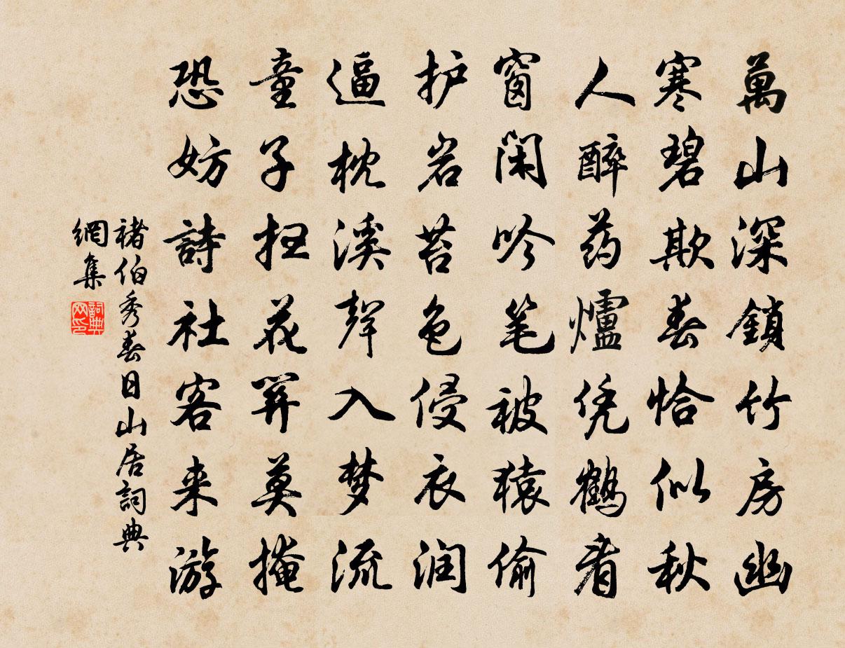 詩詞名句歷史字典書法欣賞書法字典國語詞典說文解字康熙字典古漢語字典標 題 作 者 詩 句 春日山居作者:褚伯秀 朝代:宋代春日山居原文萬山深鎖竹房幽,寒碧欺春恰似秋。人醉藥爐憑鶴看,窗閒吟筆被猿偷。護岩苔色侵衣潤,逼枕溪聲入夢流。童子掃花關莫掩,恐妨詩社客來游。詩詞問答問:春日山居的作者是誰?答:褚伯秀問:春日山居寫於哪個朝代?答:宋代褚伯秀春日山居書法欣賞春日山居書法作品詩詞推薦浪淘沙(贈妓)仲並〔宋代〕趁拍舞初筵。柳裊春煙。街頭桃李莫爭妍。家本鳳樓高處住,錦瑟華年。不用抹繁弦。歌韻天然。天教獨立百花前萬菊軒蘇軾〔宋代〕一軒高為黃花設,富擬人間萬石君。佳本盡從方外得,異香多在月中聞。引泉北澗分清露,開逕南山破白雲。此意軍中雜歌陸游〔宋代〕北庭茫茫秋草枯,正東萬里是皇都。征人樓上看太白,思婦城南迎紫姑。東皋十首晁補之〔宋代〕壁間最好營丘筆,臥看三峰憶舊過。夢入幽林小溪去,絕勝千騎向南柯。壬午二月桃方盛開雪積其上光輝紅潤不可形狀吳儆〔宋代〕粲粲乘鸞萬玉妃,肯將紅艷斗光輝。只應侍宴瑤池罷,猶帶天邊醉色歸。【越調】憑闌人_湖上二首遠張可久〔元代〕湖上二首遠水晴天明落霞,古岸漁村橫釣槎。翠簾沽酒家,畫橋吹柳花。二客同游過虎溪,一徑無塵穿翠微。寸心登縣樓李揆〔宋代〕一水中分南北市,插天蒙末有佳山。太平官府原無事,聊放衰翁半日閒。郊祀慶成詩王炎〔宋代〕燕翼傳丕緒,龍飛襲慶基。萬年新景命,三歲始親祠。修己崇仁儉,承顏洽孝慈。和平調玉燭,靜謐偃鋒旗。九廟次戴帥初與次兒瀹詩陳著〔宋代〕世變紛綠蜂蝶叢,人情落落馬牛風。山林猶喜典刑在,師友相從氣義同。坎有亨心方善處,兌為麗澤要深窮。暮春詠史下王導陳普〔宋代〕漠漠胡塵撲面飛,對人舉扇障元規。九京羞見青衣帝,猶及劉翔未到時。山居詩釋延壽〔宋代〕一生占斷白雲鄉,適意孤風吹草動志自強。報曉音聲棲鳥語,漏春訊息早梅香。吟經徐傍芙蕖岩,得偈閒書薜荔牆靈泉篇釋文珦〔宋代〕高僧誦經經出泉,泉靈不許蛟龍眠。湛湛長開古明鏡,冷冷暗瀉朱絲弦。曾說煮茶甘入齒,為是心源功德水。淵然好事近·搖首出紅塵朱敦儒〔宋代〕搖首出紅塵,醒醉更無時節。活計綠蓑青笠,慣披霜沖雪。晚來風定釣絲閒,上下是新月。千里水天一色,看孤鴻望海潮 學道丘處機〔元代〕神仙風範,長生門戶,從來道德為基。餘外萬般,留心一念,顛狂造作皆非。真教示開迷。自上古軒轅,龍駕齊飛句李宗諤〔宋代〕上饒多勝景,樽酒不應空。蛩聲三首楊萬里〔宋代〕山行我已厭征塵,夜語誰能伴老身。桑有暗蛩同店宿,被渠告訴卻愁人。送劉成伯還都梅堯臣〔宋代〕余昔困川途,今非羨行者。誰心寄南風,相送過平野。既吹蓮葉舟,更逐桂條馬。中州多故人,懷抱幸君寫。題窗間墨竹胡仲弓〔宋代〕一寸毛錐當小鋤,新篁移傍野人居。難棲天上鳴陽鳳,且伴窗前剔蠹魚。大節肯隨風俯仰,數枝長帶月扶疎。此君偈傾一百六十九首釋智朋〔宋代〕坐斷毗盧頂,不稟釋迦文,且在下風。奉和魯望新夏東郊閒泛(一本此下有見懷次韻)皮日休〔唐代〕水物輕明淡似秋,多情才子倚蘭舟。碧莎裳下攜詩草,黃篾樓中掛酒篘。蓮葉蘸波初轉棹,魚兒簇餌未諳鉤。共君名句推薦紫塞門孤,金河月冷,恨誰訴?朱彝尊《長亭怨慢·雁》 佳人亦何念,淒斷陽關曲。蘇軾《送頓起》 鼙鼓動時雷隱隱,獸頭凌處雪微微。盧肇《競渡詩 / 及第後江寧觀競渡寄袁州剌史成應元》 三日入廚下,洗手作羹湯。王建《新嫁娘詞三首》 檳榔無柯,椰葉無陰。左思《三都賦》 從善如順流,去惡如探湯。房玄齡《晉書·列傳·第五十七章》 吠犬雜鳴雞,燈火熒熒歸路迷。納蘭性德《南鄉子·秋暮村居》 鄂王墳上草離離,秋日荒涼石獸危。趙孟頫《岳鄂王墓》 老柘葉黃如嫩樹,寒櫻枝白是狂花。白居易《早冬》 身未升騰思退步,功成應憶去時言。只因先主丁寧後,星落秋風五丈原。羅貫中《三國演義·第三十八回》