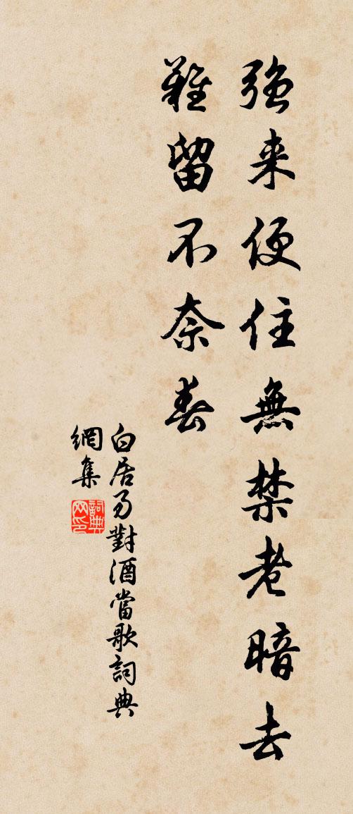 詩詞名句歷史字典書法欣賞書法字典國語詞典說文解字康熙字典古漢語字典標 題 作 者 詩 句 對酒當歌作者:白居易 朝代:唐代對酒當歌原文強來便住無禁老,暗去難留不奈春。 詩詞問答問:對酒當歌的作者是誰?答:白居易問:對酒當歌寫於哪個朝代?答:唐代問:白居易的名句有哪些?答:白居易名句大全白居易對酒當歌書法欣賞對酒當歌書法作品詩詞推薦覽鏡陸游〔宋代〕鏡中老翁誰?非得少年我。誦書如布穀,拈出無一可。又非富貴逼,棄去自不果。無功博一飽,有罪當萬坐。老境次韻杜安行見寄六首郭印〔宋代〕我愛使君直,使君憐我真。短長才自異,勞逸事還均。意在形骸外,人疑手足親。共嗟征賦急,無術濟斯民。永州韋使君新堂記柳宗元〔唐代〕將為穹谷嵁岩淵池於郊邑之中,則必輦山石,溝澗壑,陵絕險阻,疲極人力,乃可以有為也。然而求天作地生之狀寄隰州李九使君晁說之〔宋代〕隰州太守詩來好,何事新詩不寄來。歲暮異鄉思里社,山寒宿雪啟樽罍。數莖白髮何堪照,一寸丹心未肯灰。唯有頌證道歌證道歌釋印肅〔宋代〕體若虛空勿涯岸,通身是口說得半。三種病人也會醫,燈籠露柱常相伴。甲戌冬屬疾賜告二首宋庠〔宋代〕行年三十九,病腦劇中乾。目界空花眩,脾倉宿滓寒。未燈欹夕枕,欲食進朝丸。惟有披書樂,依稀及士安。北湖飽飯徑寢頹然甘甚殆疇昔所未有也作此以吳則禮〔宋代〕讀書聊爾只欲眠,半世浪比邊孝先。白頭來煮阿弓糜,偶然甘寢如許奇。醍醐乳無上味,方我飽眠方掩鼻。諸天種浣溪沙(有感)蘇軾〔宋代〕傅粉郎君又粉奴。莫教施粉與施朱。自然冰玉照香酥。有客能為神女賦,憑君送與雪兒書。夢魂東去覓桑榆。送龐中秀才文同〔宋代〕曼倩學精知蜥蜴,公明術妙識蜘蛛。臨邛復有龐成叔,萬事先將入卦圖。安人鄭氏輓詞樓鑰〔宋代〕勤儉佐家肥,猶齊舉案眉。錦封俱被寵,鸞鑑可勝悲。謝砌森群玉,郄林先一枝。木華文雋麗,銘德粲堂碑。挽王厚齋尚書牟巘五〔宋代〕文獻遺諸老,風霜魯殿余。斯人不可贖,吾道意何如。永念年家好,曾聯選部居。無由陪縞送,東望淚沾裾。贊寂岩忠和尚釋心月〔宋代〕師之出處,師之面顏。雲橫楚甸,雨過淮山。閱其語錄,見其作用。玉轉珠回,雲興泉涌。寂岩之道,莫能形容。次韻林君則惠詩陳藻〔宋代〕湖水當門四面山,旁羅書史坐中間。他人共我何曾有,造物於君本不慳。況是早教緣累少,便知晚與歲時閒。餘糧題潼川倅廳先得月樓魏了翁〔宋代〕濃雲卷羃衡響北,天風不搖萬響息。蟆行爬沙踏科臼,雇菟茫洋長在腹。本來全體自分明,日用其間人莫識。弄丸冬日讀白集愛其貧堅志士節病長高人情之句作陸游〔宋代〕吾常慕昔人,石介與王令;挑燈讀其文,奮起失衰病。吾徒宗六經,崇雅必放鄭。人眾何足雲,少忍待天定。題壁二首福州僧〔宋代〕當初只欲轉頭銜,轉得頭銜轉不堪。何似仁王高閣上,倚欄閒唱望江南。水調歌頭韓淲〔宋代〕新月已如許,我問帶湖梅。人閒題句,贏得浮瀲酒盈杯。落拓豪英滿坐,爛漫風騷連紙,天外鳳凰來。只怕輕孤負減字木蘭花周邦彥〔宋代〕風鬟霧鬢。便覺蓬萊三島近。水秀山明。縹緲仙姿畫不成。廣寒丹桂。豈是夭桃塵俗世。只恐乘風。飛上瓊樓玉宇醉宿慈氏院晨起張耒〔宋代〕痛飲淋漓半夜醒,披衣坐得曉窗明。風松一夕清無限,壚火三更暖有情。孤閣鳴鐘天黯慘,寒山戴雪晚崢嶸。年來自愧李鹹用〔唐代〕多負懸弧禮,危時隱薜蘿。有心明俎豆,無力執干戈。壯士難移節,貞松不改柯。纓塵徒自滿,欲濯待清波。名句推薦志閒而少欲,心安而不懼,形勞而不倦,氣從以順,各從其欲,皆得所願。佚名《黃帝內經·上古天真論》 小住京華,早又是,中秋佳節。秋瑾《滿江紅·小住京華》 博觀而約取,厚積而薄發蘇軾《稼說送張琥》 相顧無相識,長歌懷採薇。王績《野望》 中夜四五嘆,常為大國憂。李白《經亂離後天恩流夜郎憶舊遊書懷贈江夏韋太守良宰》 朔風如解意,容易莫摧殘。崔道融《梅花》 葉開隨足影,花多助重條。陰鏗《雪裡梅花詩》 芳樹籠秦棧,春流繞蜀城。李白《送友人入蜀》 無恆產而有恆心者,惟士為能。孟子《孟子·梁惠王章句上·第八節》 立身成敗,在於所染吳兢《貞觀政要·卷十·論慎終》