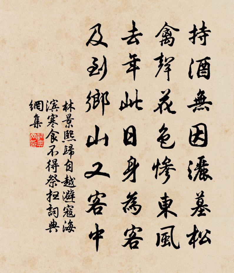 詩詞名句歷史字典書法欣賞書法字典國語詞典說文解字康熙字典古漢語字典標 題 作 者 詩 句 歸自越避寇海濱寒食不得祭掃作者:林景熙 朝代:宋代原文持酒無因灑墓松,禽聲花色慘東風。去年此日身為客,及到鄉山又客中。詩詞問答問:《歸自越避寇海濱寒食不得祭掃》的作者是誰?答:林景熙問:該詩寫於哪個朝代?答:宋代書法欣賞歸自越避寇海濱寒食不得祭掃書法作品詩詞推薦送仲明赴舉李流謙〔宋代〕進退士所重,視天為鼓鉦。採薇北山曲,濯足南澗濱。高風豈不偉,奈何萬蒼黔。道可濟天下,不必丘園尊。先生雨中有懷趙蕃〔宋代〕春風吹雨暗連朝,聞道溪南欲斷橋。忍使碧桃拋密蕊,更堪高柳折輕條。成都舊日空存壁,陋巷歸來只掛瓢。想見敘倫五言二十首劉克莊〔宋代〕堅猛一時雄,猶知有謝公。王郎乳臭子,敢以婿撾翁。金州行衙二首張嵲〔宋代〕灘聲吹浪城邊壯,寒漏鏘金枕畔搖。庭樹不隨群木落,霜風著葉夜蕭蕭。野螺峰陳岩〔宋代〕野螺倒向空中立,迴旋縈成翠甲長。沫霧濡雲真得計,魚蝦舊侶莫相忘。挽湖守吳西林文天祥〔宋代〕傾蓋歲年晚,相知江海深。春天思北樹,夜雨話西林。五嶺生前夢,中原地下心。英雄凋落盡,慷慨一沾襟。行路難滕岑〔宋代〕行路難,東南地傾水瀰漫。三江五湖滄海寬,魚龍出沒肆神奸。萬斛不勞一蹴翻,江水有潮溪有灘。錢塘潮頭平越又嘲武懿宗張元一〔唐代〕裹頭極草草,掠鬢不菶菶。未見桃花麵皮,漫作杏子眼孔。坦老求題真歇宏智竹庵同游雁山酬唱真跡軸後釋紹曇〔宋代〕天生三個老冤魔,狹路相逢沒柰何,□把肚腸摟抉看,曲於四十九盤多。題趙景安二亭尺五二首陳造〔宋代〕坐看銀山卷壞雲,濤頭蜚過不逡巡。世間壯觀何人領,付與亭中筆有神。此日湖源回展叔穎書頗及往歲經行暨諸同志賞王洋〔宋代〕憶昨越溪曲,官梅正發時。追隨連日飲,酬唱幾篇詩。淡佇看人意,清香許自知。憑誰將恨寄,為說鬢成絲。和趙生唐卿師白韻游橫溪孫應時〔宋代〕野橋高竹轉修籬,問訊東風步屧隨。雨過天清水聲急,山長雲白鳥飛遲。從來丘壑多幽興,隨分風流到小詩。一榻次王適韻送張耒赴壽安尉二首蘇轍〔宋代〕魏紅深淺配姚黃,洛水家家自作塘。遊客賈生多感概,閒官白傅足篇章。山分少室雲煙老,宮廢連昌草木長。路出故人亭項安世〔宋代〕翠壁丹崖雲氣浮,故人亭下駐行舟。瀟湘東去連滄海,桂嶺西來接永州。浦樹生煙攢舴艋,岩花覆水叫{左車右勾送褚先生海上尋封鍊師法振〔唐代〕潮落風初定,天吳避客舟。近承三殿旨,欲向五湖游。不厭烏皮幾,新縫鶴氅裘。明珠漂斷岸,陰火映中流。華蓋古意崔國輔〔唐代〕紅荷楚水曲,彪炳爍晨霞。未得兩回摘,秋風吹卻花。時芳不待妾,玉佩無處夸。悔不盛年時,嫁與青樓家。野步十首陳普〔宋代〕南雁數聲嘹唳,西風雙鬢{上髟下監}鬖。病葉夕陽滿樹,斷雲殘雨歸岩。為九華王此山賦寧石鄭起〔宋代〕我謂此山天作石,石不是石人不識。千年野鶴獨見君,石上采芝石上吃。三教陳藻〔宋代〕枉費工夫是學仙,聖門妙處與僧傳。百年合死千年贅,一物都無萬物全。游武夷陳宓〔宋代〕冰溪凜凜九回曲,玉壁岩岩兩面開。舟逆急湍分寸上,奇峰細得看崔嵬。名句推薦山高月小,水落石出。蘇軾《後赤壁賦》 隔座送鉤春酒暖,分曹射覆蠟燈紅。李商隱《無題·昨夜星辰昨夜風》 荒戍落黃葉,浩然離故關。溫庭筠《送人東遊》 畫閣朱樓盡相望,紅桃綠柳垂檐向。王維《洛陽女兒行》 拔劍擊大荒,日收胡馬群。杜甫《後出塞五首》 道生一,一生二,二生三,三生萬物。老子《老子·德經·第四十二章》 相思謾然自苦,算雲煙、過眼總成空。戴復古《木蘭花慢·鶯啼啼不盡》 日暮平沙秋草亂,一雙白鳥避人飛。袁宏道《感事·湘山晴色遠微微》 人悄悄,簾外月朧明。岳飛《小重山·昨夜寒蛩不住鳴》 採蓮南塘秋,蓮花過人頭。佚名《西洲曲》