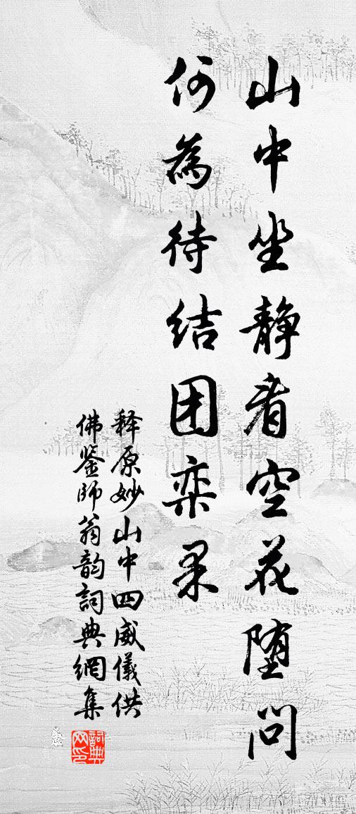 詩詞名句歷史字典書法欣賞書法字典國語詞典說文解字康熙字典古漢語字典標 題 作 者 詩 句 山中四威儀供佛鑒師翁韻作者:釋原妙 朝代:宋代山中四威儀供佛鑒師翁韻原文山中坐,靜看空花墮。問何為,待結團欒果。詩詞問答問:山中四威儀供佛鑒師翁韻的作者是誰?答:釋原妙問:山中四威儀供佛鑒師翁韻寫於哪個朝代?答:宋代釋原妙山中四威儀供佛鑒師翁韻書法欣賞山中四威儀供佛鑒師翁韻書法作品詩詞推薦台頭寺步月得人字蘇軾〔宋代〕風吹河漢掃微雲,步屟中庭月趁人。浥浥爐香初泛夜,離離花影欲搖春。遙知金闕同清景,想見氈車碾暗塵。回首經旬不作詩今日霜晴可喜問梅沈園得兩絕句此趙蕃〔宋代〕自從籬菊報香衰,便說南枝與北枝。底事頻來問訊息,山翁近日絕無詩。次韻和光祿黃少卿學士感恩書事十六韻楊億〔宋代〕江夏毛門風盛,毛東吳族望高。才雄吐白鳳,志大釣靈鼇。昔日參珠履,多年泛碧毛。陳琳巧毛檄,謝客占風騷。元豐二年十月政公改路故作此詩王安石〔宋代〕獨龍東路得平岡,始免遊人屐齒妨。更有主林身半現,與公隨轉作陰涼。答僧拄杖張籍〔唐代〕靈藤為拄杖,白淨色如銀。得自高僧手,將扶病客身。春遊不騎馬,夜會亦呈人。持此歸山去,深宜戴角巾。殺麥二首蘇轍〔宋代〕雨後麥多病,庾中蛾欲飛。不辭終日暑,幸脫半年飢。潦水來何暴,秋田望已微。農夫愚可念,此報定誰非。友人陳槱得楊補之三昧賞之以詩白玉蟾〔宋代〕梅花不清是水清,最是一枝溪上橫。梅花不明是雪明,凍折老梢飄碎瓊。梅花不暗是雨暗,隔籬和雨粘珠糝。梅花挽鄭武子吳芾〔宋代〕中原耆舊久雕零,賴有夫君尚典刑。持節有心吞朔騎,請纓無路報朝廷。壯圖落落嗟難合,末俗紛紛笑獨醒。坐蛻觀隋朝吟邵雍〔宋代〕始謀當日已非臧,又更相承或自戕。蟻螻人民貪土地,泥沙金帛悅姬姜。征遼意思縻荒服,泛汴情懷厭未央。三十沔陽夜行陸游〔宋代〕夜發沔陽驛,坡陀岡阜重。月斜欹帽影,霜重濕裘茸。野岸鳴枯葉,煙林度曉鍾。梁州明日到,一笑解衰容。句高似孫〔宋代〕未教剪初韭,全如持左螯。閒居十首陳造〔宋代〕春來敢自貸衰慵,正要檀樂間白紅。愛竹少留枝策徑,灌花分破著書功。阮郎歸王同祖〔宋代〕一簾疏雨細於塵。春寒愁 * 。桐花庭院近清明。新煙浮舊城。尋蝶夢,怯鶯聲。柳絲如妾情。丙丁帖子畫教成。游下岩寺先是劉寶學約於此相聚既而先進舟遂張嵲〔宋代〕時危適遠縣,臥疴蔽疏篷。浮舟難計程,一聽水與風。今日出江口,劃見天邊峰。維舟邀勝士,杖策凌穹崇。絕壁送劉文潛司業江西漕二首李流謙〔宋代〕百為自叢拿,至理在綿眇。刀硎閟新穎,鏡像蓄遺照。吾心又不然,一士欲矯矯。目送雲端禽,舉觴可以了。處州獻盧員外方乾〔唐代〕才下軺車即歲豐,方知盛德與天通。清聲漸出寰瀛外,喜氣全歸教化中。落地遺金終日在,經年滯獄當時空。直緣鑒堂把酒鄧深〔宋代〕池館媚春華,憑欄午更嘉。日光凝水面,波影炫檐牙。魚出沖浮梗,萍交載落花。半酣拿小艇,落調唱漁家。六言二首贈月蓬道人劉克莊〔宋代〕我與蒙倛相類,君似季鹹而非。老子曾傳口訣,道人勿泄天機。八月五日歌顧況〔唐代〕四月八日明星出,摩耶夫人降前佛。八月五日佳氣新,昭成太后生聖人。開元九年燕公說,奉詔聽置千秋節。丹青太平吟邵雍〔宋代〕天下太平日,人生安樂時。更逢花爛漫,爭忍不開眉。名句推薦君子不以冥冥墮行。張廷玉《明史·列傳·卷三十七》 斬草除根,萌芽不發馮夢龍《警世通言·卷三十七》 江晚正愁予,山深聞鷓鴣。辛棄疾《菩薩蠻·書江西造口壁》 流星透疏木,走月逆行雲。賈島《宿山寺》 九日登高處,群山入望賒。趙時春《原州九日》 問君何能爾?心遠地自偏。陶淵明《飲酒·其五》 送君九月交河北,雪裡題詩淚滿衣。岑參《送崔子還京》 奢者富而不足,何如儉者貧而有餘。洪應明《菜根譚·概論》 士有妒友,則賢交不親。荀子《荀子·大略》 春已歸來,看美人頭上,裊裊春幡。辛棄疾《漢宮春·立春日》
