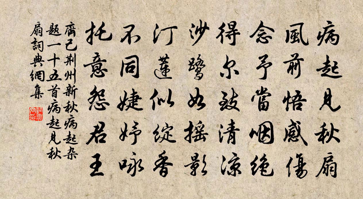 詩詞名句歷史字典書法欣賞書法字典國語詞典說文解字康熙字典古漢語字典標 題 作 者 詩 句 荊州新秋病起雜題一十五首病起見秋扇作者:齊己 朝代:唐代原文病起見秋扇,風前悟感傷。念予當咽絕,得爾致清涼。沙鷺如搖影,汀蓮似綻香。不同婕妤詠,托意怨君王。詩詞問答問:《荊州新秋病起雜題一十五首病起見秋扇》的作者是誰?答:齊己問:該詩寫於哪個朝代?答:唐代問:齊己的名句有哪些?答:齊己名句大全書法欣賞荊州新秋病起雜題一十五首病起見秋扇書法作品注釋全唐詩:卷842-38詩詞推薦離臨安黃公度〔宋代〕細雨出江城,潮回江正清。未能捐俗累,不敢憚嚴程。落日行人少,空山獨鳥鳴。離愁似春草,觸處便能生。新秋往來湖山間陸游〔宋代〕健席高檣梅市路,朱橋綠樹蘭亭步。兒時釣游略可記,不料耄年猶此處。漁歌相和葦間起,菱船遠入煙中去。世間登峴亭懷孟生施肩吾〔唐代〕峴山自高水自綠,後輩詞人心眼俗。鹿門才子不再生,怪景幽奇無管屬。啄木行贈淨珇上人戴表元〔宋代〕東園嘹嘹山剝剝,有鳥晨飢啄霜木。天寒蟲豸得幾何,爪觜披猖良為腹。華堂蝙蝠添毛衣,飛蟻淨盡何處歸。海山江南五首劉克莊〔宋代〕宣勸猶疑鴆,龍顏笑引觴。絡鞍奉明主,執梃長降王。代結客少年場行鮑照〔南北朝〕驄馬帶金絡頭帶。錦帶佩吳鉤。失意杯帶間。 * 起相讎。追兵一旦至。負劍遠行游。去鄉三十載。復得還舊丘。贈孫仙輩陳杰〔宋代〕株峰紫翟邊,仙已住三年。手有屠龍枝,腰無跨鶴錢。地圖藏尚秘,山屐著多穿。笑指青囊道,人家要福田。次前韻二首陳著〔宋代〕竹溪詩筆幾曾乾,遺我新詩照眼寒。不用尋梅霜月底,只將詩句作梅看。鶯鳴十章寄戚伯瑞彭龜年〔宋代〕靜觀物理,式感我思。有風淒兮,吹我裳衣。蝶戀花王采〔宋代〕穠艷嬌春春婉娩。雨惜風饒,學得宮妝淺。愛把綠眉都不展。無言脈脈情何限。花下當時紅粉面。準擬新年,都向題泖居殷澄〔宋代〕國破不共天,軍行卻掃地。一言活萬人,三泖終吾志。雜曲歌辭。鳴雁行鮑溶〔唐代〕七月朔方雁心苦,聯影翻空落南土。八月江南陰復晴,浮雲繞天難夜行。羽翼勞痛心虛驚,一聲相呼百處鳴。楚童夜行船石孝友〔宋代〕昨日特承傳誨。欲相見、奈何無計。這場煩惱捻著嚎,曉夜價、求天祝地。教俺兩下不存濟。你莫卻、信人調戲。知玄武縣薛秘丞繼示手書因以謝魏野〔宋代〕到想行仁政,民間豈復言。冤思雪蜀魄,哀欲吊巴猿。山水州城僻,煙嵐路徑昏。遙思上事日,正值海棠溫。劉伶巷陳煒〔宋代〕有酒宜成頌,知君恥獨醒。回車經巷口,荷鍤信丘冥。死豈人埋得,言獨婦可聽。閉關當日飲,想像只忘形。前漢門條侯周曇〔唐代〕上將風戈賞罰明,矛鋋嚴閉亞夫營。人君卻稟將軍令,按轡垂鞭為緩行。久雨釋永頤〔宋代〕山房十日雨,仰棟持行蝸。筍暗風庭竹,萱凝晚砌花。罌紅留夕火,焙綠薦春芽。滴滴西窗下,清泉滿石窪。送劉孟卿游天台雁盪二山黃庶〔宋代〕治源先生高七十,山水病僻不可瘳。灶無炊煙不顧計,窮幽極怪如仇讎。有時清風明月對景,霹靂拔卻大樹不回頭秋興丘葵〔宋代〕千年成改事悠悠,獨眺川原滿目秋。底處歸航來遠浦,何人吹笛倚高樓。山和疊疊寒雲迥,水帶瀟瀟暮雨流。回首五月十九日大雨劉基〔明代〕風驅急雨灑高城,雲壓輕雷殷地聲。雨過不知龍去處,一池草色萬蛙鳴。名句推薦孤舟蓑笠翁,獨釣寒江雪。柳宗元《江雪》 春風春雨花經眼,江北江南水拍天。黃庭堅《次元明韻寄子由》 日暮九疑何處?認舜祠叢竹。文廷式《好事近·湘舟有作》 斷送落花三月雨,摧殘楊柳九秋霜。施耐庵《水滸傳·第十六回》 家貧出孝子,國亂顯忠臣!佚名《增廣賢文·下集》 得即高歌失即休,多愁多恨亦悠悠。羅隱《自遣》 晴風初破凍,柳眼梅腮,已覺春心動。李清照《蝶戀花·暖雨晴風初破凍》 四月南風大麥黃,棗花未落桐葉長。李頎《送陳章甫》 傍鄰聞者多嘆息,遠客思鄉皆淚垂。李頎《聽安萬善吹觱篥歌》 龍馬花雪毛,金鞍五陵豪。李白《白馬篇》