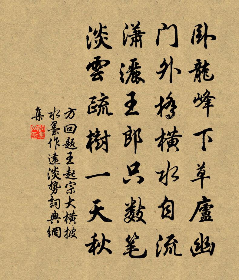 詩詞名句歷史字典書法欣賞書法字典國語詞典說文解字康熙字典古漢語字典標 題 作 者 詩 句 題王起宗大橫披水墨作遠淡勢作者:方回 朝代:宋代原文臥龍峰下草廬幽,門外橋橫水自流。瀟灑王郎只數筆,淡雲疏樹一天秋。詩詞問答問:《題王起宗大橫披水墨作遠淡勢》的作者是誰?答:方回問:該詩寫於哪個朝代?答:宋代書法欣賞題王起宗大橫披水墨作遠淡勢書法作品詩詞推薦暮雪四錫〔宋代〕北風慘慘生微雪,微雪片片皆橫飛。梅花柳絮隨人歸,黃雲千里凝無輝。唯念蓬蒿何處客,緼袍不暖飢且羸。乞彩箋歌韋莊〔唐代〕浣花溪上如花客,綠闇紅 * 不識。留得溪頭瑟瑟波,潑成紙上猩猩色。手把金刀擘彩雲,有時剪破秋天碧。不使塞上曲裴說〔唐代〕極目望空闊,馬羸程又賒。月生方見樹,風定始無沙。楚水辭魚窟,燕山到雁家。如斯名利役,爭不老天涯。和象之河上見懷之作韓維〔宋代〕一昨芳郊祖畫輪,索居南北對殘春。忽傳河上相望意,未覺庵中獨處人。幾有高懷投紱冕,尚緣微祿走風塵。世間暇日過在伯因而留飯趙蕃〔宋代〕身在山中不見山,興來騎馬到江乾。幽憂本藉登臨釋,逼仄還因笑語寬。半歲相從終歲別,束書可作素書看。我雖過餘杭白塔寺范仲淹〔宋代〕登臨江上寺,遷客特依依。遠水欲無際,孤舟曾未歸。亂峰藏好處,幽鷺得閒飛。多少天真趣,遙心結翠微。次鄭丈韻又一小詩代簡王洋〔宋代〕籬間殘菊舊令尹,霜後古柏嚴諸侯。梅花若不報春信,誰表東風第一流。七夕宴懸圃二首崔顥〔唐代〕長安城中月如練,家家此時持針線。仙裙玉佩空自知,天上人間不相見。長信深陰夜轉幽,瑤階金閣數螢流。班姬踏莎行倪瓚〔元代〕春渚芹蒲,秋郊梨棗。西風沃野收紅稻。檐前炙背媚晴陽,天涯轉瞬萋芳草。魯望漁村,陶朱煙島。高風峻節如今臨江仙(勸酒)史浩〔宋代〕自古聖賢皆寂寞,只教飲者留名。萬花叢里酒如澠。池台仍舊貫,歌管有新聲。欲識醉鄉真樂地,全勝方丈蓬瀛。晚臥張耒〔宋代〕日落煩暑退,秋晴河漢明。微雲映天白,纖月過林清。獨臥誰晤語,幽懷殊未平。蕭蕭夜深冷,皓露滿前楹。天開圖畫亭王正已〔宋代〕夜來殘暑鏖西風,秋聲摵摵先井桐。纖雲四卷天開容。一碧萬里磨青銅。使君退食新涼逢,厭看凝寢江雲深。領客耕翁森〔宋代〕村北村南叫杜鵑,簑披春雨柳含煙。不辭辛苦秋成熟,會見黃雲遍野田。重九以棘糕餉孫司戶項安世〔宋代〕滿城風雨近重陽,應為征廛墮渺茫。要看詩來壓奇字,試拈公案示孫郎。茸山道中感懷范成大〔宋代〕侍臣筆裹舊西班,大將麾幢又百蠻。掛席南箕宿昔事,閃旗東井何時還,日增衰病復一日,山隔舊遊知幾山?倦拂贈呂縣丞葉適〔宋代〕自得長官後,邑人詩轉工。批書月屢滿,覓薦歲常空。柳已如藍碧,桃元勝錦紅。終歸剡溪上,舉棹謝東風。立春杜甫〔唐代〕春日春盤細生菜,忽憶兩京梅發時。盤出高門行白玉,菜傳縴手送青絲。巫峽寒江那對眼,杜陵遠客不勝悲。此身夏日十二首張耒〔宋代〕夜色川原合,秋聲草木催。星辰隨地闊,河漢寫山來。棲鶴涼先警,飢烏夕未回。高樓對斜月。高樓對斜月,鳴笛太平州趙竹屋〔宋代〕拍欄一笑大江橫,號太平州亦浪名。春水秋濤流不盡,半年農事半年兵。送人化修上釋慧空〔宋代〕爾祖傳家唯此缽,中雖無物不憂貧。持從鬧市門頭過,倒廩傾囷自有人。名句推薦滄海月明珠有淚,藍田日暖玉生煙。李商隱《錦瑟》 浩蕩離愁白日斜,吟鞭東指即天涯。龔自珍《己亥雜詩·其五》 親朋無一字,老病有孤舟。杜甫《登岳陽樓》 孰知不向邊庭苦,縱死猶聞俠骨香。王維《少年行四首》 迢遞路回清野,人語漸無聞,空帶愁歸周邦彥《夜飛鵲·河橋送人處》 不誘於譽,不恐於誹。荀子《荀子·非十二子》 如來不應以具足諸相見。鳩摩羅什譯《金剛經·離色離相》 蘇小門前柳萬條,毿毿金線拂平橋。溫庭筠《楊柳八首·其三》 土膏欲動雨頻催,萬草千花一餉開;范成大《春日田園雜興》 走馬西來欲到天,辭家見月兩回圓。岑參《磧中作》