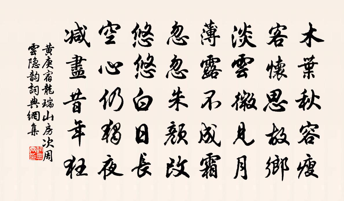 詩詞名句歷史字典書法欣賞書法字典國語詞典說文解字康熙字典古漢語字典標 題 作 者 詩 句 宿龍瑞山房次周雲隱韻作者:黃庚 朝代:宋代宿龍瑞山房次周雲隱韻原文木葉秋容瘦,客懷思故鄉。淡雲微見月,薄露不成霜。忽忽朱顏改,悠悠白日長。空心仍獨夜,減盡昔年狂。詩詞問答問:宿龍瑞山房次周雲隱韻的作者是誰?答:黃庚問:宿龍瑞山房次周雲隱韻寫於哪個朝代?答:宋代黃庚宿龍瑞山房次周雲隱韻書法欣賞宿龍瑞山房次周雲隱韻書法作品詩詞推薦梓栗杖送人齊己〔唐代〕禪家何物贈分襟,只有天台杖一尋。拄去客歸青洛遠,采來僧入白雲深。游山曾把探龍穴,出世期將指佛心。此日頌古五十五首釋紹曇〔宋代〕勢罷奴欺主,年衰鬼弄人。南泉招致得,冷淚濕衣巾。次韻子瞻和陶公止酒蘇轍〔宋代〕少年無大過,臨老重複止。自言衰病根,死在酒杯里。今年各南遷,百事付諸子。誰言瘴霧中,乃有相逢喜。連床郊外閱驍騎剪柳范成大〔宋代〕千騎同瞻白羽揮,驚塵一哄響金鞿。不知掣電彎弓過,但覺柳梢隨箭飛。次韻高子勉十首黃庭堅〔宋代〕鑿開混沌竅,窺見伏羲心。有物先天地,含生盡陸沈。伐山成大廈,鼓橐鑄祥金。三尺無弦木,期君發至音。南昌道中陳陶〔唐代〕古道夤緣蔓黃葛,桓伊冢西春水闊。村翁莫倚橫浦罾,一半魚蝦屬鵜獺。石床峰汪珍〔元代〕常約高僧訪上方,峰頭老樹掛斜陽。仙翁何處歸來晚,風落松花滿石床。贈宗周賓劉子翬〔宋代〕我車南,君車北,相逢總是天涯客。擁爐談笑一燈殘,出門風雨千山隔。觀瀑圖唐寅〔明代〕一派銀河傾碧落,耳根於此洗塵囂。要知盡日支吾處,五老峰前三峽橋。過虎頭狼尾灘避險出陸到譚晉仲故居有謝公昌魏了翁〔宋代〕尚記翩然下帝傍,七年才入屈公鄉。山銜西日去家近,風遞北氛吹袂涼。新事感傷心力短,舊交零落話頭長。況堪短歌寄鼓山長老齊己〔唐代〕雪峰雪峰高且雄,峨峨堆積青冥中。六月赤日燒不熔,飛禽瞥見人難通。常聞中有白象王,五百象子皆威光。行圍三月二十一日泛舟十絕劉克莊〔宋代〕弟兄玉映更珠聯,豈減玄暉與惠連。卻笑漠人無具眼,羨它李郭作神仙。晚發傅察〔宋代〕理棹頻看溪水分,岸移不覺轉孤村。漁翁醉臥灘沙穩,樵子行歌岸草昏。白鷺成行低欲落,清蟬無數斷還聞。自將落花白居易〔唐代〕留春春不住,春歸人寂寞。厭風風不定,風起花蕭索。既興風前嘆,重命花下酌。勸君嘗綠醅,教人拾紅萼。桃飄郊廟歌辭享惠昭太子廟樂章請神歸登〔唐代〕嘉薦既陳,祀事孔明。閒歌在堂,萬舞在庭。外則盡物,內則盡誠。鳳笙如聞,歌其潔精。次韻武伯姜夔〔宋代〕楊柳風微約暮寒,野禽容與只婆間。道人心性如天馬,可愛青絲十二閒。秋浦歌十七首·十五李白〔唐代〕白髮三千丈,緣愁似個長。不知明鏡里,何處得秋霜。洞仙歌朱彝尊〔清代〕花糕九日,綴蠻王獅子。圓菊金鈴鬢邊媚。向閒房密約,三五須來,也不用青雀先期飛至。恩深容易怨,釋怨成歡夜行船劉一止〔宋代〕十頃疏梅開半就。折芳條、嫩香沾袖。今度何郎,尊前疑怪,花共那人俱瘦。惻惻輕寒吹散酒。高城近、怕聽更漏諸友遲留待雪再用韻李曾伯〔宋代〕護風須飲劇,待雪拚眠遲。舉席俱佳客,揮毫盡好詩。冷薌梅畔覺,清響竹間知。莫憶征鞍夢,從渠月下支。名句推薦白水滿春塘,旅雁每迥翔。沈約《詠湖中雁》 懷君屬秋夜,散步詠涼天。韋應物《秋夜寄邱員外 / 秋夜寄丘二十二員外》 絕聖棄智,民利百倍;絕仁棄義,民復孝慈;絕巧棄利,盜賊無有。老子《老子·道經·第十九章》 春潮帶雨晚來急,野渡無人舟自橫。韋應物《滁州西澗》 利天下者,天下啟之;害天下者,天下閉之。姜子牙《六韜·武韜·發啟》 舒捲江山圖畫,應答龍魚悲嘯,不暇顧詩愁。楊炎正《水調歌頭·登多景樓》 台榭空濛煙柳暗,白鳥銜魚欲舞。納蘭性德《摸魚兒·午日雨眺》 黃昏寒立更披襟,露浥清香悅道心。司空圖《白菊雜書四首》 徒把金戈挽落暉,南冠無奈北風吹。虞集《挽文丞相》 與朋友論學,須委曲謙下,寬以居之。王陽明《傳習錄·卷下·門人陳九川錄》