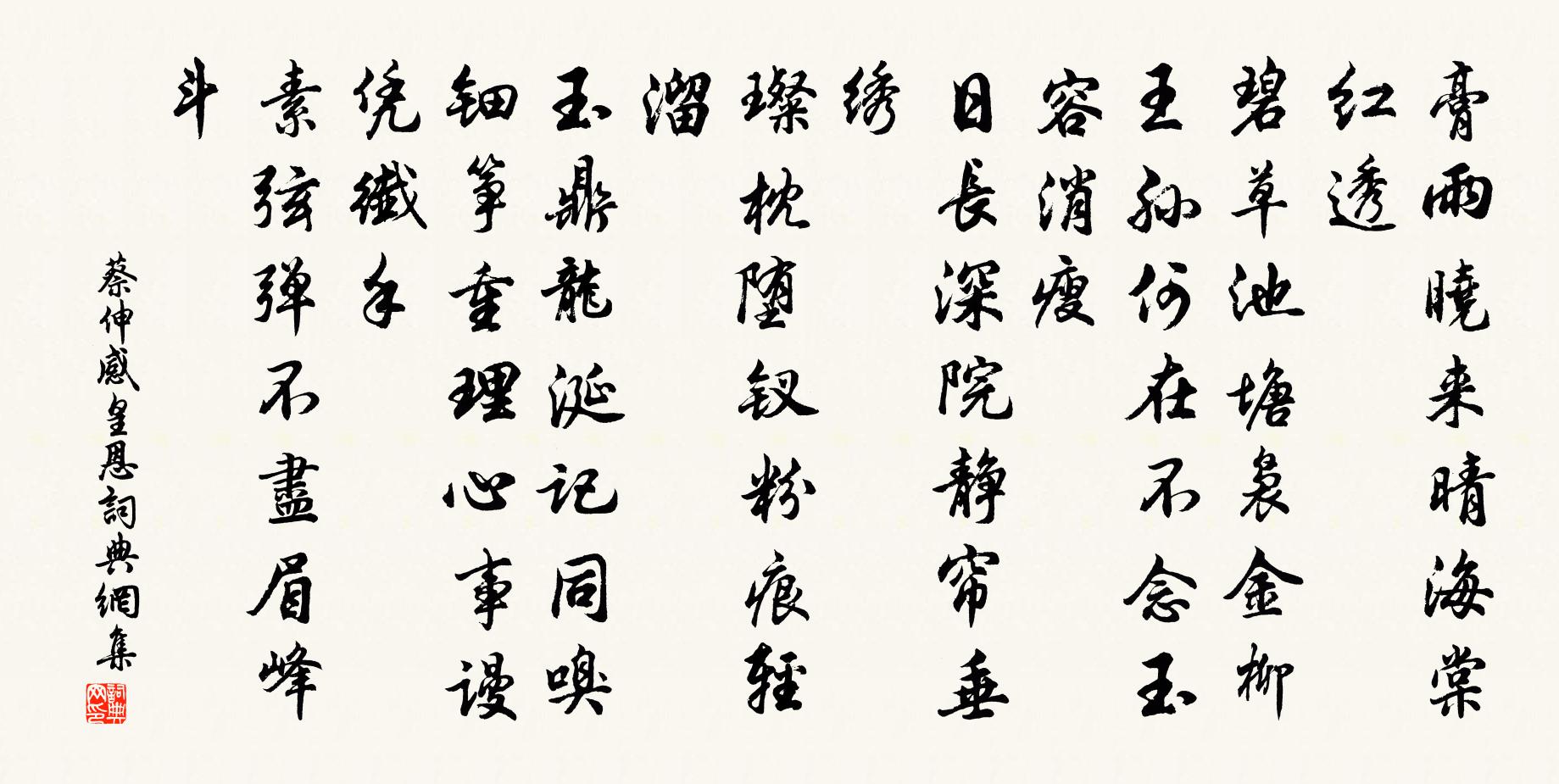 詩詞名句歷史字典書法欣賞書法字典國語詞典說文解字康熙字典古漢語字典標 題 作 者 詩 句 感皇恩作者:蔡伸 朝代:宋代感皇恩原文膏雨曉來晴,海棠紅透。碧草池塘裊金柳。王孫何在,不念玉容消瘦。日長深院靜,簾垂繡。璨枕墮釵,粉痕輕溜。玉鼎龍涎記同嗅。鈿箏重理,心事謾憑縴手。素弦彈不盡,眉峰斗。詩詞問答問:感皇恩的作者是誰?答:蔡伸問:感皇恩寫於哪個朝代?答:宋代問:感皇恩是什麼體裁?答:詞蔡伸感皇恩書法欣賞感皇恩書法作品詩詞推薦尉遲杯(亳社作惜花)晁補之〔宋代〕去年時。正愁絕,過卻紅杏飛。沈吟杏子青時。追悔負好花枝。今年又春到,傍小闌、日日數花期。花有信,人卻探梅陳杰〔宋代〕要識梅孤絕,花於未葉時。玲瓏寒玉片,點綴古銅枝。初雪落旄節,始刪無傳詩。東風一吹綠,萬卉更能奇。題十三弟竹園劉言史〔唐代〕繞屋扶疏聳翠莖,苔滋粉漾有幽情。丹陽萬戶春光靜,獨自君家秋雨聲。程倅春行汪若容〔宋代〕綠楊芳草正留連,急雨催詩濕錦韉。野花不知行樂意,背人無語自耕田。菩薩蠻(賦玉蕊花)史達祖〔宋代〕唐昌觀里東風軟。齊王宮外芳名遠。桂子典刑邊。梅花伯仲間。籠茸鎪暖雪。瑣細雕晴月。誰駕七香車。綠雲飛玉上巳文天祥〔宋代〕昔自長淮樹去帆,今從燕薊眺東南。泥沙一命九分九,風雨六年三月三。地下故人那可作,天涯遊子竟何堪。便從題一上人經閣貫休〔唐代〕鳥外何須去,衣如蘚亦從。但能無一事,即是住孤峰。雨歇雲埋閣,月明霜灑松。師心多似我,所以訪師重。次韻和玉汝對月見懷西軒梅堯臣〔宋代〕坐見沙頭月,復憐衣上輝。正如從我飲,還欲照君歸。相逐影徒是,共嗟歡已非。夜深依岸落,寒色入傷違。斷碑顧逢〔宋代〕此地何時立,相傳歲月多。僅留殘刻在,免得後人磨。剝處補蒼蘚,斷痕穿細莎。欲知前代事,幾度讀來訛。讀書陸游〔宋代〕放翁白首歸剡曲,寂寞衡門書滿屋。藜羹麥飯冷不嘗,要足平生五車讀。校讎心苦謹塗乙,吟諷聲悲雜歌哭。三蒼弔鶴集詩句汪宗臣〔宋代〕有鶴在林,翽翽其鳴。風所漂搖,求其友生。不狩不獵,麾之以肱。宛其死矣,寧莫之懲。英英白雲,毋金玉爾音謁虞帝祠胡宏〔宋代〕有姚心妙賛乾坤,堯禹興亡賴兩存。蒲坂舊都西望遠,蒼梧陳跡事誰論。九官效職群英聚,二女宜家聖德尊。萬代檄途寄翁靈舒徐璣〔宋代〕聞道長溪令,相當一館閒。便令全過舍,尚隔幾重山。為旅春郊外,懷人夜雨間。年來疏覽鏡,怕見減朱顏。是夕有懷斯遠二首趙蕃〔宋代〕沙如星射水流光,憶著南山步石樑。秋興日來知幾首,可無南落雁成行。閒燕堂聯句秦觀〔宋代〕黃葉山頭初帶雪,綠波尊酒暫回春。已聞璧月瓊枝句,更看朝雲暮雨人。老醜紅妝翻曲妙,喜逢佳客放懷新。天明黃鶴洞中仙 在金蓮堂,每自唱此詞,須自頂王哲〔元代〕初見青鋼劍。屍內曾加點。木上安來出一絲,乾馬占。害後隨風。得此修行漸。日日頻頻檢。暗喜歡時只自知,贈念經僧周朴〔唐代〕庵前古折碑,夜靜念經時。月皎海霞散,露濃山草垂。鬼聞拋故冢,禽聽離寒枝。想得天花墜,馨香拂白眉。臨江仙(和陳憲使韻)劉塤〔宋代〕朔雪驅將殘臘去,東風放出新晴。繡衣瑞彩照岩城。江天收宿靄,湖水動春聲。要淨狐嗥並鱔舞,未煩鶴怨猿驚。和柳子玉官舍十首之思山齋黃庭堅〔宋代〕吳兒心著吳山深,滿目終南不開慰。有時蟬蛻書幾邊,夢到五湖千里外。送馮卿歸無錫王遂〔宋代〕浮雲出處泊無情,來輒成違去輒明。解後一時如失計,崢嶸千古卻收名。靜修香火寧非願,歸對漁樵更覺榮。旋汲名句推薦新年都未有芳華,二月初驚見草芽。韓愈《春雪》 青春花姊不同時。淒涼生較遲。吳文英《醉桃源·芙蓉》 美人慵翦上元燈,彈淚倚瑤瑟。朱敦儒《好事近·春雨細如塵》 強整繡衾,獨掩朱扉,枕簟為誰鋪設。阮逸女《花心動·春詞》 若有知音見采,不辭遍唱陽春。晏殊《山亭柳·贈歌者》 上林訊息好,鴻雁已歸來。張元乾《臨江仙·送宇文德和被召赴行在所》 不患寡而患不均,不患貧而患不安。蓋均無貧,和無寡,安無傾。孔子弟子《論語·季氏篇》 朝騁騖兮江皋,夕弭節兮北渚;屈原《九歌》 遺民淚盡胡塵里,南望王師又一年。陸游《秋夜將曉出籬門迎涼有感》 宜未雨而綢繆,毋臨渴而掘井。朱柏廬《朱子家訓·全文》