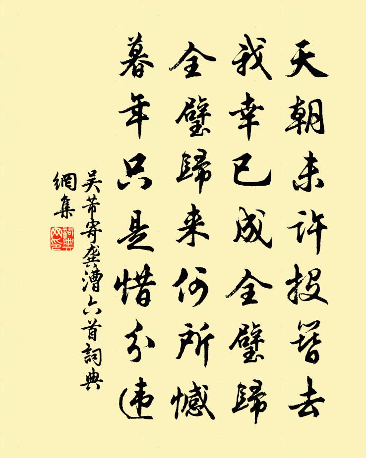 詩詞名句歷史字典書法欣賞書法字典國語詞典說文解字康熙字典古漢語字典標 題 作 者 詩 句 寄龔漕六首作者:吳芾 朝代:宋代寄龔漕六首原文天朝未許投簪去,我幸已成全璧歸。全璧歸來何所憾,暮年只是惜分違。詩詞問答問:寄龔漕六首的作者是誰?答:吳芾問:寄龔漕六首寫於哪個朝代?答:宋代吳芾寄龔漕六首書法欣賞寄龔漕六首書法作品詩詞推薦詠史上審配陳珪陳普〔宋代〕元龍父子二人耳,賢於曹公十萬師。呂布就擒公路死,都在勸回新婦時。睡起鄭剛中〔宋代〕雨過雲深竹屋低,老人睡起亦多時。風飄嫩竹侵檐入,手挽竹梢題小詩。過靈泉寺姚合〔唐代〕偶尋靈跡去,幽逕入氳氛。轉壑驚飛鳥,穿山踏亂雲。水從岩下落,溪向寺前分。釋子游何處,空堂日漸曛。戲酬惟賞上人裴夷直〔唐代〕師是浮雲無著身,我居塵網敢相親。應從海上秋風便,偶自飛來不為人。久晴喜雨詩衛宗武〔宋代〕日夕庚暑袢,無以袪熱惱。甘霔從何來,雷轟電光繞。熱如天潢翻,滂流浹清曉。六合開新宇,一氣蘇群槁。涼颸餞江東繡使庸齋趙玉堂二首徐元傑〔宋代〕天上玉堂辭寵榮,卻持玉節按江城。惟刑之恤民不悅,不怒而威吏膽驚。有腳春來陶化日,無心雲出雨蒼生。箇中演雅十章張至龍〔宋代〕猩猩隕機穽,鸚鵡鏁金籠。言笑適為累,緘嘿斯保躬。悼室人詩江淹〔南北朝〕駕言出遊衍。冀以滌心胸。復值煙雨散。清陰帶山濃。素沙匝廣岸。雄虹冠尖峯。出風舞森桂。落日曖圓松。還結為黃仲宣賦山中四章章四句方回〔宋代〕子疏於蹻,朋來其學。彼惡知茲,山中之樂。滿江紅 金陵懷古薩都剌〔元代〕六代豪華,春去也,更無訊息。空悵望,山川形勝,已非疇昔。王謝堂前雙燕子,烏衣巷口曾相識。聽夜深寂寞打蒙知府寵示秋日郡圃佳制遂侍杖屨逍遙林水間陳與義〔宋代〕歲月移文外,乾坤杖屨中。鏗然五字律,健在百夫雄。秋入池深碧,寒欺葉遞紅。此間兼吏隱,端不減游嵩。即事二首陳杰〔宋代〕扁舟小系畫闌西,萬里晴光一拄頤。湖面俗包天外去,嶠鬟疑割海中來。高空自瀉軒皇樂,元氣長涵杜老詩。慶曆病中雜興五言十首劉克莊〔宋代〕李廣飛將軍,世南行秘書。乃知數寸管,不及丈二殳。再代和通字韻釋紹嵩〔宋代〕驛路穿林斷復通,客程蛇繞亂山中。三杯軟飽千林暝,萬事從來一笑空。珍重故人相問意,自憐羈客尚飄蓬。江湖卜運算元劉秉忠〔元代〕曉角才初弄。驚覺幽人夢。珠壓花梢的的圓,春露昨宵重。小鼎香浮動。閒把新詩誦。坐客同嘗碧月團,擘破雙飛題金州西園九首藥堂姚合〔唐代〕僮僕不到閾,雙扉常自關。四壁畫遠水,堂前聳秋山。時聞有仙鼠,竊藥檐隙間。田家紀事舒岳祥〔宋代〕蒙蒙土霧連三日,父老傳經十七年。蠶月人家多忌諱,麥秋時候好安眠。桑鳩逐婦應嫌雨,社燕依人不避煙。短策贈外龍輔〔宋代〕遠別當霜雪,留郎且過冬。只愁春色里,離恨更重重。沁園春(和趙司戶紅藥)方岳〔宋代〕把酒問花,繭栗梢頭,春今幾何。笑身居近侍,階翻萬玉,面丐菩薩,髻擁千螺。一一牙籤,英英碧字,占定花間郊廟歌辭。享太廟樂章。大成舞張說〔唐代〕帝舞季歷,龍聖生昌。後歌有蟜,胎炎孕黃。天地合德,日月齊光。肅雍孝享,祚我萬方。名句推薦白狼河北音書斷,丹鳳城南秋夜長。沈佺期《古意呈補闕喬知之 / 古意 / 獨不見》 江山如畫,一時多少豪傑蘇軾《念奴嬌·赤壁懷古》 萬里想龍沙,泣孤臣吳越張元乾《石州慢·己酉秋吳興舟中作》 淡黃楊柳暗棲鴉。玉人和月摘梅花。賀鑄《減字浣溪沙·樓角初銷一縷霞》 回日樓台非甲帳,去時冠劍是丁年溫庭筠《蘇武廟》 野花不種年年有,煩惱無根日日生。馮夢龍《警世通言·卷二十》 嘆隙中駒,石中火,夢中身。蘇軾《行香子·述懷》 林鶯啼到無聲處,青草池塘獨聽蛙。曹豳《春暮·門外無人問落花》 記取西湖西畔,正暮山好處,空翠煙霏。蘇軾《八聲甘州·寄參寥子》 美人自古如名將,不許人間見白頭。袁枚《隨園詩話·卷四》