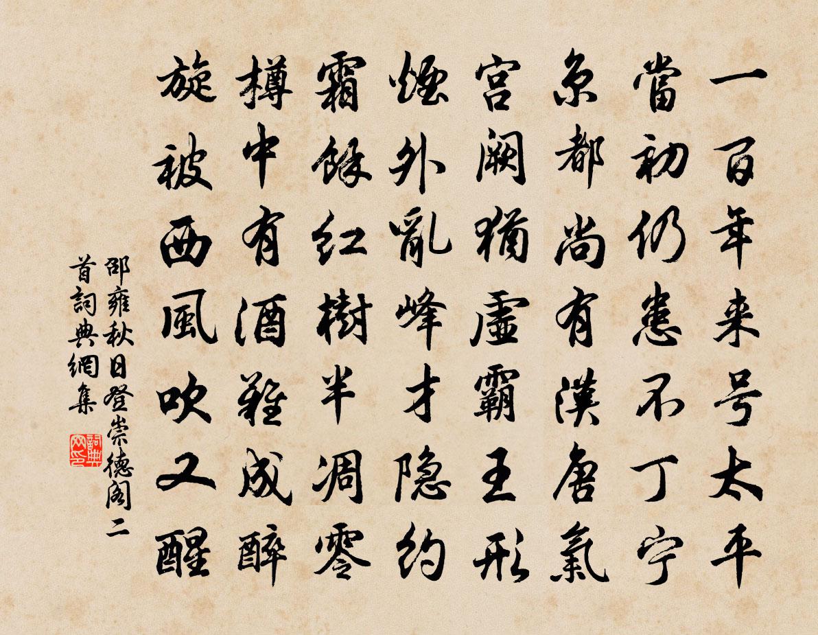 詩詞名句歷史字典書法欣賞書法字典國語詞典說文解字康熙字典古漢語字典標 題 作 者 詩 句 秋日登崇德閣二首作者:邵雍 朝代:宋代秋日登崇德閣二首原文一百年來號太平,當初仍患不丁寧。京都尚有漢唐氣,宮闕猶虛霸王形。煙外亂峰才隱約,霜餘紅樹半凋零。樽中有酒難成醉,旋被西風吹又醒。詩詞問答問:秋日登崇德閣二首的作者是誰?答:邵雍問:秋日登崇德閣二首寫於哪個朝代?答:宋代邵雍秋日登崇德閣二首書法欣賞秋日登崇德閣二首書法作品詩詞推薦答弘農故吏民詩孫楚〔魏晉〕昔我先侯。邁德垂化。康哉之詠。實由良佐。惟余忝辱。弗克負荷。每歷貴邦。仰瞻泰華。追慕先軌。感想哀嗟。句龐清孫〔宋代〕當時若為蒼生出,安得雲溪不朽名。郊廟朝會歌辭紹熙元年恭上壽星聖皇太后至尊佚名〔宋代〕坤德益崇,天壽平格。慶流萬世,子孫千億。刻玉范玉,鋪張赫奕。惟昔妾任,則莫我匹。走筆次韻察推見別二篇蘇頌〔宋代〕行藏無意但隨時,不為人知我者稀。角殼蝸牛初就舍,馴鷗海客已忘機。緘收捲軸塵生蠹,合和丹丸醭有衣。久冒陪閻安撫觀開漕河項安世〔宋代〕為民行水不妨農,為國憂民不費公。肯趁好天招惡客,能於舊貫立新功。山頭石埭千年計,海上靈查八月通,只恐睡起行北園吳潛〔宋代〕睡起卸冠簪,園行獨自吟。山昏知雨到,樹密覺春深。竹外童相報,門前客見尋。歸來即敗意,誰者是知心。許旌陽故宅白玉蟾〔宋代〕詩多唐代刻,柏尚晉時青。想得真君劍,猶余蛟血腥。赴撫州對酬崔法曹夜雨滴空階五首戴叔倫〔唐代〕雨落濕孤客,心驚比棲鳥。空階夜滴繁,相亂應到曉。高會棗樹宅,清言蓮社僧。兩鄉同夜雨,旅館又無燈。謗議峽內三絕句項安世〔宋代〕峽內居人種石田,種成蔔瓠待江船。船頭老嫗悲聲甚,只博茶監不博錢。浣溪沙(和蔣丞端午競渡)李彌遜〔宋代〕簫鼓哀吟樂楚臣。牙檣錦纜簇江D54E。調高彩筆逞尖新。海角逢時傷老大,莫辭卮酒話情親。與君同是異鄉人寄郭仲微宋祁〔宋代〕自君入佐張蒼計,直室深扃老氏關。顧我偶陪螭陛立,無人並駕鹿車還。紅牙幹利資良畫,縹帙勞功積厚顏。幾日新栽松齊己〔唐代〕野僧教種法,苒苒出蓬蒿。百歲催人老,千年待爾高。靜宜兼竹石,幽合近猿猱。他日成陰後,秋風吹海濤。寄豫章李明府蒲壽宬〔宋代〕太白搖芒芒,只在西山陽。常言欲千里,一夜千里長。酒盡還磊磈,出匣鳴干將。蘭菊猶有秋,白日安可量。午坐范成大〔宋代〕晴霄垂北窗,臥我翠幄中。不知幾斧鑿,成此太虛空。前雲稍過盡,後雲來無窮。鳥雀有底忙,激彈過牆東。不如九月十六日出郡登舟如錢塘十七日舟中雜興汪莘〔宋代〕落日扁舟萬古心,半山明耀半溪陰。漁鹽商賈都來往,縱有客星何處尋。將至徽川道中花李彌遜〔宋代〕平生愛山老山間,行山怕盡去復還。茲游深入眾山囿,一日看盡平生山。頗聞黃山最奇秀,紫翠六六堆孱顏。端如薔薇正開春酒初熟因招劉十九張大夫崔二十四同飲白居易〔唐代〕瓮頭竹葉經春熟,階底薔薇入夏開。似火淺深紅壓架,似餳氣味律粘台。試將詩句相招去,倘有風情或可來?明日卜居白龜池上仇遠〔宋代〕一琴一鶴小生涯,陋巷深居幾歲華。為愛西湖來卜隱,卻憐東野又移家。荒城雨滑難騎馬,小市天明已賣花。阿母題汪水雲詩卷蕭壎〔宋代〕遼鶴歸來世已殊,忽悲身晚及塘蒲。乾坤浩浩琴三尺,歲月堂堂酒一壺。剡曲只今書賀監,稽山在昔庾肩吾。行吟出永豐縣西石橋上聞子規二首楊萬里〔宋代〕怨笛哀箏總不如,一聲聲徹九天虛。若逢雨夜如何聽,幸得花時莫管渠。名句推薦桃花洞,瑤台夢,一片春愁誰與共?和凝《天仙子·柳色披衫金縷鳳》 醉不成歡慘將別,別時茫茫江浸月。白居易《琵琶行 / 琵琶引》 可憐閨里月,長在漢家營。沈佺期《雜詩三首·其三》 三湘愁鬢逢秋色,萬里歸心對月明。盧綸《晚次鄂州》 善禦敵者,正兵先合,而後扼之,此必勝之術也。尉繚《尉繚子·兵令上》 有恆產者有恆心,無恆產者無恆心。苟無恆心,放辟邪侈,無不為已。孟子《孟子·滕文公章句上·第三節》 門外垂楊岸側,畫橋誰系蘭舟。万俟詠《木蘭花慢·恨鶯花漸老》 縱被春風吹作雪,絕勝南陌碾成塵。王安石《北陂杏花》 曉鏡但愁雲鬢改,夜吟應覺月光寒。李商隱《無題·相見時難別亦難》 秦樓月,年年柳色,灞陵傷別。李白《憶秦娥·簫聲咽》