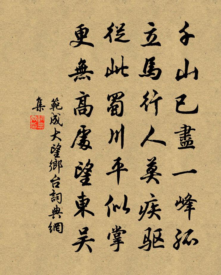 詩詞名句歷史字典書法欣賞書法字典國語詞典說文解字康熙字典古漢語字典標 題 作 者 詩 句 望鄉台作者:范成大 朝代:宋代望鄉台原文千山已盡一峰孤,立馬行人莫疾驅。從此蜀川平似掌,更無高處望東吳。詩詞問答問:望鄉台的作者是誰?答:范成大問:望鄉台寫於哪個朝代?答:宋代問:范成大的名句有哪些?答:范成大名句大全范成大望鄉台書法欣賞望鄉台書法作品詩詞推薦壽州十詠熙熙閣宋祁〔宋代〕東譙已自高,復此構層宇。誰謂淮南遠,風物美無度。飛岑納晝碧,流月遺宵素。揆予乏仙氣,樓居庶可慕。醉後狂言酬贈蕭、殷二協律白居易〔唐代〕餘杭邑客多羈貧,其間甚者蕭與殷:天寒身上猶衣葛,日高甑中未拂塵。江城山寺十一月,北風吹沙雪紛紛。賓客和孫廷平坦嵩山十首幽谷泉韓維〔宋代〕鳴泉瀉幽谷,谷響聲又激。上蔭百丈松,下有無數石。會脫炎天屨,坐浸兩腳赤。句諶祜〔宋代〕吳天北斗行宮在,漢節西風閒道歸。赴京途中遇雪孟浩然〔唐代〕迢遞秦京道,蒼茫歲暮天。窮陰連晦朔,積雪滿山川。落雁迷沙渚,飢烏集野田。客愁空佇立,不見有人煙。將赴單州和韋度支相送之什次韻王禹偁〔宋代〕就養求官動聖知,專城猶得近王畿。鄉人竟指曾題柱,丘嫂應慚不下機。西掖罷批天子詔,北堂榮著老萊衣。鄰封孫季章無愧鄭季奕徐斯遠以仆留智門載酒見過趙蕃〔宋代〕出山已與曉寒沖,下馬頻欣束緼逢。已見南山行更鈍,到時山寺已昏鍾。題朱明洞宋煜〔宋代〕澗流一一抱峰迴,面面林巒錦帳開。我品洞天居第七,只應題作小蓬萊。漁浦陸游〔宋代〕桐廬處處是新詩,漁浦江山天下稀。安得移家常住此,隨潮入縣伴潮歸。蓬萊客 贈馬彥高馬鈺〔元代〕都同急。務場無本為愁客。為愁客。禱他官長,免教虧隔。遇予咒酒忘憂測。能醫百病如扶溺。如扶溺。更宜規措擬盤張明中〔宋代〕君不見夾谷伯圖方湊幅,英雄摧挫俳優戮。又不見金谷妙歌翻綺縠,到頭也則貽羞辱。盡渠富貴莫擬倫,豈如李願虞美人 謝張芳遠惠杏花邵亨貞〔元代〕閉門日日聽風雨。不道春如許。老來猶自愛看花。及至看花雙眼被愁遮。杏花不改胭脂面。愁里驚相見。花枝猶可江城子元好問〔金代〕河堤煙樹渺雲沙。七香車。更天涯。萬古千秋,幽恨入琵琶。想到都門南下望,金縷暗,玉釵斜。津橋春水浸紅霞和前人韻王柏〔宋代〕庭前日日見蘭芽,誰把青山特地遮。雁影寂寥君又遠,歸期夜夜卜燈花。郊祀慶成詩程珌〔宋代〕紫疇祗堂陛,蒼龍奉駕回。邊塵知電掃,歲稔十年開。丹鳳覃天澤,東朝奉玉杯。樓前呼萬歲,砰隱動春雷。雜詠三首張耒〔宋代〕隆中臥龍公,平昔事耕釣。無言顧同儕,高視獨長嘯。彼寧惜開口,顧爾非同調。何事逢玄德,曹孫一言料。秋山李廌〔宋代〕山色帶晴雲,雲山遠莫分。寒林迥蕭散,秀氣自氤氳。定有丘園士,彼同麋鹿群。弓旌訪岩谷,誰為上方聞。焦山簡主僧無庵宋伯仁〔宋代〕輕搖風槳過焦山,山色相留半日閒。萬頃月波秋雨後,一篝煙翠夕陽間。城依鐵瓮心尤壯,酒對金峰鬢惜斑。願得聞毀強至〔宋代〕憶初向關中,觸熱事西走。淋漓汗征衣,早夜犯星斗。歡然赴所知,辛苦復何有。主人喜賓至,相見勞杯酒。誓將瑞鷓鴣(春日南園)程垓〔宋代〕門前楊柳綠成陰。翠塢籠香逕自深。遲日暖熏芳草眼,好風輕撼落花心。無多春恨鶯難語,最晚朝眠蝶易尋。惟有名句推薦單于北望拂雲堆,殺馬登壇祭幾回。王之渙《涼州詞二首》 柳梢聽得黃鸝語,此是春來第一聲。楊載《到京師》 不茶不飯,不言不語,一味供他憔悴。蜀妓《鵲橋仙·說盟說誓》 脊令各有思歸恨,日月相催雪滿顛。黃庭堅《次元明韻寄子由》 斷腸片片飛紅,都無人管,倩誰喚、流鶯聲住。辛棄疾《祝英台近·晚春》 九月九日眺山川,歸心歸望積風煙。盧照鄰《九月九日玄武山旅眺》 春草如有情,山中尚含綠李白《金門答蘇秀才》 月到東南秋正半。雙闕中間,浩蕩流銀漢。王國維《蝶戀花·月到東南秋正半》 君子有三患:未之聞,患弗得聞也;既聞之,患弗得學也;既學之,患弗能行也。戴聖《禮記·雜記下》 今年歡笑復明年,秋月春風等閒度。白居易《琵琶行 / 琵琶引》