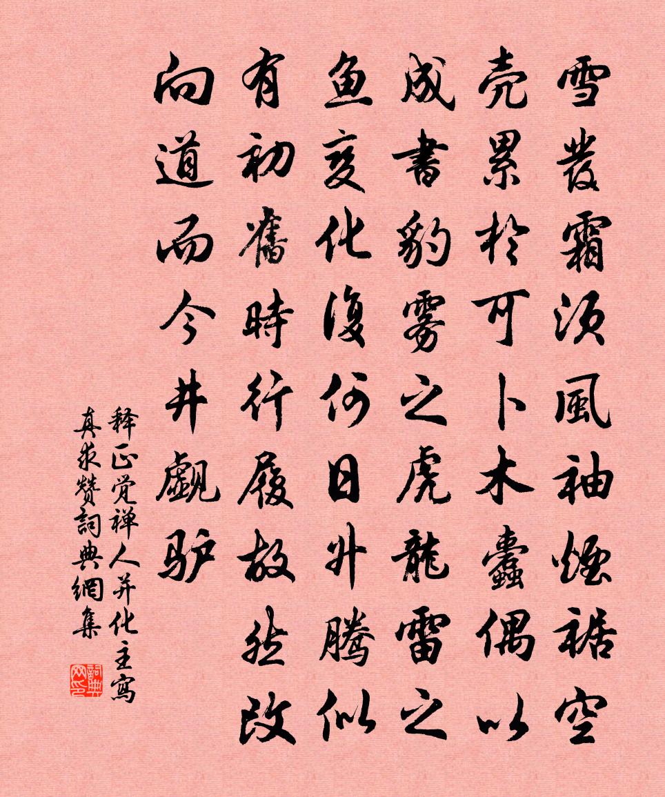 詩詞名句歷史字典書法欣賞書法字典國語詞典說文解字康熙字典古漢語字典標 題 作 者 詩 句 禪人並化主寫真求贊作者:釋正覺 朝代:宋代禪人並化主寫真求贊原文雪髮霜須,風袖煙裾。空殼累於可卜,木蠹偶以成書。豹霧之虎,龍雷之魚。變化復何日,升騰似有初。舊時行履故然改,向道而今井覷驢。詩詞問答問:禪人並化主寫真求贊的作者是誰?答:釋正覺問:禪人並化主寫真求贊寫於哪個朝代?答:宋代釋正覺禪人並化主寫真求贊書法欣賞禪人並化主寫真求贊書法作品詩詞推薦贈梅聖俞歐陽修〔宋代〕黃鵠刷金衣,自言能遠飛。擇侶異棲息,終年修羽儀。朝下玉池飲,暮宿霜桐枝。徘徊且垂翼,會有秋風時。水調歌頭(幕府有和,再用韻)李曾伯〔宋代〕碾就一輪玉,掃盡四邊塵。白乎不涅不磷,千古此丰神。領略常娥體態,寂寞謫仙材調,四海豈無人。安得金丹訣鷓鴣天辛棄疾〔宋代〕桃李漫山過眼空。也宜惱損杜陵翁。若將玉骨冰姿比,李蔡為人在下中。尋驛使,寄芳容。壠頭休放馬蹄松。吾家野眺顧禧〔宋代〕一逕多幽色,孤雲護短扉。閒階竹影瘦,低岸稻花肥。委翠秋林晚,傷弓宿鳥稀。何時攜斗酒,掬水弄清暉。漁家傲陳克〔宋代〕寶瑟塵生郎去後。綠窗閒卻春風手。淺色宮羅新染就。晴時後。裁縫細意花枝斗。象尺熏爐移永晝。粉澀浥浥薔薇郊廟歌辭。享太廟樂章。昭感佚名〔唐代〕鏗鏘韶濩,肅穆神容。洪規赫赫,祠典雍雍。已周三獻,將乘六龍。虔誠有托,懇志無從。遣興陸游〔宋代〕勳業如今莫繫懷,開單日日學僧齋。讒深只有天堪問,憂極渾無地可埋。看鏡已成雙白鬢,登山猶費幾青鞋。晚來鉛汞頌周無所住〔宋代〕欲識鉛汞,情性二物。二物和合,還丹了畢。和潞公與昌言正步游獨樂園徘徊久之主人不至司馬光〔宋代〕茂勛成亮采,勝賞寄風流。閒引翹材客,同為獨樂游。厭居華宇盛,翻愛弊廬幽。愧不先操篲,迎塵立道周。河傳·秋雨閻選〔唐代〕秋雨,秋雨,無晝無夜,滴滴霏霏。暗燈涼簟怨分離,妖姬,不勝悲。西風稍急喧窗竹,停又續,膩臉懸雙玉。幾齊雲鄧深〔宋代〕閒雲無定在,為問齊不齊。風高衣裳冷,天近日月低。寬虛快舒嘯,領覽時杖藜。南城塊蘇耳,擾擾人自迷。秋中過獨孤郊居(即公主子)盧綸〔唐代〕開園過水到郊居,共引家童拾野蔬。高樹夕陽連古巷,菊花梨葉滿荒渠。秋山近處行過寺,夜雨寒時起讀書。帝里就得勝寨遣人入巫山買酒馮時行〔宋代〕聞道巫山縣,秋深好白醪。形神須此物,觴詠本吾曹。馬杓勝鸚鵡,羊羹當蟹螯。暮寒催渴肺,徑欲賣青袍。清平樂吳文英〔宋代〕柔柯翦翠。胡蝶雙飛起。誰墮玉細花徑里。香帶薰風臨水。露紅滴□秋枝。金泥不染禪衣。結得同心成了,任教春寄當塗趙少府炎李白〔唐代〕晚登高樓望,木落雙江清。寒山饒積翠,秀色連州城。目送楚雲盡,心悲胡雁聲。相思不可見,回首故人情。行經古墓詩陰鏗〔南北朝〕偃松將古墓。年代理當深。表柱應堪燭。碑書欲有金。逈墳由路毀。荒隧受田侵。霏霏野霧合。昏昏隴日沉。懸劍龍溪道中劉克莊〔宋代〕曠土茫茫無主名,朱門惟恐籍分明。老農猶記淳熙事,太息文公志未行。十二時行孝文白居易〔唐代〕平旦寅,早起堂前參二親。處分家中送疎水,莫[教]父母喚頻聲。 偈二首釋元易〔宋代〕若實無為無不為,天堂地獄長相隨。三尺杖子攬黃河,八臂那托冷眼窺。無限魚龍盡奔走,捉得循河三腳龜。脫取隋王鼓吹曲 校獵曲謝朓〔南北朝〕凝霜冬十月。殺盛涼飈衰。原澤曠千里。騰騎紛往來。平罝望煙合。烈火從風回。殪獸華容浦。張樂荊山台。虞人名句推薦風流才子多春思,腸斷蕭娘一紙書。楊巨源《崔娘詩》 曉月過殘壘,繁星宿故關。司空曙《賊平後送人北歸》 萬帳穹廬人醉,星影搖搖欲墜。納蘭性德《如夢令·萬帳穹廬人醉》 鶯花猶怕春光老,豈可教人枉度春?佚名《增廣賢文·上集》 縱使文章驚海內,紙上蒼生而已。龔自珍《金縷曲·癸酉秋出都述懷有賦》 君歌楊叛兒,妾勸新豐酒。李白《楊叛兒》 休問梁園舊賓客,茂陵秋雨病相如。李商隱《寄令狐郎中》 內不失真,而外不殊俗王通《中說·卷六·禮樂篇》 忍淚不能歌,試托哀弦語晏幾道《生查子·墜雨已辭雲》 不學自知,不問自曉,古今行事,未之有也。王充《論衡·卷二十六·實知篇》
