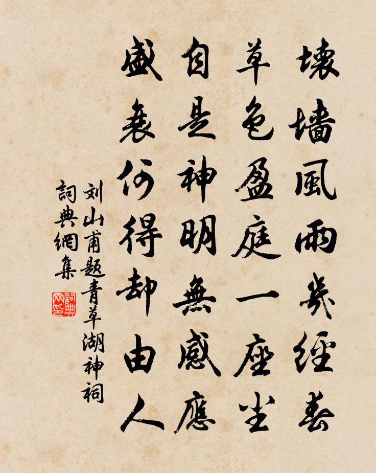詩詞名句歷史字典書法欣賞書法字典國語詞典說文解字康熙字典古漢語字典標 題 作 者 詩 句 題青草湖神祠作者:劉山甫 朝代:唐代題青草湖神祠原文壞牆風雨幾經春,草色盈庭一座塵。自是神明無感應,盛衰何得卻由人。詩詞問答問:題青草湖神祠的作者是誰?答:劉山甫問:題青草湖神祠寫於哪個朝代?答:唐代問:題青草湖神祠是什麼體裁?答:七絕劉山甫題青草湖神祠書法欣賞題青草湖神祠書法作品注釋全唐詩:卷763-19詩詞推薦挽東萊先生孟行古〔宋代〕義路資開拓,愀然驚奠亡。吾儕自如失,夫子獨何傷。往日知鬷蔑,逢人敖子方。哭君心欲折,迥立向蒼蒼。漁父歌先秦無名〔先秦〕日月昭昭乎浸已馳。與子期乎蘆之漪。日已夕兮予心憂悲。月已馳兮何不渡為。事浸急兮將奈何。蘆中人。蘆中人題龍隱岩方信孺〔宋代〕愛山那惜走千回,生怕前驅後騎催。石上參差鱗甲動,眼中在處畫圖開。驂鸞未辦乘風去,浮鷁何妨載雨來。人事再用前韻袁甫〔宋代〕心事如何忍負初,官居每憶過庭趨。勤勤撫字今微驗,雨足春疇不待雩。白鶴山李建中〔宋代〕玉簫峰下仙君宅,一樹岩花幾百春。當日會稽王內史,如何不見竹間人。句陳輔〔宋代〕含識應為獅子去,卻來重載法王身。賀新郎(三和)吳潛〔宋代〕了卻兒痴外。撰園林、亭台館榭,謾當吾世。紅楯朱橋相映帶,人在百花叢里。更依約、垂楊襯水。檜柏芙蓉橙桂田居四首秦觀〔宋代〕嚴冬百草枯,鄰曲富休暇。土井時一汲,柴車久停駕。寥寥場圃空,跕跕烏鳶下。孤榜傍橫塘,喧舂起旁舍。田家同子瞻和趙伯充團練黃庭堅〔宋代〕金玉堂中寂寞人,仙班時得共朝真。兩宮無事安磐石,萬國歸心有老臣。家釀可供開口笑,侍兒工作捧心顰。醉鄉雲西已矣江東漕司繡春園柱閒詩尚存因次韻以陳著〔宋代〕柳邊桃杏竹邊梅,儘是先生手自栽。舊事已隨春夢斷,新愁偏入老懷來。空將滿柱留題看,無復當花畫冊開。試上懷寄寇元弼王文舉十首之七局中歸賀鑄〔宋代〕不見西街客,歸來即閉門。胡床面南樹,鳥鵲啅黃昏。秋寄江舒公唐求〔唐代〕故人何處望,秋色滿江濆。入水溪蟲亂,過橋山路分。鶴歸松上月,僧入竹間雲。莫惜中宵磬,從教夢裡聞。送李元藻入浙三首趙蕃〔宋代〕漢廣求才路,嚴徐出上書。朝猶辱徒步,暮已待公車。今世無茲轍,夫君欲振裾。雖然寧有限,或者為吹噓。和真州太守營屋新成之韻三首劉宰〔宋代〕經始南風詠有虞,落成候筦報秋功。連薨盡撤編茅舊,萬灶重新列屋居。千里只今成保障,一廛誰復等蘧廬。何人和唐伯憲二首姜特立〔宋代〕卜鄰初識面,把臂便論詩。摸索曹劉耦,憑陵漢魏時。新章專雅潔,古隸更清奇。若比江西派,無人說具茨。青玉案長筌子〔元代〕瞥然悟得長生路。平坦無來去。萬法圓融超六度。威音那畔,幾人曾到,別有逍遙處。靈明國內絕朝暮。誰薦當頭代趙丞相作尚書輓詩三首項安世〔宋代〕劍閣重來日,瀛洲僅閱旬。一從充保傅,五見易冬春。作聖工夫久,膺圖歲月新。九重深悼處,早晚付經綸。送通判黃國博入浙梅堯臣〔宋代〕西風半空鳴且號,吳天點破吳鴻高。東溪車馬走送客,白露衰蘭輕若毛。客當西歸乃東去為何,欲及八月十五夜觀長兒深生日集經語示之二首陳著〔宋代〕君子之容舒,吉人之辭寡。有常則可矣,欲自得之也。瑞鶴仙希叟〔宋代〕燕堂秋未老。正木犀香散,芙蓉紅小。門闌瑞煙繞。望銀河月暗,壽星偏照。碧霞道要。有真人、親傳最妙。況桃名句推薦廢一善,則眾善衰。賞一惡,則眾惡歸。黃石公《三略·下略》 惟草木之零落兮,恐美人之遲暮。屈原《離騷》 言必信,行必果。孔子弟子《論語·子路篇》 雨足高田白,披蓑半夜耕。崔道融《田上》 絕景良時難再並,他年此日應惆悵。劉禹錫《八月十五夜桃源玩月》 何人解賞西湖好,佳景無時。歐陽修《採桑子·何人解賞西湖好》 若教眼底無離恨,不信人間有白頭。辛棄疾《鷓鴣天·晚日寒鴉一片愁》 庸愚足以覆事;精明亦足以覆事。王永彬《圍爐夜話·第五九則》 烏啼鵲噪昏喬木,清明寒食誰家哭。白居易《寒食野望吟》 千里搭長棚,沒有不散的筵席。曹雪芹《紅樓夢·第七十二回》