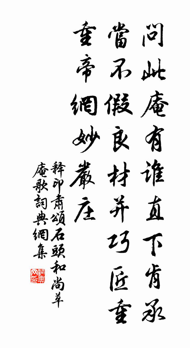 詩詞名句歷史字典書法欣賞書法字典國語詞典說文解字康熙字典古漢語字典標 題 作 者 詩 句 頌石頭和尚草庵歌作者:釋印肅 朝代:宋代頌石頭和尚草庵歌原文問此庵,有誰直下肯承當。不假良材並巧匠,重重帝網妙嚴莊。詩詞問答問:頌石頭和尚草庵歌的作者是誰?答:釋印肅問:頌石頭和尚草庵歌寫於哪個朝代?答:宋代釋印肅頌石頭和尚草庵歌書法欣賞頌石頭和尚草庵歌書法作品詩詞推薦南中詠雁詩(一作於季子詩,題作南行別弟)韋承慶〔唐代〕萬里人南去,三春雁北飛。不知何歲月,得與爾同歸。贈封陟上元夫人〔唐代〕謫居蓬島別瑤池,春媚煙花有所思。為愛君心能潔白,願操箕帚奉屏幃。好事近(同仲至和探梅)韓淲〔宋代〕湖上有孤山,合把探梅詞刻。清淺黃昏時候,冷疏枝寒色。窗前忽到又如何,一夜足相憶。信道收香藏白,報春風壽入州徐守三首王之望〔宋代〕共理經年惠利豐,此邦歌頌藹提封。仙都洞府春風好,處士星躔瑞氣濃。道同偓佺傳口訣,禪從摩詰悟心宗。世間悼玉溪張九成〔宋代〕長年聞老病,終日擁柴門。冷落田文飯,淒涼北海樽。功名看似夢,術業付諸孫。慷慨臨終語,精誠徹九閽。真宗永定陵宋祁〔宋代〕洛水縈祠外,嵩雲泊棟端。橋山何必問,只是葬衣冠。奉和九月九日登慈恩寺浮圖應制解琬〔唐代〕瑞塔臨初地,金輿幸上方。空邊有清淨,覺處無馨香。雨霽微塵斂,風秋定水涼。茲辰采仙菊,薦壽慶重陽。題碧花箋佚名〔唐代〕珠露素中書繾綣,青蘿帳里寄鴛鴦。自憐孤影清秋夕,灑淚裴回滴冷光。益壽美金花侯善淵〔元代〕返觀三景。增得靈砂盈滿鼎。光耀華嬰。點化琅宇宙清。江天夜月。寶桂玲瓏澄皎潔。惟我親栽。有似瓊花火里奉禮歌佚名〔宋代〕皇澤均普,群生遂。萬宇和祔,講天津、合祭聖宗神祖,八音鈞奏諧節。堂上薦鳴球,琴瑟擊。越布濩、霜空靜,中隱堂詩(並敘)蘇軾〔宋代〕岐山龜宰王君紳龜,其祖故蜀人也,避亂來長安,而遂家焉。其居第園有名長安城中,號中隱堂者是也。予之長安和寇十一晚登白門陳師道〔宋代〕重門傑觀屹相望,表里河山自一方。小市張燈歸意動,輕衫當戶晚風長。孤臣白首逢新政,遊子青春見故鄉。富貴采雲軒林俛〔宋代〕滄海揚塵已幾回, * 緩步此峰來。彩雲縹緲聞仙樂,綠篆淋淳銷翠苔。仙境長留間日月,飛仙宜號小蓬萊。鳳簫和元絳〔宋代〕晼晚年垂盡,陰沈氣始凝。雲霄方一色,霰雪忽相仍。何處茲辰好,吾州自古稱。稽山呈刻畫,鏗水弄鮮澄。佛土送權次翁赴湖北計幕曹彥約〔宋代〕萬灶貔貅趣上邊,皇華新遣墨猶鮮。何人共了飛芻事,有客同稱入幕賢。舉酒便驚分袂處,掛帆真至賞音前。不妨清平樂(壽叔父)張孝祥〔宋代〕英姿慷慨。獨立風塵外。湖海平生豪氣在。行矣雲龍際會。充庭蘭玉森森。一觴共祝修鈴。此地去天尺五,明年持念奴嬌盧炳〔宋代〕晚天清楚,掃太虛纖翳,涼生江曲。四顧青冥天地闊,惟有殘霞孤騖。山氣凝藍,汀煙引素,竦竦浮群木。白苹風烏衣巷劉禹錫〔唐代〕朱雀橋邊野草花,烏衣巷口夕陽斜。舊時王謝堂前燕,飛入尋常百姓家。僧慧僧利同往南山陳師道〔宋代〕驥騄同群鴻雁行,登臨端為作重陽。南台二謝風流絕,準擬歸來古錦囊。頌證道歌證道歌釋印肅〔宋代〕達者同游涅磐路,個個無衫並沒褲。一燈相續百千燈,傳燈錄上名無數。名句推薦分明一覺華胥夢,回首東風淚滿衣。趙鼎《鷓鴣天·建康上元作》 君子所,其無逸佚名《尚書·周書·無逸》 君子懷德,小人懷土;君子懷刑,小人懷惠。孔子弟子《論語·里仁篇》 光陰荏苒,日月如梭。施耐庵《水滸傳·第六十二回》 江山留勝跡,我輩復登臨。孟浩然《與諸子登峴山》 此曲有意無人傳,願隨春風寄燕然,憶君迢迢隔青天。李白《長相思三首·其二》 故園書動經年絕,華發春唯滿鏡生。崔塗《春夕》 寒來暑往,秋收冬藏。周興嗣《千字文·全文》 早梅發高樹,迥映楚天碧。柳宗元《早梅》 水急客舟疾,山花拂面香李白《秋浦歌十七首》