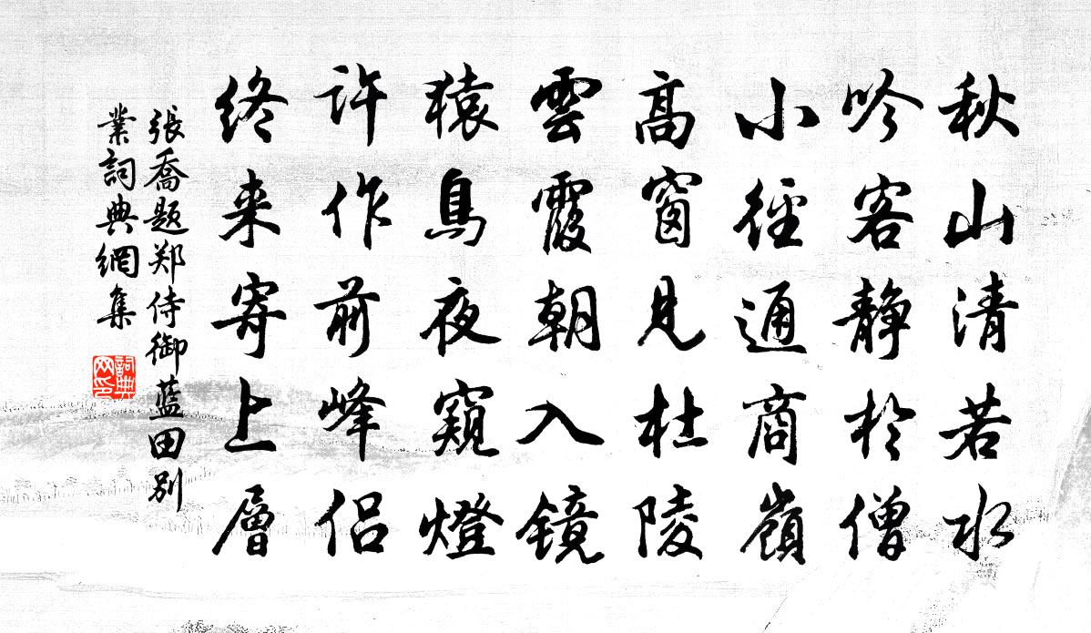 詩詞名句歷史字典書法欣賞書法字典國語詞典說文解字康熙字典古漢語字典標 題 作 者 詩 句 題鄭侍御藍田別業作者:張喬 朝代:唐代題鄭侍御藍田別業原文秋山清若水,吟客靜於僧。小徑通商嶺,高窗見杜陵。雲霞朝入鏡,猿鳥夜窺燈。許作前峰侶,終來寄上層。詩詞問答問:題鄭侍御藍田別業的作者是誰?答:張喬問:題鄭侍御藍田別業寫於哪個朝代?答:唐代問:題鄭侍御藍田別業是什麼體裁?答:五律張喬題鄭侍御藍田別業書法欣賞題鄭侍御藍田別業書法作品注釋全唐詩:卷638-43詩詞推薦清泉潔塵襟詩樓鑰〔宋代〕騷客滌事幽尋,滌清泉一派滌深。居然浮爽氣,聊用潔塵襟。徹底明蒼石,澄波漾碧岑。應添山澤趣,盡滌市朝市念奴嬌蔡伸〔宋代〕歲華晼晚,念羈懷多感,佳會難卜。草草杯盤聊話舊,同剪西窗寒燭。翠袖籠香,雙蛾斂恨,低按新翻曲。無情風三和劉克莊〔宋代〕同進多為蕡訟屈,薄徒苦與賀爭名。從教雪犬吠所怪,肯學秋蟲鳴不平。沙虱伺人陰發矢,蝦蟆欲客化為坑。相逢雜劇·虎牢關三戰呂布鄭光祖〔元代〕第一折(沖末袁紹領卒子上,雲)駿馬靡鞍紫錦袍,臨軍能識陣雲高。等閒贏得食天祿,願竭丹心輔聖朝。某乃冀送孫子肅子儀兼寄子進趙蕃〔宋代〕自君來主玉光亭,老柳頻看禿又青。雞黍欣留故人飯,文書惡雜長官廳。鄉來念別今真去,從此微言孰為聽。伯氏效古澹交〔唐代〕榮辱又榮辱,一何翻與覆。人生百歲中,孰肯死前足。玄鬢忽如絲,青叢不再綠。自古爭名徒,黃金是誰祿。沁園春陳德武〔宋代〕飛雨一番,杜宇數聲,東君又回。對花垂粉淚,舟移洛甫,柳眉顰黛,馬走章台。南架海棠,北窗紅藥,都是當年詠孤石高麗定法師〔南北朝〕迥石直生空,平湖四望通。岩根恆灑浪,樹杪鎮搖風。偃流還漬影,侵霞更上紅。獨拔群峰外,孤秀白雲中。雨霽立門外見萬山蔥翠如頗自喜得獨占山居之姜特立〔宋代〕吾廬何處是,野色滿方壺,野色滿方壺。一水長來繞,千峰不用呼。偶然成擇勝,幸爾慰歸愚。問訊曲湖老,何時雙燕離張玉孃〔宋代〕白楊花發春正美,黃鵠簾垂低。燕子雙去復雙來,將棄成舊疊。秋風忽夜起,相呼度江水。風高江浪危,拆散東西念奴嬌(和尹司門與蔡侯詠雪)姚勉〔宋代〕雕裘夜冷,怪地爐煨酒,經時難熱。曉起盤風天舞絮,拍手兒童歡悅。客里新吟,天葩翦巧,思與梅爭發。使君屬燕坐陸游〔宋代〕赫日曈曈涌海門,黃流混混泝河源。功成一日書仙籍,鏈骨成金不足言。西郊即事三首廖行之〔宋代〕曉行出日歸流螢,二童一馬塵蒙纓。道傍老翁笑相語,道上夫子真勞生。有田觀我奉甘旨,無技聳世難公卿。從渠王貫之有詩留別因次其韻虞儔〔宋代〕檣頭語燕底匆匆,滿幅蒲帆送客風。合與仇謀從此逝,病兼貧至向來同。紛紛時事愁眉上,咄咄人情醉眼中。頗覺次韻泮宮直宿早秋四首傅察〔宋代〕皎皎清波滿岬空,疏林散影弄朦朧。援毫欲賦陽台夢,振袂欣乘玉宇風。已覺素秋來席上,卻疑仙景落壺中。凌雲題時覺寺在在堂十二首舒坦〔宋代〕斷橋高下路橫斜,隔水人煙四五家。雨後一枝紅帶雪,風流不道有岩花。訪許渾殷堯藩〔唐代〕去郭來尋隱者居,柳陰假步小籃輿。每期會面初償約,卻計論心舊得書。淺綠垣牆綿薜荔,淡紅池沼映芙渠。為言送信州姚使君盧綸〔唐代〕朱幡徐轉候群官,猿鳥無聲郡宇寬。楚國上腴收賦重,漢家良牧得人難。銅鉛滿穴山能富,鴻雁連群地亦寒。幾日大雪復用前韻呈王尚書陳造〔宋代〕密雪何自來,雨襧雲其祖。史臣紀上瑞,外此可無語。帝豈為詩設,偏為詩人取。梁園謝家庭,麗句傳今古。玄冥宣州雜詩二十首梅堯臣〔宋代〕傳道零陵守,茲亭暫解裝。分群同雁鶩,幾日到瀟湘。班竹思虞舜,赬萍憶楚王。殷勤吏部句,今亦誦無忘。名句推薦得言不可以不察。數傳而白為黑,黑為白。呂不韋《呂氏春秋·論·慎行論》 不信妾斷腸,歸來看取明鏡前。李白《長相思·其二》 深宮桃李無人問,舊愛玉顏今自恨。元好問《玉樓春·驚沙獵獵風成陣》 十二闌乾,故國三千里。王庭筠《鳳棲梧·衰柳疏疏苔滿地》 不枉東風吹客淚。相思難表,夢魂無據,惟有歸來是。歐陽修《青玉案·一年春事都來幾》 情之所鍾,雖醜不嫌。沈復《浮生六記·閨房記樂》 想當年、空運籌決戰,圖王取霸無休。柳永《雙聲子·晚天蕭索》 雄州霧列,俊采星馳。王勃《滕王閣序》 今古河山無定據。納蘭性德《蝶戀花·出塞》 欲速則不達。孔子弟子《論語·子路篇》