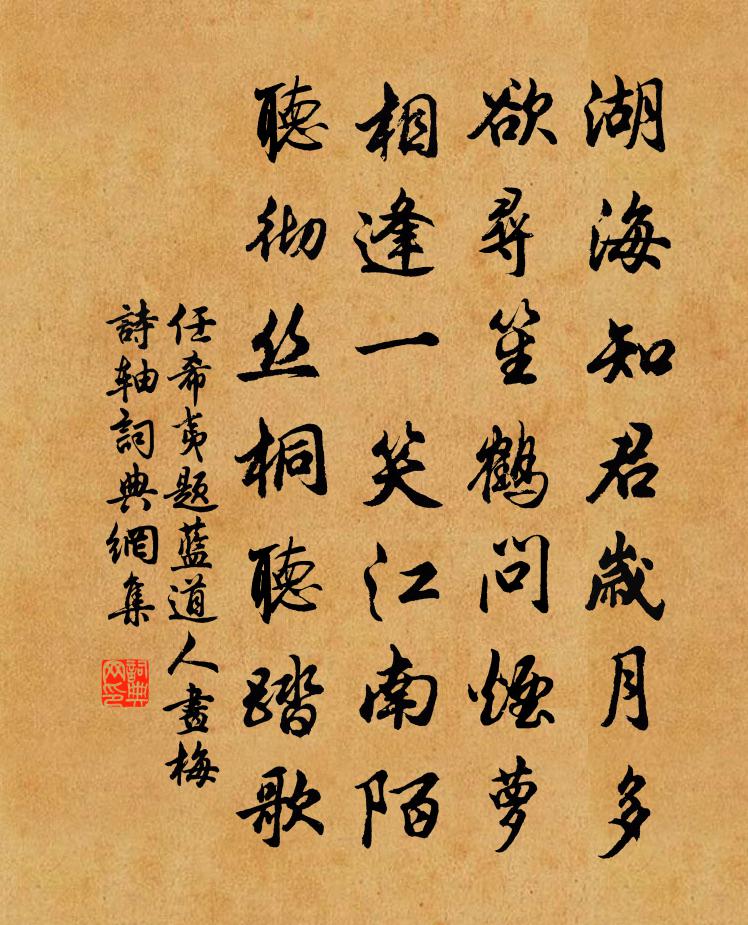 詩詞名句歷史字典書法欣賞書法字典國語詞典說文解字康熙字典古漢語字典標 題 作 者 詩 句 題藍道人畫梅詩軸作者:任希夷 朝代:宋代題藍道人畫梅詩軸原文湖海知君歲月多,欲尋笙鶴問煙蘿。相逢一笑江南陌,聽徹絲桐聽踏歌。詩詞問答問:題藍道人畫梅詩軸的作者是誰?答:任希夷問:題藍道人畫梅詩軸寫於哪個朝代?答:宋代任希夷題藍道人畫梅詩軸書法欣賞題藍道人畫梅詩軸書法作品詩詞推薦夜讀范至能攬轡錄言中原父老見使者多揮涕感陸游〔宋代〕公卿有黨排宗澤,帷幄無人用岳飛。遺老不應知此恨,亦逢漢節解沾衣。贈周東卿畫魚文天祥〔宋代〕觀君瀟湘圖,起我濠上心。短褐波濤舊,秋雨菰蒲深。玉樓春歐陽澈〔宋代〕個人風韻天然俏。入鬢秋波常似笑。一彎月樣黛眉低,四寸鞋兒蓮步小。絕纓嘗宴瓊樓杪。軟語清歌無限妙。歸時酒泉子曹勛〔宋代〕霜護雲低,竹外斜枝初璀璨,仙風吹墮玉鈿新。度清芬。嘆寒冰艷了無塵。不占紛紛桃李徑,一庭疏影冷搖春。月鄭亨仲作亭西山顏曰可友以書求詩為賦一首潘良貴〔宋代〕君不見子猷嗜好與俗殊,種竹不可一日無。又不見太白清狂世絕倫,舉杯邀月獨相親。風流二子去已遠,塵埃那復九日嘉州發軍亭即事薛逢〔唐代〕三江分注界平沙,何處雲山是我家。舞鶴洲中翻白浪,掬金灘上折黃花。不愁故國歸無日,卻恨浮名苦有涯。向暮長相思蘇頲〔唐代〕君不見天津橋下東流水,南望龍門北朝市。楊柳青青宛地垂,桃紅李白花參差。花參差,柳堪結,此時憶君心斷絕奉和魯望同游北禪院皮日休〔唐代〕戚歷杉陰入草堂,老僧相見似相忘。吟多幾轉蓮花漏,坐久重焚柏子香。魚慣齋時分淨食,鴿能閒處傍禪床。雲林和子瞻沿牒京口憶西湖寒食出遊見寄二首陳襄〔宋代〕乞得湖山養病身,花時曾共憶行春。嚶鳴幽鳥還遷木,觱沸清泉復彩芹。皂蓋尋芳丘有李,彩樓觀戲巷無人。錦袍次贈少微兄韻樓鑰〔宋代〕汪樓比屋古城隅,彼此清貧不願余。南阮諸賢今有幾,東床佳婿竟誰如。歸鄉年亦非全老,對酒情猶未覺疏。來往酌道傍古松下錢王水絕頂微露塔尖聞有僧院名張鎡〔宋代〕山圍當車巾,佳興坌滿前。盤松儼如畫,蓋疊疎蘿纏。沙平恰席許,坐蔭宜鋪氈。扶筇瞰根穴,湛碧泓寒泉。霏空真宗御製二首真宗〔宋代〕鴻源濬發,睿圖誕彰。高明錫義,累洽延祥。巍巍藝祖,溥率實生。煌煌文考,區宇大康。珍符昭類,實歷綿長。臨江仙·西湖春泛趙溍〔宋代〕堤曲朱牆近遠,山明碧瓦高低。好風二十四花期。驕驄穿柳去,文艗挾春飛。簫鼓晴雷殷殷,笑歌香霧霏霏,閒情呂成公寬平通鑑佚老三帖贊岳珂〔宋代〕治粹於隆古,元{凱加丶}之懿,根於篤誠。世澤未傾,英髦代興。非不卓犖,絕乎逕庭。而斯道之正,獨未有以橫路林少皋輓詞林亦之〔宋代〕十年騎馬畫橋歸,長記朱樓傍水湄。今日悲吟想君屋,一如騎馬十年時。送福昌周繇少府歸寧兼謀隱杜荀鶴〔唐代〕少見古人無遠慮,如君真得古人情。登科作尉官雖小,避世安親祿已榮。一路水雲生隱思,幾山猿鳥認吟聲。知君渚宮野步題芳草范成大〔宋代〕草色沐新雨,綠潤如得意。披拂欲生煙,苒苒著巾袂。天涯各芳春,秦吳千萬里。故人攀桂枝,今夕念遊子。題淨居寺戴叔倫〔唐代〕玉壺山下雲居寺,六百年來選佛場。滿地白雲關不住,石泉流出落花香。偈頌一百一十七首釋紹曇〔宋代〕九月授衣天,芝峰無可授。破衲擁寒雲,對客慵開口。雜言送王無咎及第後授江都尉先歸建昌梅堯臣〔宋代〕白袍來,黃綬回。來跨騫驢回跨馬,麻源三谷桂花開。江都作尉入風埃,主人劉向西京才。心如明月無不照,恐君名句推薦曉霧將歇,猿鳥亂鳴;陶弘景《答謝中書書》 坐蔭從容煩暑退,清心恍惚微香觸。陸容《滿江紅·詠竹》 野蔬充膳甘長藿,落葉添薪仰古槐。元稹《遣悲懷三首·其一》 見兔而顧犬,未為晚也;亡羊而補牢,未為遲也。劉向《戰國策·楚四·莊辛謂楚襄王》 欺君為大,加諸罪無可免;枉法不容,縱其為禍方懲。來俊臣《羅織經·謀劃卷第九》 我行殊未已,何日復歸來。宋之問《題大庾嶺北驛》 夢中未比丹青見,暗裡忽驚山鳥啼。姜夔《鷓鴣天·元夕有所夢》 青海陣雲匝,黑山兵氣沖。高適《塞下曲》 人之忌,在好為人師。孟子《孟子·離婁章句上·第二十三節》 帶長劍兮挾秦弓,首身離兮心不懲。屈原《國殤》