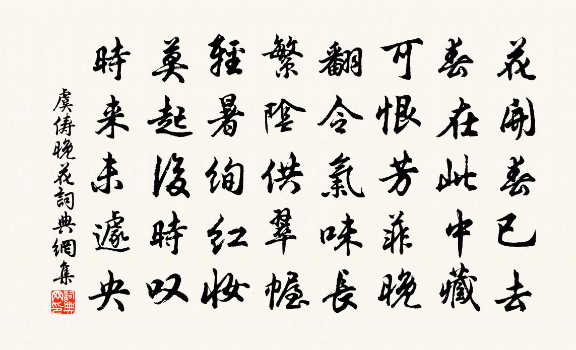詩詞名句歷史字典書法欣賞書法字典國語詞典說文解字康熙字典古漢語字典標 題 作 者 詩 句 晚花作者:虞儔 朝代:宋代晚花原文花開春已去,春在此中藏。可恨芳菲晚,翻令氣味長。繁陰供翠幄,輕暑絢紅妝。莫起後時嘆,時來未遽央。詩詞問答問:晚花的作者是誰?答:虞儔問:晚花寫於哪個朝代?答:宋代虞儔晚花書法欣賞晚花書法作品詩詞推薦游琴台墨池吳中復〔宋代〕尋春景物乍晴暄,連月余寒花未繁。犬子琴台余古寺,揚雄墨沼但空園。池邊宿草交加綠,林外鳴禽相鬥喧。秀麥西地梨詩沈約〔南北朝〕列茂河陽苑。蓄紫濫觴隈。翻黃秋沃若。落素春徘徊。重陽二首蘇泂〔宋代〕為客時多不解愁,亦逢佳節強登樓。酒闌自摘茱萸望,何處青山是越州。觀物二首陳文蔚〔宋代〕牆東一微物,妙意包藏深。人皆看枝葉,我獨觀其心。萌櫱毀綿綿,茂盛亦駸駸。從此識天地,生生無古今。郡齋左偏栽竹百餘竿炎涼已周青翠不改而為牆垣…之趣令狐楚〔唐代〕齋居栽竹北窗邊,素壁新開映碧鮮。青藹近當行藥處,綠陰深到臥帷前。風驚曉葉如聞雨,月過春枝似帶煙。老子道州奉寄襄陽裴相公呂溫〔唐代〕悠悠世路自浮沉,豈問仁賢待物心。最憶過時留宴處,艷歌催酒後亭深。失調名佚名〔宋代〕櫻桃新薦小梅紅。河傳趙鼎〔宋代〕秋光向晚。嘆羈游坐見。年華將換。一紙素書,擬托南來征雁。奈雪深、天更遠。東窗皓月今宵滿。淺酌芳尊,暫扇子詩李石〔宋代〕露葉涓涓泣素秋,旗亭樽酒解忘憂。別來頻寄加餐字,莫遣新詩學四愁。舟中三首宋祁〔宋代〕舟行不礙動,縱目望聯堤。稍覺前川近,徐驚後樹低。魚游隨聚沫,禽度帶殘啼。自趣家田路,春清況日攜。頌古四十五首釋慧遠〔宋代〕不是風幡動,亦非仁者心。自從胡亂後,淈{左氵右盾}到而今。留題仙觀徐鉉〔唐代〕瑤壇醮罷晚雲開,羽客分飛俗士回。為報移文不須勒,未曾游處待重來。獄中見壁畫佛劉長卿〔唐代〕不謂銜冤處,而能窺大悲。獨棲叢棘下,還見雨花時。地狹青蓮小,城高白日遲。幸親方便力,猶畏毒龍欺。余辛卯歲臥病郡城陳宗之胡希聖有詩問訊後五劉克莊〔宋代〕如聞攻老拙,頗似斫虛空。眾口嘲投閣,新眉妒入宮。一身槁梧上,百歲大槐中。莫嘆形骸廢,姑留兩頰紅。北征汪元量〔宋代〕北師有嚴程,挽我投燕京。挾此萬卷書,明發萬里行。出門隔山嶽,未知死與生。三宮錦帆張,粉陣吹鸞笙。遺氓以湯餅招韓伯周王岩起二提舉鄭深道曾宏甫二曾幾〔宋代〕鏡湖淮瀆舊刺史,廬阜赤城新使君。敢持湯餅一取飽,更用尊酒重論文。玉川遣奴致雙鯉,吏部呼兒書八分。不如春秋戰國門晏嬰周曇〔唐代〕正人徒以刃相危,貪利忘忠死不為。麋鹿命懸當有處,驅車何必用賓士。春曉汪莘〔宋代〕曉來雨初晴,天宇淨如拭。隔籬見花柳,春氣亂五色。東君渾不管,但為閒者得。我方獵鵾鵬,溟南復溟北。登雄州北門樓蔣概〔宋代〕壯士未酬志,乘秋感慨多。幽燕新種落,唐漢舊關河。塞月沉青琢,邊聲入暮河。蘇武慢(唐安西湖)陸游〔宋代〕澹靄空濛,輕陰清潤,綺陌細塵初靜。平橋系馬,畫閣移舟,湖水倒空如鏡。掠岸飛花,傍檐新燕,都似學人無定名句推薦我也不登天子船,我也不上長安眠。唐寅《把酒對月歌》 將者,上不制於天,下不制於地,中不制於人。尉繚《尉繚子·兵談》 別浦今朝暗,羅帷午夜愁李賀《七夕》 千里搭長棚,沒有個不散的筵席曹雪芹《紅樓夢·第二十六回》 送君九月交河北,雪裡題詩淚滿衣。岑參《送崔子還京》 五更鐘動笙歌散,十里月明燈火稀。賀鑄《思越人·紫府東風放夜時》 旦別河橋楊柳風,夕臥伊川桃李月。宋之問《寒食還陸渾別業》 說相思,問相思,楓落吳江雁去遲。吳錫麒《長相思·以書寄西泠諸友即題其後》 君子愛財,取之有道。佚名《增廣賢文·上集》 五更櫪馬靜無聲。鄰雞猶怕驚。吳文英《醉桃源·元日》