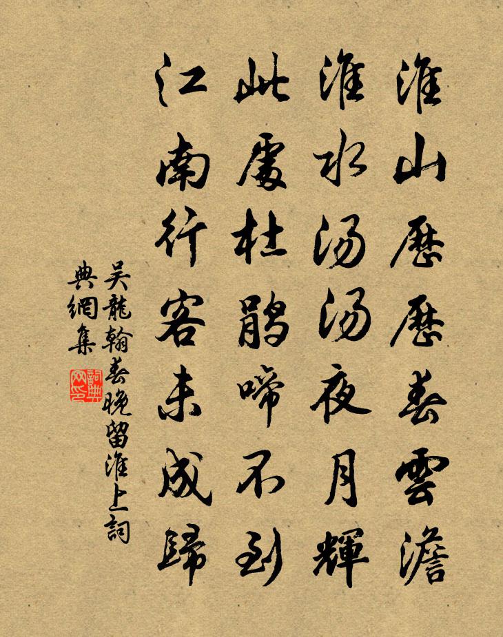詩詞名句歷史字典書法欣賞書法字典國語詞典說文解字康熙字典古漢語字典標 題 作 者 詩 句 春晚留淮上作者:吳龍翰 朝代:宋代春晚留淮上原文淮山歷歷春雲澹,淮水湯湯夜月輝。此處杜鵑啼不到,江南行客未成歸。詩詞問答問:春晚留淮上的作者是誰?答:吳龍翰問:春晚留淮上寫於哪個朝代?答:宋代吳龍翰春晚留淮上書法欣賞春晚留淮上書法作品詩詞推薦酒中十詠酒旗皮日休〔唐代〕青幟闊數尺,懸於往來道。多為風所颺,時見酒名號。拂拂野橋幽,翻翻江市好。雙眸復何事,終竟望君老。和中丞晏尚書西園石楠紅葉可愛宋庠〔宋代〕幾歲江南樹,高秋洛涘園。碧姿先雨潤,紅意後霜繁。影疊光風動,梢迷夕照翻。一陪幽興賞,容易到黃昏。題履道兄古松圖釋文珦〔宋代〕屏間何人畫四松,高標半在煙雲中。人來盡作真松看,槎枒古怪勢不同。一株連蜷如老龍,曾見於康廬窈窱之深峰奏院豫七弟輓詩高斯得〔宋代〕瑟瓚天資美,洪樞地胄華。安恬羞善宦,孝謹克承家。籀學耽奇古,文房好靜嘉。顏瓢空不繼,原粟散無涯。庭徑昨者張耒〔宋代〕昨者飛雹幾破屋,頗說四郊妨麥熟。十日霖雨一日晴,泥潦漫漫不容足。淒風寒涼肅肌骨,五月更衣初秋服。草木至性靈迂僻學術空虛幸逢好古之君獲在藏書之李至〔宋代〕蓬閣多餘暇,天寒懶出門。宴眠書幌靜,夜話地爐溫。甌觸烹茶鼎,瓢浮著酒盆。翻同未應舉,嵩洛住山村。秋晚即事三首李彌遜〔宋代〕華發鬅鬙一榻書,舟移斜日到籧篨。似聞載酒江邊寺,更倒青錢留白魚。六代祖師贊釋文禮〔宋代〕倩人書偈,巧說脫空。傳衣宵遁,喪盡英雄。非風旙動惟心動,依舊埋身草莽中。再和聖愈見答歐陽修〔宋代〕兩畿相望東與西,書來三日猶為稽。短篇投子譬瓦礫,敢辱報之金褭蹄。文章至寶被埋沒,氣象往往乾雲霓。飛黃南鄉子佚名〔宋代〕把酒對江梅。個是花中第一枝。冰雪肌膚瀟灑態,須知。姑射仙人正似伊。東閣賦新詩。慚愧當年杜拾遺。月里何四城門詩沈約〔南北朝〕六龍既驚軫。二鼠復馳光。衰齡難慎輔。暮質易凋傷。秋思陸游〔宋代〕黃落梧桐覆井床,莎根日夜泣寒螿。老生窺鏡鬢成雪,俊鶻掣韝天欲霜。破虜誰持白羽扇?從軍曾擁綠沈槍。壯心壽制使董侍郎程公許〔宋代〕秋雲陰陰壓邊城,秋風颯颯飛邊塵。淮堧夕烽連峴首,往來羽檄無時停。那籌樓上一長嘯,環六十郡皆陽春。老翁冬暖戴復古〔宋代〕天不雨霜雪,朝曦與暮霞。江梅遲臘蕊,岩桂更冬花。地暖宜為客,時難重憶家。楚山當晚眺,歸興逐棲鴉。竹外海棠衛宗武〔宋代〕我有三徑園,今為牛馬皂。傍家尋丈地,昔未長荼蓼。琅玕數十挺,新培歲可考。幻出一庭陰,咫尺成深窈。客來勸陸三飲酒戴叔倫〔唐代〕寒郊好天氣,勸酒莫辭頻。擾擾鍾陵市,無窮不醉人。秋日野步和王覺民十六首王之道〔宋代〕煙里山光陳水墨,雲邊日影亂青紅。新詩有畫人難到,高壓澄江五字工。三日嘉雨呈張守劉克莊〔宋代〕方寸憂勤匝四封,兵廚不爨鮮懽悰。青苗暫閣農加額,朱表親題帝動客。便著蓑衣駕秧馬,莫投鐵簡起湫龍。邦人和陳天予冠字韻吳芾〔宋代〕已是頭童懶整冠,尊前猶欲強追歡。浮生得滿七旬少,樂事能並四者難。閒去稍知心地適,興來殊覺醉鄉寬。入朝旅中秋夜薛嵎〔宋代〕車馬日西東,阮生途自窮。三年辭舊國,今日又秋風。邊雁淒涼過,池花寂寞紅。邦人慣相識,漸覺語音通。名句推薦德之不修,學之不講,聞義不能徙,不善不能改,是吾憂也。孔子弟子《論語·述而篇》 團扇,團扇,美人病來遮面。王建《宮中調笑·團扇》 酒醒人靜奈愁濃。殘燈孤枕夢,輕浪五更風。徐昌圖《臨江仙·飲散離亭西去》 南浦春來綠一川,石橋朱塔兩依然。范成大《橫塘·南浦春來綠一川》 人間夢隔西風,算天上、年華一瞬。吳文英《惜秋華·七夕》 楊柳千條拂面絲,綠煙金穗不勝吹。溫庭筠《題柳》 其水,用山水上,江水中,井水下。陸羽《茶經·五之煮》 水流花謝兩無情,送盡東風過楚城。崔塗《春夕》 解釋春風無限恨,沉香亭北倚闌乾。李白《清平調·其三》 蜀江水碧蜀山青,聖主朝朝暮暮情。白居易《長恨歌》