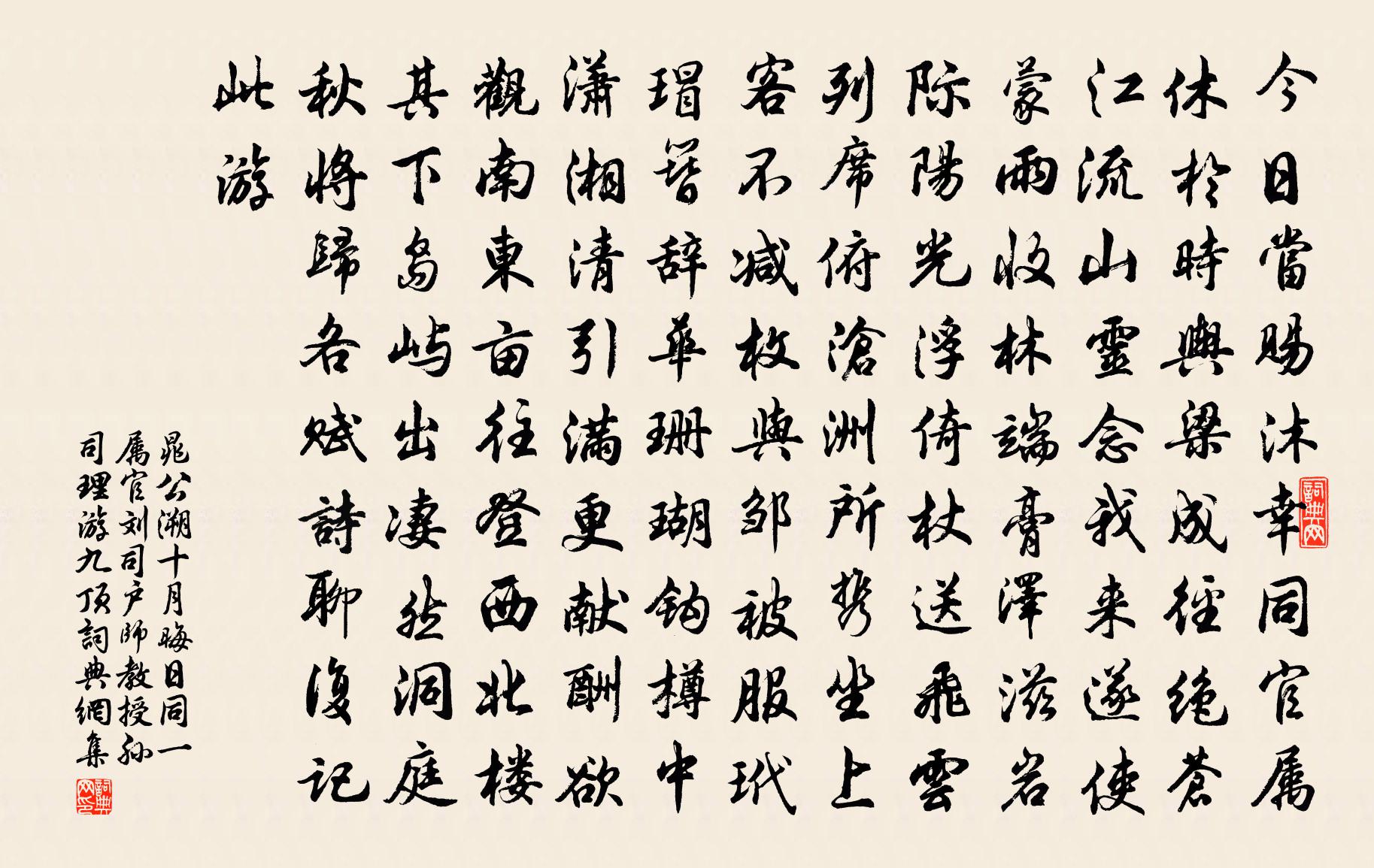 詩詞名句歷史字典書法欣賞書法字典國語詞典說文解字康熙字典古漢語字典標 題 作 者 詩 句 十月晦日同一屬官劉司戶師教授孫司理游九頂作者:晁公溯 朝代:宋代原文今日當賜沐,幸同官屬休。於時輿梁成,徑絕蒼江流。山靈念我來,遂使蒙雨收。林端膏澤滋,岩際陽光浮。倚杖送飛雲,列席俯滄洲。所攜坐上客,不減枚與鄒。被服玳瑁簪,辭華珊瑚鉤。樽中瀟湘清,引滿更獻酬。欲觀南東畝,往登西北樓。其下島嶼出,悽然洞庭秋。將歸各賦詩,聊復記此游。詩詞問答問:《十月晦日同一屬官劉司戶師教授孫司理游九頂》的作者是誰?答:晁公溯問:該詩寫於哪個朝代?答:宋代書法欣賞十月晦日同一屬官劉司戶師教授孫司理游九頂書法作品詩文賞析【原題】:十月晦日同一屬官劉司戶師教授孫司理游九頂山登萬景樓分韻賦詩得游字韻詩詞推薦江神子(喜雨上麓翁)吳文英〔宋代〕一聲玉磬下星壇。步虛闌。露華寒。平曉阿香,油壁碾青鸞。應是老鱗眠不得,雲炮落,雨瓢翻。身閒猶耿寸心丹飯楓橋鋪趙蕃〔宋代〕只堠復雙堠,晨雞仍午雞。春風空浩浩,客意只淒淒。驅我因微祿,言歸欠薄畦。有懷無與共,聊以命詩題。石湖山居顧逢〔宋代〕越來溪上望,雨漲一篙深。折葦眠枯葉,老蓮生苦心。水連孤嶼遠,山入半湖陰。喜近行春路,時於月下吟。白鶴觀虞集〔元代〕白鶴山人如鶴白,自抱山樽留過客。要看修竹萬琅 ,更對名花春雪色。山樽本出山下泉,過客醉去山人眠。客亦登黃鶴樓懷古兼寄潘豳老昆仲賀鑄〔宋代〕漢大將軍楚國材,半生倦韻浼塵埃。徐夫人匕首安在,丁令威華表歸來。紫府無蹤勞彷像,白雲有待久裴徊。樓標與黎道士小飲偶言及曾文清公慨然有感陸游〔宋代〕臨川稅駕忽數月,嗜睡愛閒常閉門。君詩始愜病僧意,吾道難為俗人言。秋雨淒淒黃葉寺,春風酣酣綠樹村。曾公和此陽先生感興詩二十首劉黻〔宋代〕智巧役一世,往往悲古愚。觸蠻榮利場,白日事浮虛。情流失固有,意騖希本無。相與龍斷登,獨不捷徑趨。是非靈濟橋語釋印肅〔宋代〕此渡若非橋,不放眾生過。過去現在佛,並西來達磨。皆是接群迷。直指人這個。如今人不知,顛倒成患禍。堅執謝東禪月湖以諸祖偈頌見示釋子益〔宋代〕家貧路富鼻遼天,各立門風辱祖先。爭似太平無事客,長伸兩腳放憨眠。山居雜詩九十首曹勛〔宋代〕寒毬格雖下,春事亦可尋。故園少見之,花葉均來禽。芳蓓暖苞玉,半腮紅淺深。與客屢清賞,只恐風雨侵。使嶺南聞崔馬二御史並拜台郎蘇味道〔唐代〕振鷺齊飛日,遷鶯遠聽聞。明光共待漏,清鑒各披雲。喜得廊廟舉,嗟為台閣分。故林懷柏悅,新幄阻蘭薰。冠去滿庭芳王以寧〔宋代〕山聳方壺,潮通碧海,江東自昔名家。玉真仙子,璫佩粲朝霞。一種天香勝味,笑楊梅、不數枇杷。難模寫,牟尼送趙給事侄尉丹陽李端〔唐代〕太傅憐群從,門人亦賤回。入官先愛子,賜酒許同杯。淮海春多雨,蒹葭夜有雷。遙知拜慶後,梅尉稱仙才。過菁山秀王墓衛宗武〔宋代〕對案撲獅袞,來岡陣馬驅。讖書曾昔驗,王氣慨今無。猶喜王侯冢,免遭詩禮儒。蔥蔥余壤樹,柯葉尚紛敷。雜詠黃庚〔宋代〕囊底詩成無賣處,床頭金盡已多時。元龍豪氣依然在,慣守清貧豈足悲。蘇秦王安石〔宋代〕已分將身死勢權,惡名磨滅幾何年。想君魂魄千秋後,卻悔初無二頃田。游虎丘岩偶題壁韻葉因分字聯句黃公度〔宋代〕一室函滄海,群公半列侯。放懷追許謝,洗耳笑巢由。花暖蜂相趁,泥香燕自求。杖藜窮勝境,染筆記春遊。【越調】寨兒個張可久〔元代〕道士王中山操琴傍翠陰,解塵襟,婆娑小亭深又深。軫玉徽金,霞佩瓊簪,一操《醉翁吟》。野猿啼雪滿遙岑,玄吳春卿郎中餉臘豬肉,戲作古句楊萬里〔宋代〕老夫畏熱飯不能,先生饋肉香傾城。霜刀削下黃水精,月斧斫出紅松明。君家豬紅臘前作,是時雪沒吳山腳。公子殘臘書懷舒邦佐〔宋代〕冰池照日暖初融,準擬迎春更餞冬。杯酒乍疏情少緒,尺緘稽報病多慵。殘年斷送風和雪,晚節相依竹與松。回首名句推薦隨意春芳歇,王孫自可留。王維《山居秋暝》 停杯投箸不能食,拔劍四顧心茫然。李白《行路難·其一》 淚濕羅巾夢不成,夜深前殿按歌聲。白居易《後宮詞》 湖山信是東南美,一望彌千里蘇軾《虞美人·有美堂贈述古》 今宵絕勝無人共,臥看星河盡意明。陳與義《雨晴·天缺西南江面清》 想烏衣年少,芝蘭秀髮,戈戟雲橫。葉夢得《八聲甘州·壽陽樓八公山作》 水天清話,院靜人銷夏。項鴻祚《清平樂·池上納涼》 赤壁磯頭落照,肥水橋邊衰草,渺渺喚人愁張孝祥《水調歌頭·和龐佑父》 神人之言微,聖人之言簡,賢人之言明,眾人之言多,小人之言妄。陳繼儒《小窗幽記·集醒篇》 苦雨思白日,浮云何由卷。李白《玉真公主別館苦雨贈衛尉張卿二首》