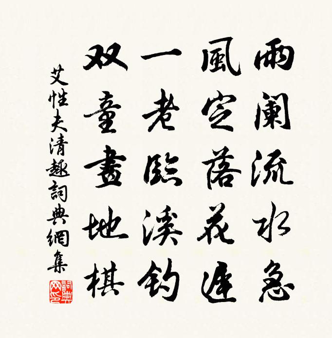 詩詞名句歷史字典書法欣賞書法字典國語詞典說文解字康熙字典古漢語字典標 題 作 者 詩 句 清趣作者:艾性夫 朝代:宋代清趣原文雨闌流水急,風定落花遲。一老臨溪釣,雙童畫地棋。詩詞問答問:清趣的作者是誰?答:艾性夫問:清趣寫於哪個朝代?答:宋代問:清趣是什麼體裁?答:五絕艾性夫清趣書法欣賞清趣書法作品詩詞推薦次韻子瞻寄眉守黎希聲蘇轍〔宋代〕眼看狂瀾倒百川,孤根漂蕩水無邊。思家松菊荒三逕,回首謳歌沸二天。簿領沉迷催我老,春秋廢格累公賢。鄰居詠史二首劉禹錫〔唐代〕驃騎非無勢,少卿終不去。世道劇頹波,我心如砥柱。賈生明王道,衛綰工車戲。同遇漢文時,何人居貴位。船子夾山贊釋了惠〔宋代〕一棹綠楊灣,金鱗得處難。長江深有恨,不合蹈船翻。德麟留詩相別輒次韻賀送晁說之〔宋代〕安穩王孫一葉舟,朅來京國淡無求。任生白髮曾料虎,分絕紅塵自狎鷗。桓笛不堪留往恨,膺門誰復憶同游。重陽幽谷趙方〔宋代〕靜虛空闊深盤旋,松掛薜蘿籠紫煙。嘗引我來尋詩料,和殘皎皎白駒篇。游岝崿山劉過〔宋代〕倦遊華發老飄飄,意氣依然在九霄。努力尚能登岝崿,廢詩那可寄參寥。欹斜古寺云為屋,稱由溪流石架橋。安得留別榮茂實侍郎曾幾〔宋代〕老為吳會客,耆舊不相忘。政以牛馬走,曾陪鵷鷺行。千年書穴在,六月鏡湖涼。從此登臨地,回頭憶侍郎。和陳傳道秋日十詠之五秋月賀鑄〔宋代〕霜空出華月,樽酒聊相對。別夜復嬋娟,故人千里外。禪人並化主寫真求贊釋正覺〔宋代〕顛毛如許白,面孔較些肥。寒松偃蹇兮雪在頂,枯山癯瘠兮春添衣。據床握杖,雷吼電飛。光痕已露也,是誰見幾建平途次張耒〔宋代〕野橋田徑滑,官路柳條新。流水伴麗日,野花留晚春。點空知去翼,沖綠有歸人。自笑諳岐路,無勞更問津。田家雜興八首儲光羲〔唐代〕春至鶬鶊鳴,薄言向田墅。不能自力作,黽勉娶鄰女。既念生子孫,方思廣田圃。閒時相顧笑,喜悅好禾黍。夜夜答崔賓客晦叔十二月四日見寄(來篇雲共相呼喚醉歸來)白居易〔唐代〕今歲日餘二十六,來歲年登六十二,尚不能憂眼下身,因何更算人間事。居士忘筌默默坐,先生枕麴昏昏睡。早晚竹枝劉禹錫〔唐代〕江上春來新雨晴,□西春水彀紋生。橋東橋西好楊柳,人來人去唱歌行。好事近(十二之五)陸游〔宋代〕華表又千年,誰記駕雲孤鶴。回首舊曾游處,但山川城郭。紛紛車馬滿人間,塵土污芒屩。且訪葛仙丹井,看岩花別詩佚名〔兩漢〕有鳥西南飛,熠熠似蒼鷹。朝發天北隅,暮聞日南陵。欲寄一言去,托之箋彩繒。因風附輕翼,以遺心蘊蒸。鳥辭送薛秀才皇甫冉〔唐代〕雖是尋山客,還同慢世人。讀書惟務靜,無褐不憂貧。野色春冬樹,雞聲遠近鄰。郄公即吾友,合與爾相親。尚書打球小驄步驟最奇因有所贈徐夤〔唐代〕善價千金未可論,燕王新寄小龍孫。逐將白日馳青漢,銜得流星入畫門。步驟最能隨手轉,性靈多恐會人言。桃花春晚桐江上閒望作貫休〔唐代〕江上車聲落日催,紛紛擾擾起紅埃。更無人望青山立,空有帆沖夜色來。沙鳥似雲鍾外去,汀花如火雨中開。可憐題朱陵觀三首張明中〔宋代〕不怪豐年屢足書,此鄉民力看何如。依山靠嶺都開墾,二歲為新三歲畲。偈頌一百四十一首釋師範〔宋代〕剋期取證,系縛盲驢。休夏自陳,且莫鬼語。名句推薦芳草平沙,斜陽遠樹,無情桃葉江頭渡。張翥《踏莎行·芳草平沙》 送子軍中飲,家書醉里題。岑參《磧西頭送李判官入京》 棘枝風哭酸,桐葉霜顏高。孟郊《秋懷十五首》 尾生與女子期於梁下,女子不來,水至不去,抱樑柱而死。莊子《莊子·雜篇·盜跖》 奢侈足以敗家;慳吝亦足以敗家。王永彬《圍爐夜話·第五九則》 江上晚來堪畫處,釣魚人一蓑歸去。馬致遠《壽陽曲·江天暮雪》 白日地中出,黃河天外來。張蠙《登單于台》 須作一生拚,盡君今日歡。牛嶠《菩薩蠻·玉爐冰簟鴛鴦錦》 離宮絕曠,身體摧藏,志念沒沉,不得頡頏。王昭君《怨詞》 若對黃花孤負酒,怕黃花、也笑人岑寂。劉克莊《賀新郎·九日》