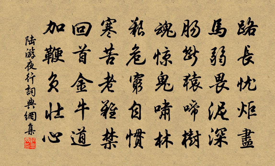 詩詞名句歷史字典書法欣賞書法字典國語詞典說文解字康熙字典古漢語字典標 題 作 者 詩 句 夜行作者:陸游 朝代:宋代夜行原文路長憂炬盡,馬弱畏泥深。腸斷猿啼樹,魂驚鬼嘯林。艱危窮自慣,寒苦老難禁。回首金牛道,加鞭負壯心。詩詞問答問:夜行的作者是誰?答:陸游問:夜行寫於哪個朝代?答:宋代問:陸游的名句有哪些?答:陸游名句大全陸游夜行書法欣賞夜行書法作品詩詞推薦田家春望高適〔唐代〕出門何所見,春色滿平蕪。可嘆無知己,高陽一酒徒。念奴嬌(壽陳尚書母夫人)吳儆〔宋代〕東風著意,正群芳未放,蟠桃初綴。王母當年親手種,來作人間上瑞。婺女星躔,金華福地,聊駐千千歲。恰才八過洞庭袁說友〔宋代〕兩湖綿亘連千里,萬古蒼梧說二妃。最羨巴童並蜀客,飽看日月去還歸。和明遠喜雨作鄧肅〔宋代〕絳狗鳴空朱虎攫,神焦鬼爛不堪虐。自嗟筆力無韓豪,不敢讒風乾鼎鑊。聞說祥符物外臣,能將念力蘇罷民。挽出周祀圜丘歌 登歌庾信〔南北朝〕歲之祥。國之陽。蒼靈敬。翠雲長。象為飾。龍為章。乘長日。坯蟄戶。烈雲漢。迎風雨。六呂歌。雲門舞。省滌偈頌一百零二首釋紹曇〔宋代〕堋八刺札,新翻曲調,逸格鄉談。意隨流水遠,聲遏莫雲寒,月移花影上欄乾。題畫四首唐寅〔明代〕紅樹中間飛白雲,黃茅眼底界斜曛。此中大有逍遙處,難說與君畫與君。懷白石社尊師道堅仇遠〔宋代〕我思南山陽,穀神何綿綿。松下笑相別,惚恍忘歲年。寄我猶龍經,文字入幽玄。終期白石頂,擊竹歌遊仙。金字經·樵隱馬致遠〔元代〕擔挑山頭月,斧磨石上苔。且做樵夫隱去來。柴,買臣安在哉?空岩外,老了棟樑材。偈頌十三首釋智遇〔宋代〕居必擇鄰,鑒非止水。明暗相凌,言猶在耳。致仕後次韻答張念七韓維〔宋代〕一榻高眠只自思,累朝榮宦竟何為。顛毛白盡朱顏改,惟有丹心似舊時。上巳日祓禊渭濱應制劉憲〔唐代〕桃花欲落柳條長,沙頭水上足風光。此時御蹕來游處,願奉年年祓禊觴。和直指春日示眾釋慧空〔宋代〕庵前烏龜久不見,一夜雷雨忽然出。東山老漢眼{搭扌換目}痴,近前問訊定光佛。褒三湯孝行袁甫〔宋代〕誰道田家不讀收,一門孝行與人殊。直將自己通天地,豈是無心惜體膚。人願生兒皆似此,神如佑善肯忘吾。勉哉二月望游齊山呈倉使二首錢時〔宋代〕生平忠膽上摩天,兩鬢如絲山水緣。欲向翠微窮望眼,淮山無數鎖春煙。過香積寺王維〔唐代〕不知香積寺,數里入雲峰。古木無人徑,深山何處鐘。泉聽咽危石,日色冷青松。薄暮空潭曲,安禪製毒龍。題趙伯驌畫楊娃〔宋代〕蓮開宮沼年年盛,香染斑衣葉葉新。願供琴音奏清雅,薰風涼殿壽雙親。送呂興元李新〔宋代〕行入雲衢路未通,主人明日復觀風。幾聲寒鵲江村暮,煙雨瀟瀟失去鴻。太守召陪諸公游虎丘朱長文〔唐代〕海涌一小山,遠視如陵丘。中藏天下奇,岩谷峻且幽。石壁老萬古,劍池照千秋,蕞爾小吳會,隱然瞰瀛洲。能令夜坐即事遣興陳翊〔唐代〕小閣暮雲遠,亂山黃葉稀。斗低天軸動,霜冷月魂飛。愛客樽常滿,尋詩帶減圍。庭烏繞高樹,遊子亦思歸。名句推薦不可以一時之得意,而自誇其能;亦不可以一時之失意,而自墜其志。馮夢龍《警世通言·卷十七》 賞賜不能喜,誅罰不能威。墨子《墨子·05章 七患》 松月生夜涼,風泉滿清聽。孟浩然《宿業師山房期丁大不至 / 宿業師山房待丁大不至》 正入萬山圈子裡,一山放過一山攔楊萬里《過松源晨炊漆公店》 吠犬雜鳴雞,燈火熒熒歸路迷。納蘭性德《南鄉子·秋暮村居》 酷暑天,葵榴發,噴鼻香十里荷花。白樸《得勝樂·夏》 系我一生心,負你千行淚。柳永《憶帝京·薄衾小枕涼天氣》 女為君子儒,無為小人儒。孔子弟子《論語·雍也篇》 花氣襲人知驟暖,鵲聲穿樹喜新晴。陸游《村居書喜》 一曲危弦斷客腸。津橋捩柂轉牙檣。嚴仁《鷓鴣天·惜別》