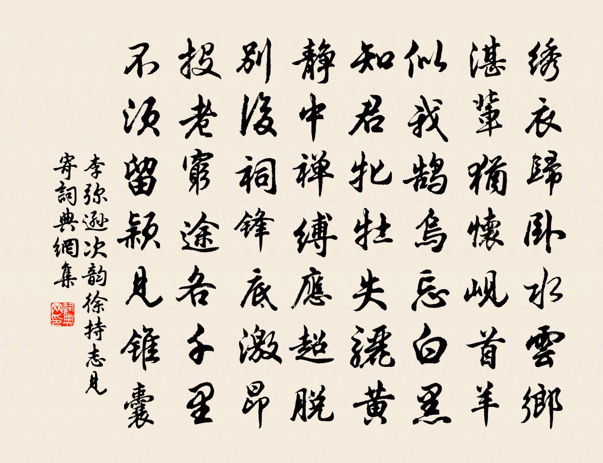 詩詞名句歷史字典書法欣賞書法字典國語詞典說文解字康熙字典古漢語字典標 題 作 者 詩 句 次韻徐持志見寄作者:李彌遜 朝代:宋代次韻徐持志見寄原文繡衣歸臥水雲鄉,湛輩猶懷峴首羊。似我鵠烏忘白黑,知君牝牡失驪黃。靜中禪縛應超脫。別後祠鋒底激昂。投老窮途各千里,不須留穎見錐囊。詩詞問答問:次韻徐持志見寄的作者是誰?答:李彌遜問:次韻徐持志見寄寫於哪個朝代?答:宋代李彌遜次韻徐持志見寄書法欣賞次韻徐持志見寄書法作品詩詞推薦頌古五十三首釋文禮〔宋代〕賸噇生菜似頭驢,臨濟堂前捉敗渠。聳耳長鳴隨踢踏,不知業債倩誰除。月夜書懷二首陳傅良〔宋代〕送客門初掩,收書室更虛。新篁高過瓦,涼月下臨除。婦病才扶杖,兒饞或饋魚。今朝吾已過,莫問夜何如。次韻何叔信趙蕃〔宋代〕苔蘚斑斑過雨廊,菱荷獵獵晚秋鄉。廬山大似要元亮,江夏安能隱戴良。酒遇諸豪君可敵,詩逢二妙我無長。昔何詩江淹〔南北朝〕見上客兮心歷亂。送短詩兮懷長嘆。中人望兮蠶既飢。爕蹀暮兮思夜半。貴溪道中四絕鄭剛中〔宋代〕人見寒雲凍欲垂,暄呼爭願玉花飛。誰知萬里征途上,季子囊中未有衣。雜詠十首方鳳〔宋代〕昆鵬奮雲霄,尺鷃棲野草。物各適其天,夫豈論大小。念奴嬌(垂虹亭)朱敦儒〔宋代〕放船縱棹,趁吳江風露,平分秋色。帆卷垂虹波面冷,初落蕭蕭楓葉。萬頃琉璃,一輪金鑒,與我成三客。碧空寥辛卯除夜戴表元〔宋代〕臘月今年只今夕,春風明日是明年。狂歌把酒屠蘇地,醉眼看梅霧淞天。碧玉千壺喧坐次,紅牙六博斗飛錢。頭顧雜記十首劉克莊〔宋代〕綠野池新鑿,平泉墅又開。乃知造涼殿,諫者不能回。滿庭芳朱唏顏〔元代〕寒壓衾綢,光搖書幌,夜深香夢初殘。細聽窗戶,簌簌鄉春蠶。風勁時時墮砌,分明認、山溜潺*。呼童起,疏梅園中晚興張鎡〔宋代〕滿襟斜日澹如秋,煙竹湘花結暮愁。幾樹蟬清新抱葉,一灣魚樂舊忘鉤。蔬盤飽去山家飯,楚調吹來水園謳。此事奉敕祭西太一和韓川韻四首蘇軾〔宋代〕玉璽親題御筆,金童來侍天香。禮罷祝融參乘,前驅已過衡湘。懷別越中友人釋文珦〔宋代〕白首蒼山里,生涯舊已空。別離人易遠,江海意無窮。夜月悲新蛩,秋煙落斷鴻。遙思來往處,朝暮有樵風。醜奴兒/採桑子張孝祥〔宋代〕珠燈璧月年時節,織手同攜。今夕誰知,自拈梅花勸一卮。逢人問道歸來也,日日佳期。管有來時。趁得手燈也未燕歸來/喜遷鶯王質〔宋代〕拂拂春風入馬啼。□駐綠楊堤。綠楊堤上乳鶯啼。聲聲怨、怨春歸。而今一似花流水,縱跡任東西。利成名逐在何古風其五十二李白〔唐代〕青春流驚湍。朱明驟回薄。不忍看秋蓬。飄揚竟何托。光風滅蘭蕙。白露灑葵藿。美人不我期。草木日零落。再和易後韻為前韻六首衛宗武〔宋代〕黑不待黔烏,白不待浴鵠。天分既超卓,能消幾學術。飄飄霞外姿,瞳方而發綠。滿腹貯古書,咳唾可袪俗。沖氣題人移牡丹黃庶〔宋代〕林上春來恰恰忙,安排顏色與春裝。栽培欲報應先發,根柢雖移不改芳。紅藥便心減價,黃蜂偷喜蜜添香。憑君剩春暮登黃鶴樓周弼〔宋代〕欲盡殘春酒,登臨事已違。聽殘懷舊笛,添盡禦寒衣。鳥向青山沒,人來赤壁稀。最憐城側樹,無可作花飛。尚書命題瓦硯徐夤〔唐代〕遠向端溪得,皆因郢匠成。鑿山青靄斷,琢石紫花輕。散墨松香起,濡毫藻句清。入台知價重,著匣恐塵生。守黑名句推薦君命無違,榮之本也,智者捨身亦存續。來俊臣《羅織經·固榮卷第六》 不得乎親,不可以為人;不順乎親,不可以為子。孟子《孟子·離婁章句上·第二十八節》 水漲魚天拍柳橋。雲鳩拖雨過江皋。周邦彥《浣溪沙·水漲魚天拍柳橋》 去意徊徨,別語愁難聽。周邦彥《蝶戀花·早行》 天長路遠魂飛苦,夢魂不到關山難。李白《長相思·其一》 如來說世界非世界。是名世界。鳩摩羅什譯《金剛經·如法受持》 憶對中秋丹桂叢。花在杯中。月在杯中。辛棄疾《一剪梅·中秋元月》 望雲慚高鳥,臨水愧游魚。陶淵明《始作鎮軍參軍經曲阿作》 父為考,母為妣。佚名《爾雅·釋親》 芳草無情,更在斜陽外范仲淹《蘇幕遮·懷舊》