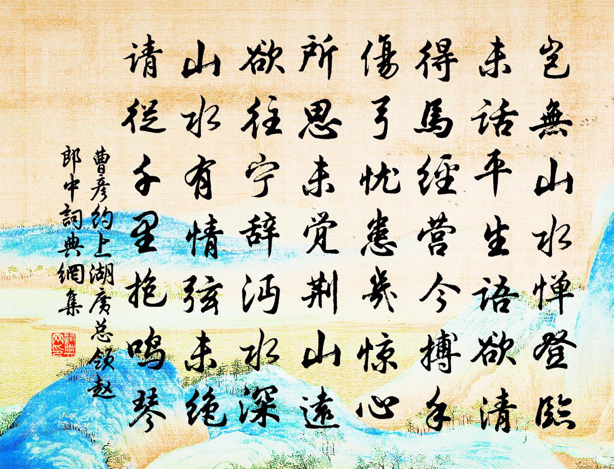 詩詞名句歷史字典書法欣賞書法字典國語詞典說文解字康熙字典古漢語字典標 題 作 者 詩 句 上湖廣總領趙郎中作者:曹彥約 朝代:宋代上湖廣總領趙郎中原文豈無山水憚登臨,未話平生語欲清。得馬經營今搏手,傷弓憂患幾驚心。所思未覺荊山遠,欲往寧辭沔水深。山水有情弦未絕,請從千里抱鳴琴。詩詞問答問:上湖廣總領趙郎中的作者是誰?答:曹彥約問:上湖廣總領趙郎中寫於哪個朝代?答:宋代曹彥約上湖廣總領趙郎中書法欣賞上湖廣總領趙郎中書法作品詩詞推薦喜遷鶯 曉行劉一止〔宋代〕曉光催角。聽宿鳥未驚,鄰雞先覺。迤邐煙村,馬嘶人起,殘月尚穿林薄。淚痕帶霜微凝,酒力沖寒猶弱。嘆倦客溪亭夜集走筆胡仲弓〔宋代〕倚柱看潮生,漁歌靜中發。吟罷寂無聲,江風對山月。重寄子遹陸游〔宋代〕秋風日日望歸裝,忽報來期喜欲狂。衰病無因楫迎汝,夢隨殘月過浮梁。泊馬公嶺徐璣〔宋代〕維舟拂曉步平沙,晚泊雲根第一家。新取菜蔬沾野露,旋編籬落帶山花。門前相對青峰小,屋後流來白水斜。可愛七月初十夜對月呈留粹中陳元晉〔宋代〕人間寒信到階蛩,天外清商入井桐。孤館無人同夜月,長年作客又秋風。想君侷促重簾底,似我棲遲逆旅中。何事與莫同年雨中飲湖上蘇軾〔宋代〕到處相逢是偶然,夢中相對各華顛。還來一醉西湖雨,不見跳珠十五年。挽平山菊澗陳普〔宋代〕卑卑梯接俗,望重若蒿蓬。作俑系何代,彌天以送終。鬧居常憤切,易簧愈昭融。一二人家化,駸駸似洛中。寄馮著韋應物〔唐代〕春雷起萌蟄,土壤日已疏。胡能遭盛明,才俊伏里閭。偃仰遂真性,所求惟斗儲。披衣出茅屋,盥漱臨清渠。吾道送滕教婦二首陳淳〔宋代〕驛道芬菲春氣柔,征蹄去去不容留。俯辭南國摳衣佩,直向端門拜冕旒。璧沼從知新訓導,石渠旋復細刊讎。 * 紹興祀九宮貴神十首佚名〔宋代〕惟天丕冒,彪列九神。財成元化,險驚下民。有酒斯旨,登牙苾芬。昭哉降鑒,茀祿來臻。題《李將軍傳》崔道融〔唐代〕猿臂將軍去似飛,彎弓百步虜無遺。漢文自與封侯得,何必傷嗟不遇時。送周器之歸潤再索王令〔宋代〕何須別子始沾衣,久有江南去夢飛。為語青山幸相望,壯夫終不白頭歸。公無渡河徐集孫〔宋代〕公無渡河,公無渡河,公必欲渡意如何。波濤洶湧何足畏,中原未復一身多。爭知平地有風波,人心之險險於河。憶故園顧況〔唐代〕惆悵多山人復稀,杜鵑啼處淚沾衣。故園此去千餘里,春夢猶能夜夜歸。二十七日作趙蕃〔宋代〕卜居面勢隘,附山枕林麓。曠瞻既無地,何以慰羈束。昏昏半月雨,候應黃梅熟。晨興更涼冷,轉午增蒸溽。山蟬明皇祀圜丘樂章。太和佚名〔唐代〕六成既闋,三薦雲終。神心具醉,聖敬愈崇。受釐皇邸,回蹕帷宮。穰穰之福,永永無窮。賦愁魏扶〔唐代〕愁。迥野,深秋。生枕上,起眉頭。閨閣危坐,風塵遠遊。巴猿啼不住,谷水咽還流。送客泊舟入浦,思鄉望月登自嘲鄭獬〔宋代〕樂府休翻白薴歌,樽前已怯卷紅螺。壯心雖欲未伏老,爭奈秋來白髮何。【雙調】湘妃怨_楚天空闊楚阿魯威〔元代〕楚天空闊楚天長,一度懷人一斷腸。此心只在肩輿上,倩東風過武昌,助離愁煙水茫茫。竹上雨湘妃淚,樹中禽蜀奉禮歌佚名〔宋代〕蒼蒼天色是還非。視下應疑。亦若斯。統元氣,覆無私。四時寒暑推移。物蕃滋。造化有誰知。嚴大報,反本始,名句推薦鼓吹助清賞,鴻雁起汀洲。蘇轍《水調歌頭·徐州中秋》 可憐赤壁爭雄渡,唯有蓑翁坐釣魚。杜牧《齊安郡晚秋》 信人莫若信己,防人毋存幸念。來俊臣《羅織經·閱人卷第一》 北風其涼,雨雪其雱。佚名《北風》 前年過代北,今歲往遼西薛道衡《昔昔鹽》 閒倚博山長嘆,淚流沾皓腕。韋莊《歸國遙·春欲晚》 林深藏卻雲門寺,回首若耶溪。張可久《人月圓·會稽懷古》 一年滴盡蓮花漏。碧井酴酥沈凍酒。毛滂《玉樓春·己卯歲元日》 客思吟商還怯。怨歌長、瓊壺暗缺。周密《玉京秋·煙水闊》 只願君心似我心,定不負相思意。李之儀《卜運算元·我住長江頭》