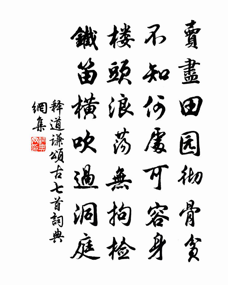 詩詞名句歷史字典書法欣賞書法字典國語詞典說文解字康熙字典古漢語字典標 題 作 者 詩 句 頌古七首作者:釋道謙 朝代:宋代頌古七首原文賣盡田園徹骨貧,不知何處可容身。樓頭浪蕩無拘檢,鐵笛橫吹過洞庭。詩詞問答問:頌古七首的作者是誰?答:釋道謙問:頌古七首寫於哪個朝代?答:宋代釋道謙頌古七首書法欣賞頌古七首書法作品詩詞推薦憶黃州梅花五絕蘇軾〔宋代〕一枝價重萬瓊琚,直恐姑山雪不如。盡愛丹鉛競時好,不如風雪養天姝。游誠之來廣西相從幾一年今當赴官九江極與之張栻〔宋代〕士學端成已,工夫要自程。聖門窺廣大,中德養和平。美玉資勤珏,良才詎小成。心期須後會,拭目更增明。水龍吟·雪中登大觀亭鄧廷楨〔清代〕關河凍合梨雲,沖寒猶試連錢騎。思量舊夢,黃梅聽雨,危闌倦倚。披氅重來,不分明出,可憐煙水。算夔巫萬里次韻答胡委履二首項安世〔宋代〕君不見大胡公,春秋一筆誅群雄,要與排鴻驅家爭無功。素王吾無間然矣,命世雖雲無有爾。至今可望不可前,海戰掉醜奴兒 贈劉叔建馬長吉馬鈺〔元代〕吾親叔建並長吉,兩個同監。來解婪耽。來往奔波名利貪,似痴憨。勸他早把元陽整,戀甚妻男。卓個雲庵。一句送司徒相公赴闕薛逢〔唐代〕丞相銜恩赴闕時,錦城寒菊始離披。龍媒舊識朝天路,雞樹長虛入夢枝。十載殿廷連步武,兩來庸蜀撫疲羸。莫愁湖山十景麴院風荷王洧〔宋代〕避暑人歸自冷泉,步頭雲錦晚涼天。愛渠香陣隨人遠,行過高橋旋買船。道上梅蘇泂〔宋代〕栗棘蓬邊父老家,不知來歷便橫斜。思量卻是無心種,逢著春風偶自花。滿戌有日置酒還宮為諸友贈別程公許〔宋代〕左綿山川見寬,周遭四境皆奇觀。廣文官曹冰雪寒,摧風肅雨無時安。巧手無麪良獨難,慚汗如瀋時一歡。浪浪春答郡守趙師夔金梁之〔宋代〕王侯門戶懶開顏,斗酒千錢一笑間。無雪可欺青檜老,有天難管白雲閒。丹霄作客曾騎鶴,紫府為家不買山。京口九日蘇泂〔宋代〕茅檐小屋對青山,只有淵明一味閒。手把黃花玩尊酒,宛然風味義熙間。次韻和運使王密學新葺西亭移花之作宋庠〔宋代〕高齋新境斷織塵,曲圃芳畦豫記春。今日且資移樹法,明年應作看花人。舟夜苦雨李鴻章〔清代〕一月天何醉,四山雲若痴。潮添積雨後,春到寒江遲。夢覺客衾薄,燈昏鄰笛悲。流年孤艇送,不覺鬢絲絲。清夜琴興白居易〔唐代〕月出鳥栖盡,寂然坐空林。是時心境閒,可以彈素琴。清泠由木性,恬澹隨人心。心積和平氣,木應正始音。響余漁家傲(九月將盡,菊花始有開者)李綱〔宋代〕木落霜清秋色霽。菊苞漸吐金英碎。佳節不隨東去水。誰得會。黃花開日重陽至。三徑舊栽煙水外。故園凝望空流往回臨安口號八首蘇泂〔宋代〕道傍舉首揖髯陳,領得秋塘句法新。歸飯客樓隨取別,隔橋相見兩詩人。真定舞范成大〔宋代〕虜樂悉變中華,惟真定有京師舊樂工,尚舞高平曲破。紫袖當棚雪鬢凋,曾隨廣樂奏雲韶。老來未忍耆婆舞,猶倚寧宗朝享三十五首真宗〔宋代〕於皇我宋,世有哲明。元祐用人,遹駿有聲。紹述先志,思監於成。受天之祜,王配於涼。奉和聖制登太行山中言志應制蘇頲〔唐代〕北山東入海,馳道上連天。順動三光注,登臨萬象懸。俯觀河內邑,平指洛陽川。按蹕夷關險,張旗亘井泉。曉岩四月望再游西湖十首陳造〔宋代〕定結諸山粥飯緣,每歸留得杖頭錢。穿雲更欲攜君去,布水多煩為我先。名句推薦士有妒友,則賢交不親;君有妒臣,則賢人不至。荀子《荀子·大略》 野渡花爭發,春塘水亂流。李嘉祐《送王牧往吉州謁王使君叔》 都緣自有離恨,故畫作遠山長。歐陽修《訴衷情·眉意》 客醉倚河橋,清光愁玉簫。高觀國《菩薩蠻·何須急管吹雲暝》 日日深杯酒滿,朝朝小圃花開。朱敦儒《西江月·日日深杯酒滿》 錦里開芳宴,蘭缸艷早年。盧照鄰《十五夜觀燈》 嘆流年、又成虛度。陸游《謝池春·壯歲從戎》 落盡梨花春又了。滿地殘陽,翠色和煙老。梅堯臣《蘇幕遮·草》 殊方日落玄猿哭,舊國霜前白雁來。杜甫《九日五首·其一》 天迥雲垂草,江空雪覆沙劉基《古戍》