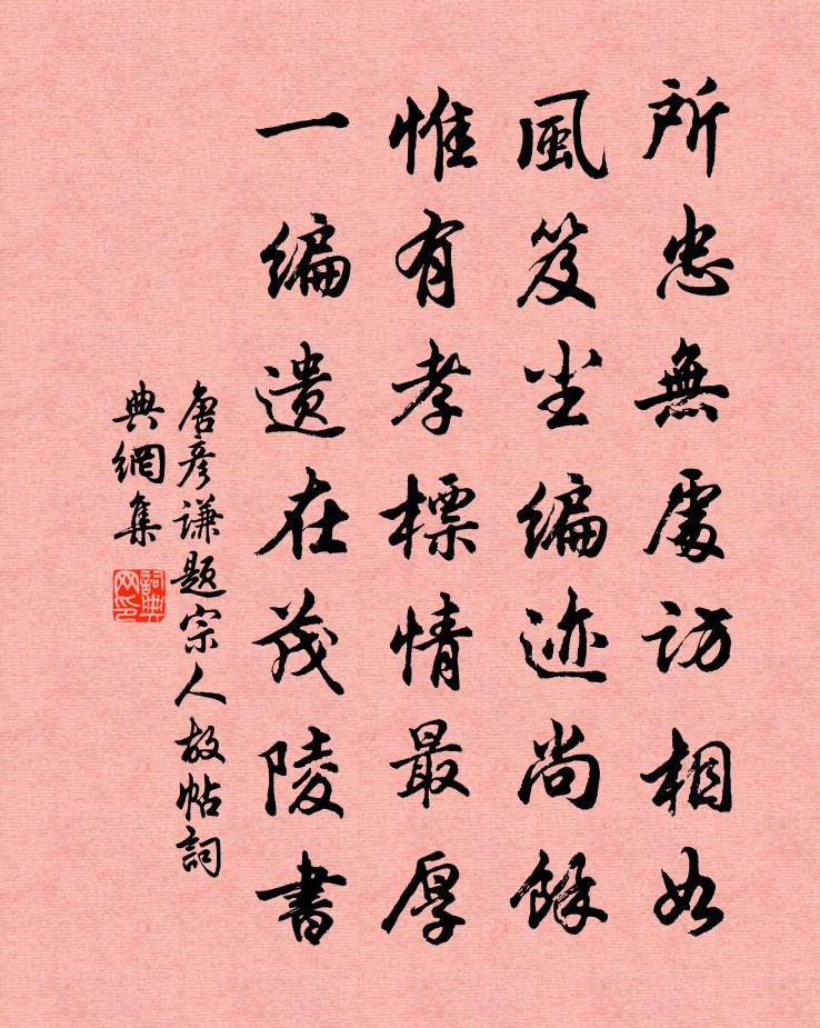 詩詞名句歷史字典書法欣賞書法字典國語詞典說文解字康熙字典古漢語字典標 題 作 者 詩 句 題宗人故帖作者:唐彥謙 朝代:唐代題宗人故帖原文所忠無處訪相如,風笈塵編跡尚余。惟有孝標情最厚,一編遺在茂陵書。詩詞問答問:題宗人故帖的作者是誰?答:唐彥謙問:題宗人故帖寫於哪個朝代?答:唐代問:題宗人故帖是什麼體裁?答:七古唐彥謙題宗人故帖書法欣賞題宗人故帖書法作品注釋全唐詩:卷672-9詩詞推薦初至虎牙漢見江山類龍門歐陽修〔宋代〕曉鼓潭潭客夢驚,虎牙灘上作船行。山形酷似龍門秀,江色不如伊水清。平日兩京人少壯,今年三峽歲崢嶸。臥聞燕歸梁晏殊〔宋代〕雙燕歸飛繞畫堂。似留戀虹梁。清風明月好時光。更何況、綺筵張。雲衫侍女,頻傾壽酒,加意動笙簧。人人心在再次前韻呈林郎中五首陳造〔宋代〕春皇報人如寄音,紫燕窺簾鶯繞林。於時不無客欣戚,此意正系天晴陰。傍湖樓影酒旗直,到眼人家花霧深。老子生查子莫崙〔宋代〕三兩信涼風,七八分圓月。愁緒到今年,又與前年別。衾單容易寒,獨暗相將滅。欲識此時情,聽取鳴蛩說。汶陽館文天祥〔宋代〕去歲營船隩,今朝館汶陽。海空沙漠漠,河廣草茫茫。家國哀千古,男兒慨四方。老槐秋雨暗,孤影照淋浪。竹齋題事李埴〔宋代〕低齋結空野,小竹移孤林。齋閒竹淨好,日媚幽人心。南方夏厭暑,獨此留殘陰。戛雨挫促夢,穿風搜涼襟。長茵兔李嶠〔唐代〕上蔡應初擊,平風遠不稀。目隨槐葉長,形逐桂條飛。漢月澄秋色,梁園映雪輝。唯當感純孝,郛郭引兵威。和黃彥華帥機六言十首劉克莊〔宋代〕遺稿六丁取盡,君王謾遣所忠。既友商山四皓,又容淮南公八。次韻馬少伊、郁舜舉寄示同游石湖詩卷七首范成大〔宋代〕得得來題小隱詩,拂香縈柳畫船移。湖邊好景春猶未,須到秋清月滿時。雙松陸游〔宋代〕東岡夭矯兩蒼龍,千尺蟠空黛色濃。六十餘年松若此,誰知我更老於松!寄蔣山如一翁釋祖先〔宋代〕悠悠世路絕躋攀,臥看白雲空往還。惟有同參一句子,肯將容易混塵寰。聞西蟾從弟卜岩居岳西有寄齊己〔唐代〕瀑布見高低,岩開岩壁西。碧雲多舊作,紅葉幾新題。滴瀝中疏磬,嵌空半倚梯。仍聞樵子徑,□不到前溪。送雪竇圓兄歸疏山釋紹曇〔宋代〕錦鏡濃妝蜀樣花,沒塵無處惹塵埃。好歸說與曹家女,已是當堂打破來。美人圖唐寅〔明代〕舞罷霓裳日色低,滿身春倦眼迷離。錦絲步帳繁花里,閒弄珊瑚血色枝。三學院王投〔宋代〕三面松篁簇梵宮,當軒冷砌畫屏風。遊人試問空門理,雲起青山鶴山籠。和王著作融八公山詩謝朓〔南北朝〕二別阻漢坻。雙崤望河澳。茲嶺復巑岏。分區奠淮服。東限琅琊。西距孟諸陸。阡眠起雜樹。檀欒蔭修竹。日隱澗木蘭唐彥謙〔唐代〕眾花搖落正無憀,脈脈芳叢契後凋。舒捲綠苞臨小檻,剪裁檀的綴長條。獨當春盡情何限,尚有秋期別未遙。桃葉送舍弟赴舉因寄兩制諸太僚王禹偁〔宋代〕堂上尊親鶴髮垂,十年祿仕不相離。何期膝下承顏日,卻是山中謫宦時。未有重茵如子路,空披彩服學嬰兒。全家杏山館聽子規竇常〔唐代〕楚塞餘春聽漸稀,斷猿今夕讓沾衣。雲埋老樹空山里,仿佛千聲一度飛。送元待制知福州鄭獬〔宋代〕常公廊廟姿,龍節殿南區。鑿開文章源,儒學比蜀都。儀儀天章老,秀色發東吳。相望三百載,還擁朱轓車。風帆名句推薦睡起莞然成獨笑,數聲漁笛在滄浪。蔡確《夏日登車蓋亭》 莫道桑榆晚,為霞尚滿天。劉禹錫《酬樂天詠老見示》 道吾好者是吾賊,道吾惡者是吾師。佚名《增廣賢文·上集》 近寒食人家,相思未忘苹藻香。史達祖《壽樓春·尋春服感念》 憑欄久,黃蘆苦竹,擬泛九江船。周邦彥《滿庭芳·夏日溧水無想山作》 桃今百餘尺,花落成枯枝。李白《獨不見》 但去莫復問,白雲無盡時。王維《送別》 孤飛一片雪,百里見秋毫。李白《觀放白鷹二首》 碧野朱橋當日事,人不見,水空流。秦觀《江城子·西城楊柳弄春柔》 日日思君不見君,共飲長江水。李之儀《卜運算元·我住長江頭》