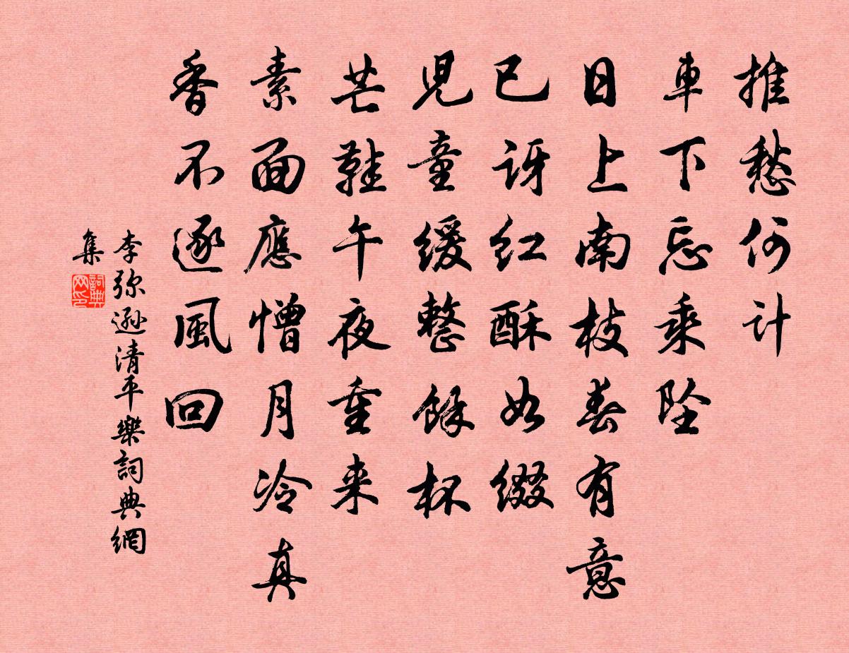 詩詞名句歷史字典書法欣賞書法字典國語詞典說文解字康熙字典古漢語字典標 題 作 者 詩 句 清平樂作者:李彌遜 朝代:宋代清平樂原文推愁何計。車下忘乘墜。日上南枝春有意。已訝紅酥如綴。兒童緩整餘杯。芒鞋午夜重來。素麵應憎月冷,真香不逐風回。詩詞問答問:清平樂的作者是誰?答:李彌遜問:清平樂寫於哪個朝代?答:宋代問:清平樂是什麼體裁?答:詞李彌遜清平樂書法欣賞清平樂書法作品詩詞推薦次韻正輔同游白水山蘇軾〔宋代〕只知楚越為天涯,不知肝膽非一家。此身如線自縈繞,左旋右轉隨繅車。誤拋山林入朝市,平地咫尺千褒斜。欲從陪諸先輩題名登春台臞軒即席次故相陳魏公韻劉克莊〔宋代〕遨頭唱首各高深,才薄難披作賦襟。已覺鶯花成一夢,尚貪螢雪競分陰。即今空負台萊意,宿昔曾賡殿閣吟。北望訴衷情(癸未團司歸舟中作)丘崈〔宋代〕東風罨岸進船難。酒醒篆香殘。不堪客里無緒,那更晚來寒。思往事,耿無眠。掩屏山。夜深人靜,何處一聲,月梅實楊公遠〔宋代〕累累青子綴枝丫,一味含酸軟齒牙。不獨曹軍資止渴,也曾調鼎佐商家。題和伯僑吳松雪霽圖三首羅椅〔宋代〕天上清流雲片,人間名勝吳松。兩賢相厄已甚,賴有斜陽半峰。山居雜詩九十首曹勛〔宋代〕大麥未救飢,小麥漸擢芒。此時農夫嘆,政阻接青黃。多畏頻雨澤,只欲暄晴光。農安吾亦安,朝夕祈蒼蒼。大寧以雨復留借榻老僧禪室李彌遜〔宋代〕乞得禪房半日留,臥看岩雨瀉清溝。浮雲豈是塵中物,又逐秋風天外游。子產不毀鄉校頌韓愈〔唐代〕我思古人,伊鄭之僑。以禮相國,人未安其教;游於鄉之校,眾口囂囂。或謂子產:“毀鄉校則止。”曰:“何患水調歌頭(次永康白使君韻)京鏜〔宋代〕與蜀有緣法,見我眼俱青。徵車到處,弦管無限作離聲。自笑四年留滯,漫說三邊安靜,分閫愧長城。一念天地闊湖州碧瀾堂陳堯佐〔宋代〕苕溪清淺霅溪斜,碧玉光寒照萬家。誰向月明終夜聽,洞庭漁笛隔蘆花。滿江紅 贈唯庵(原作府,據道藏改)宗道人李道純〔元代〕觀復工夫,要默默、存存固守。靜極中一動,便通玄牡。惚恍中間情合性,虛無谷里奇投偶。我今將、向上祖師機日暮龐謙孺〔宋代〕水底晃微霞,孤村古路叉。稻檐排凍雀,牛背落昏鴉。行客猶貪路,歸帆未到家。交遊書札斷,寂寞過天涯。次韻子由召伯埭見別三首秦觀〔宋代〕孤蓬短榜泝河流,無賴寒侵紫綺裘。召伯埭南春欲盡,為公重賦畔牢愁。邊城四時曲送盛瑋東玉之官平涼李廌〔宋代〕邊城冬,日日黃埃飛朔風。蔥嶺雪深埋古道,河岸冰厚與天通。可汗牙帳青海東,壯士卷甲趨奇功。公孫卿材名將道中觀戽水戲書張蘊〔宋代〕秧馬泥深繭犢閒,燭龍顧影桔槔間。尋常六月江南雨,不比君王帑藏慳。阻水泊舟竹山下黃庭堅〔宋代〕竹山蟲鳥朋友語,討論陰晴怕風雨。丁寧相教防禍機,草動塵驚忽飛去。提壺歸去意甚真,柳暗花濃亦半春。北風喜雨二首柬張使君劉克莊〔宋代〕一穟祥煙徹九關,六丁澒洞起泥蟠。皆雲端笏精虔際,不覺翻飄胖蠁間。侯念牧芻無德色,仆屍香火有慚顏。分明醉蓬萊(天寧節作)葛勝仲〔宋代〕望蔥蔥佳氣,虹渚祥開,斗樞光繞。析木天津,正靈暉騰照。鷺綴分班,象胥交貢,奉御觴清曉。玉殿寒輕,金徒二月二十四日楊廷秀郎中諸友約游西湖佘以小喻良能〔宋代〕都城西頭二月尾,湖水平堤縠紋起。南北山光罨畫中,淺深草色裙腰裡。群仙領客泛艅艎,黃帽劈波驚鰋鯉。中流溪橋朱繼芳〔宋代〕雲歸洞府痴龍睡,日澹山椒倦翼還。橋上行人橋下水,如今日夜不曾閒。名句推薦燕忙鶯懶芳殘,正堤上、柳花飄墜。章楶《水龍吟·燕忙鶯懶芳殘》 有個嬌嬈如玉,夜夜繡屏孤宿,閒抱琵琶尋舊曲,遠山眉黛綠。韋莊《謁金門·春漏促》 會桃花之芳園,序天倫之樂事李白《春夜宴桃李園序/春夜宴從弟桃花園序》 舉頭紅日白雲低,四海五湖皆一望。唐寅《伯虎扮乞兒,作詩騙酒》 解釋春風無限恨,沉香亭北倚闌乾。李白《清平調·其三》 送君如昨日,檐前露已團。江淹《古離別》 舊相思、偏供閒晝。吳文英《夜遊宮·春語鶯迷翠柳》 憶昔花間相見後,只憑縴手,暗拋紅豆。歐陽炯《賀明朝·憶昔花間相見後》 提三尺劍以定四海吳兢《貞觀政要·卷八·論貢賦》 伯牙鼓琴,志在高山佚名《伯牙鼓琴/伯牙絕弦》