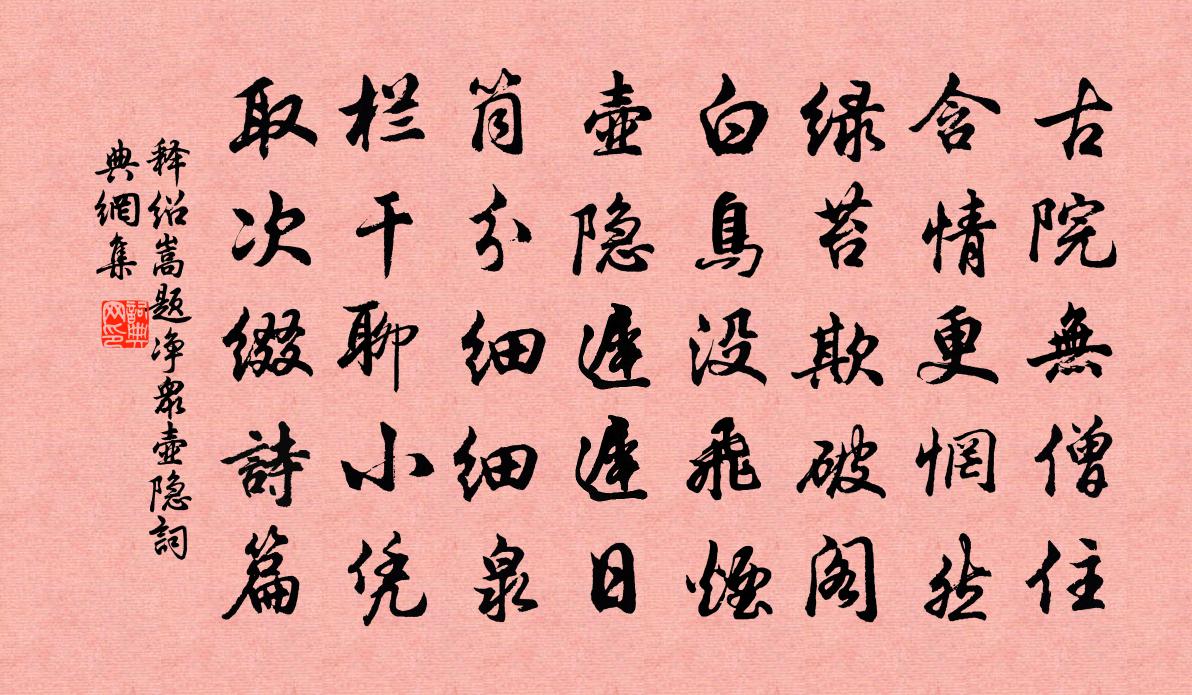 詩詞名句歷史字典書法欣賞書法字典國語詞典說文解字康熙字典古漢語字典標 題 作 者 詩 句 題淨眾壺隱作者:釋紹嵩 朝代:宋代題淨眾壺隱原文古院無僧住,含情更惘然。綠苔欺破閣,白鳥沒飛煙。壺隱遲遲日,筒分細細泉。欄乾聊小憑,取次綴詩篇。詩詞問答問:題淨眾壺隱的作者是誰?答:釋紹嵩問:題淨眾壺隱寫於哪個朝代?答:宋代釋紹嵩題淨眾壺隱書法欣賞題淨眾壺隱書法作品詩詞推薦蠅虎六言楊萬里〔宋代〕長有青蠅入夢,初無白額負嵎。傅業義皇網罟,齊名斗谷於菟。殘句:惟有南宮竇員外王禹偁〔宋代〕惟有南宮竇員外,為予垂淚閤門前。贈五官中郎將詩之三劉楨〔魏晉〕秋日多悲懷。感慨以長嘆。終夜不遑寐。敘意於濡翰。明燈曜閏中。清風淒已寒。白露塗前庭。應門重其關。四節亂後龍州送鄭郎中兼寄鄭侍御李洞〔唐代〕待車登疊嶂,經亂集鴒原。省壞蘭終潔,台寒柏有根。縣清江入峽,樓靜雪連村。莫隱匡山社,機雲受晉恩。清平樂(早起聞鶯)趙長卿〔宋代〕綺疏新曉。學語雛鶯巧。煙暖瑤階梧葉老。滿地東風芳草。少年不合風流。償他酒債花愁。望斷綠蕪春去,銷魂懶同姜濬題裴式微餘乾東齋劉長卿〔唐代〕世事終成夢,生涯欲半過。白雲心已矣,滄海意如何。藜杖全吾道,榴花養太和。春風騎馬醉,江月釣魚歌。散帙詩品二十四則·沈著司空圖〔唐代〕綠杉野屋,落日氣清。脫巾獨步,時聞鳥聲。鴻雁不來,之子遠行。所思不遠,若為平生。海風碧雲,夜渚月明。望湖方回〔宋代〕涌金樓下路,小艇尚堪呼。衰疾吾如此,湖山了不殊。興亡忽今昔,紅綠自蓮蒲。近說遷漁戶,窮鱗氣稍蘇。吳王墓王禹偁〔宋代〕惜哉吳王墓,秦帝嘗開破。應笑埋金玉,千年賈余禍。不待虎跡銷,已聞鮑車過。又是驪山頭,炎炎三月火。秋後五日應物無詩豈年志俱壯未解傷秋耶以詩陳師道〔宋代〕伏盡暑猶壯,秋生涼故遲。蟬吟接遠響,螢燭度深枝。歲半身仍健,年侵意自悲。情知寇公子,不作感秋詞。賀新郎 贈張子昭王結〔元代〕久坐林泉主。更忘機、結盟鷗鷺,逍遙容與。蕙帳當年誰喚起,黃鵠軒然高舉。渺萬里、雲霄何許。鶴爽憐君今猶宣城見杜鵑花 / 子規李白〔唐代〕蜀國曾聞子規鳥,宣城還見杜鵑花。一叫一迴腸一斷,三春三月憶三巴。秋日登越王樓獻於中丞李渥〔唐代〕越王曾牧劍南州,因向城隅建此樓。橫玉遠開千嶠雪,暗雷下聽一江流。畫檐先弄朝陽色,朱檻低臨眾木秋。徒學斑竹(得之湘流)元稹〔唐代〕一枝斑竹渡湘沅,萬里行人感別魂。知是娥皇廟前物,遠隨風雨送啼痕。蘇幕遮韓仙姑〔宋代〕不憂貧,不念富。大悟之人,開著波羅鋪。內心真知無價寶,欲識真如,正照菩提路。貪愛心,須除去。清靜法身董侍郎蒙泉書院戴復古〔宋代〕一室可忘老,四窗宜讀書。但教樽有酒,莫問食無魚。客子家何在,明朝歲又除。思歸徒自苦,安處即吾廬。苦雨釋寶曇〔宋代〕急雨涔涔日,春泥盎盎中。屐聲喧午枕,人語泣西風。斗米衾裯盡,鄰翁杼軸空。無因訴真宰,吾道竟須東。西江月佚名〔宋代〕至道不煩不遠,至人只在目前。淮王鍊石得沖天。嘆世已經千年。全在低心下人,事該緣分偶然。安爐致數盡周圓秋晚游普耀寺宋之問〔唐代〕薄暮曲江頭,仁祠暫可留。山形無隱霽,野色遍呈秋。荷覆香泉密,藤緣寶樹幽。平生厭塵事,過此忽悠悠。武陵春侯善淵〔元代〕太上混元真一*,瑩淨若瓊琚。清騰白雲不捲舒。明見有中無。冷淡靈光空蕩漾,變現總無拘。上下周流出六虛。名句推薦桑之未落,其葉沃若。佚名《氓》 忽然一夜清香發,散作乾坤萬里春。王冕《白梅》 唯器與名,不可以假人左丘明《左傳·成公·成公二年》 木謂之華,草謂之榮。佚名《爾雅·釋草》 酹酒蒼茫,倚歌平遠,亭上玉虹腰冷。吳文英《十二郎·垂虹橋》 俯瞰黃河小,高懸白雪清。胡秉正《詠賀蘭山》 願學秋胡婦,貞心比古松。李白《湖邊採蓮婦》 何事吟余忽惆悵,村橋原樹似吾鄉。王禹偁《村行·馬穿山徑菊初黃》 謝公最小偏憐女,自嫁黔婁百事乖。元稹《遣悲懷三首·其一》 今朝有酒今朝醉,明日愁來明日憂。佚名《增廣賢文·上集》