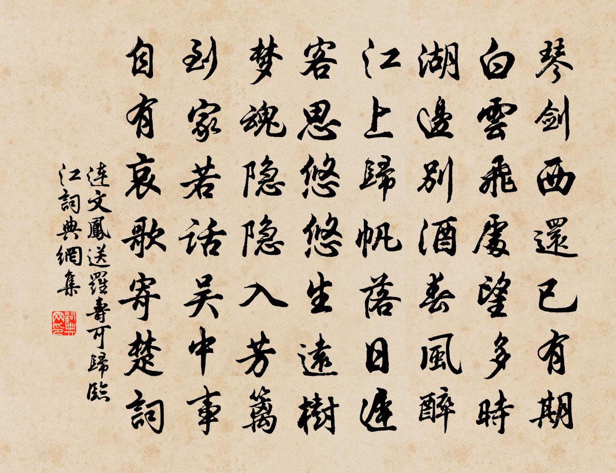詩詞名句歷史字典書法欣賞書法字典國語詞典說文解字康熙字典古漢語字典標 題 作 者 詩 句 送羅壽可歸臨江作者:連文鳳 朝代:宋代送羅壽可歸臨江原文琴劍西還已有期,白雲飛處望多時。湖邊別酒春風醉,江上歸帆落日遲。客思悠悠生遠樹,夢魂隱隱入芳籬。到家若話吳中事,自有哀歌寄楚詞。詩詞問答問:送羅壽可歸臨江的作者是誰?答:連文鳳問:送羅壽可歸臨江寫於哪個朝代?答:宋代連文鳳送羅壽可歸臨江書法欣賞送羅壽可歸臨江書法作品詩詞推薦送撫州周使君(即侍中之婿)盧綸〔唐代〕周郎三十餘,天子賜魚書。龍節隨雲水,金鐃動里閭。松聲三楚遠,鄉思百花初。若轉弘農守,蕭鹹事不如。句魯少師〔宋代〕百雉城頭難卻月,五雲峰頂欲乘風。僧房夜坐葉茵〔宋代〕四十二間廓底客,不知春向柳邊深。三旬禁足持僧戒,終日看書養道心。露草帶雲眠野鹿,風枝搖月唳幽禽。一塵經溱洧白居易〔唐代〕落日駐行騎,沉吟懷古情。鄭風變已盡,溱洧至今清。不見士與女,亦無芍藥名。憶京雒木芍藥三絕蘇籀〔宋代〕廬陵涑水攜參佐,媚紫嬌黃左與姚。何物山丹炫流俗,雒生懊惱慍蓬飄。梅花三絕鄭剛中〔宋代〕樹老根顧雪滿巔,令人頗憶魯公賢。同時柔脆皆僵仆,正色清芬獨凜然。為張都目益題爪哇王后將相圖方回〔宋代〕闍婆之國古來有,其人裸體蓬厥首。後來改號作爪哇,君僭稱王妻僭後。跣足露乳布纏腰,往往自妍不知醜。千島自詠白居易〔唐代〕須白面微紅,醺醺半醉中。百年隨手過,萬事轉頭空。臥疾瘦居士,行歌狂老翁。仍聞好事者,將我畫屏風。偈頌二十五首釋普岩〔宋代〕季春斬暄,鳥啼花笑。恆沙數見聞覺知,悉畢了了。次張節推山字韻詩留其行陳造〔宋代〕人瞻甫里歊埃外,詩著蘇州伯仲間。爽氣憑銷殘暑盡,鉤窗不用對西山。送賢師往瀘州為兩驅烏乞度牒錢頌黃庭堅〔宋代〕一鳳將兩雛,往乞五色羽。誰有大勢力,成此拮据心。若無出家心,勤苦難成就。但令發弘誓,誰不起慈悲瞎堂三句釋慧遠〔宋代〕我有不入驢耳句,日盈月昃未容呈。出門會得天平錯,未出門先舉向君。佳人春思王鎡〔宋代〕垂鬢不語立花陰,忽向東風淚滿襟。長記湖邊寒食節,柳絲曾折贈同心。題永樂韋少府廳壁岑參〔唐代〕大河南郭外,終日氣昏昏。白鳥下公府,青山當縣門。故人是邑尉,過客駐征軒。不憚煙波闊,思君一笑言。村墅劉過〔宋代〕俗子有錢村亦樂,秋田米熟歌牛角。三家村墅無官方,夜半呼盧笑聲謔。尋思我輩不如君,平生讀書徒苦辛。遭時近峽楊萬里〔宋代〕望峽初愁遠,當前忽不知。如何船進處,卻在棹停時。游虎丘王禹偁〔宋代〕樂天曾守郡,酷愛虎丘山。一年十二度,五馬來松關。我今方吏隱,心在雲水間。野性群麋鹿,忘機狎鷗鷳。乘興藻侄比課五言詩,已有意趣,老懷甚喜,因吟范成大〔宋代〕繩倚扶枵骨, * 閣瘁膚事疑償業債,形類窘辦拘。空劫真常體,浮生幻化軀。箇中元不二,無語對文殊。林大年殿直金輪院讀書有寄強至〔宋代〕仕到監州興漸多,人生四十未蹉跎。自嫌朱紱生門調,直要青雲取世科。新喜雁名傳日下,暫題試筆寄岩阿。山翁入南溪潘希白〔宋代〕沙頭落月照蓬低,杜宇誰家樹底啼。舟子不知人未起,載將殘夢上青溪。名句推薦生當復來歸,死當長相思。蘇武《留別妻》 雨恨雲愁,江南依舊稱佳麗。王禹偁《點絳唇·感興》 福在積善,禍在積惡。黃石公《素書·安禮》 一物失稱,亂之端也。夫德不稱位,能不稱官,賞不當功,罰不當罪,不祥莫大焉。荀子《荀子·正論》 嶺外音書斷,經冬復歷春。宋之問《渡漢江》 桃花水到報平渠,喜動新流見躍魚。黃圖安《閒詠二絕》 明眸皓齒誰復見,只有丹青余淚痕。蘇軾《虢國夫人夜遊圖》 飾美於外者,必其中無所有。王永彬《圍爐夜話·第一八八則》 丹漆不文,白玉不雕佚名《孔子家語·好生》 微暈嬌花濕欲流,簟紋燈影一生愁。納蘭性德《浣溪沙·詠五更和湘真韻》