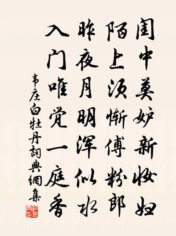 詩詞名句歷史字典書法欣賞書法字典國語詞典說文解字康熙字典古漢語字典標 題 作 者 詩 句 白牡丹作者:韋莊 朝代:唐代白牡丹原文閨中莫妒新妝婦,陌上須慚傅粉郎。昨夜月明渾似水,入門唯覺一庭香。詩詞問答問:白牡丹的作者是誰?答:韋莊問:白牡丹寫於哪個朝代?答:唐代問:白牡丹是什麼體裁?答:七絕問:韋莊的名句有哪些?答:韋莊名句大全韋莊白牡丹書法欣賞白牡丹書法作品注釋全唐詩:卷700-7詩詞推薦冷翠閣楊蟠〔宋代〕山杪一泉進,俯窺臨日崖。明珠不待拾,自濺入人來。葛常之犀表帖贊岳珂〔宋代〕文康之學導其源,文定之學濬其流。三世之帖俱傳於予家,其亦足以見植槐之志,而占良冶之裘也歟。曹山鄒毅〔宋代〕白雲深處到林丘,曹洞根深地更幽。聖隱岩前山杳杳,回龍亭下水悠悠。涼侵客枕秋風活,光抱禪關桂景秋。塵足偈頌一百零一首釋慧性〔宋代〕松蘿影裹,積翠堆中。白云為蓋,流泉作琴。隻影獨標岩上月,不知那個是知音。耳卓朔,頭蓬忪,抬眸鷂子過遼緣識宋太宗〔宋代〕大覺如來指,心王作智都。剎塵千萬億,定相不差殊。世事二首趙善括〔宋代〕世事今如此,惟堪一笑嘩。空持沖鬥劍,安得上天槎。遠信憑飛翼,流年付落花。平戎須大度,何必顧纖瑕。次韻宋永兄感舊五首黃公度〔宋代〕猶憶當年歌畫空,乘歡直欲舉千鍾。韶光半老不相識,樂事一生能幾逢。戲蝶狂蜂隨意好,閒花蔓草向人濃。當壚蘇州十詠其五閶門范仲淹〔宋代〕吳門聳閶闔,迎送每躋攀。一水帝鄉路,片雲師子山。落鴻漁釣外,斜柳別離間。白傅歸休處,盤桓幾厚顏。聽趙碧瀾操琴顧逢〔宋代〕彈來三尺桐,知用幾年功。聽到希聲處,涼生不語中。斷霞明似日,急雨過如風。曲罷爐香在,還思敏仲翁。晚到盩厔耆老家盧綸〔唐代〕老翁曾舊識,相引出柴門。苦話別時事,因尋溪上村。數年何處客,近日幾家存。冒雨看禾黍,逢人憶子孫。亂藤風入松(西山)秦觀〔宋代〕崇巒雨過碧瑤光。花木遞幽香。青冥杳靄無塵到,比龍宮、分外清涼。霽景一樓蒼翠。薰風滿壑笙簧。不妨終日此屏跡釋文珦〔宋代〕江湖厭風波,岩壑事幽屏。柴門絕往還,自閱朝昏景。日出煙霧消,鳥散松竹靜。須臾日西頹,餘暉在高嶺。短生晦日宴遊杜審言〔唐代〕日晦隨蓂莢,春情著杏花。解紳宜就水,張幕會連沙。歌管風輕度,池台日半斜。更看金谷騎,爭向石崇家。王正自輓詩陳長方〔宋代〕登門才幾日,祖奠亦噓欷。毀譽付公是,游談空昨非。厲階由怨府,意廣數危機。世味元如許,休嗟志願違。送蕭穎士赴東府,得離字長孫鑄〔唐代〕大德詎可擬,高梧有長離。素懷經綸具,昭世猶安卑。落日去關外,悠悠隔山陂。我心如浮雲,千里相追隨。皇太子宴玄圃宣猷堂有令賦詩陸機〔魏晉〕三正迭紹。洪聖啟運。自昔哲王。先天而順。群辟崇替。降及近古。黃暉既渝。素靈承祜。乃眷斯顧。祚之宅土。句王濯〔唐代〕絕壁高千丈,清泉應六時。南高峰楊蟠〔宋代〕日氣層層秀,連山萬丈孤。崔嵬天上影,一半入江湖。詠漁父徐僑〔宋代〕只把絲綸當酒金,世間萬事不關心。月移篷影醒未醒,人在蘆花深更深。贈詩僧無可〔唐代〕寒山對水塘,竹葉影侵堂。洗藥冰生岸,開門月滿床。病多身又老,枕倦夜兼長。來謁吾曹者,呈詩問否臧。名句推薦我行殊未已,何日復歸來。宋之問《題大庾嶺北驛》 虛牖傳寒柝,孤燈照絕編。歐陽詹《除夜長安客舍》 惆悵南朝事,長江獨至今。劉長卿《秋日登吳公台上寺遠眺》 猶喜閏前霜未下,菊邊依舊舞身輕。司空圖《白菊三首》 堪笑楚江空渺渺,不能洗得直臣冤。文秀《端午》 翠華想像空山里,玉殿虛無野寺中。杜甫《詠懷古蹟五首·其四》 剛待不思量,吹一片、簫聲過牆。項鴻祚《太常引·客中聞歌》 疑行無成,疑事無功。商鞅《商君書·更法》 世有伯樂,然後有千里馬。千里馬常有,而伯樂不常有。韓愈《雜說四·馬說》 春田龜坼苗不滋,猶賴立春三日雪。王士禎《春不雨》