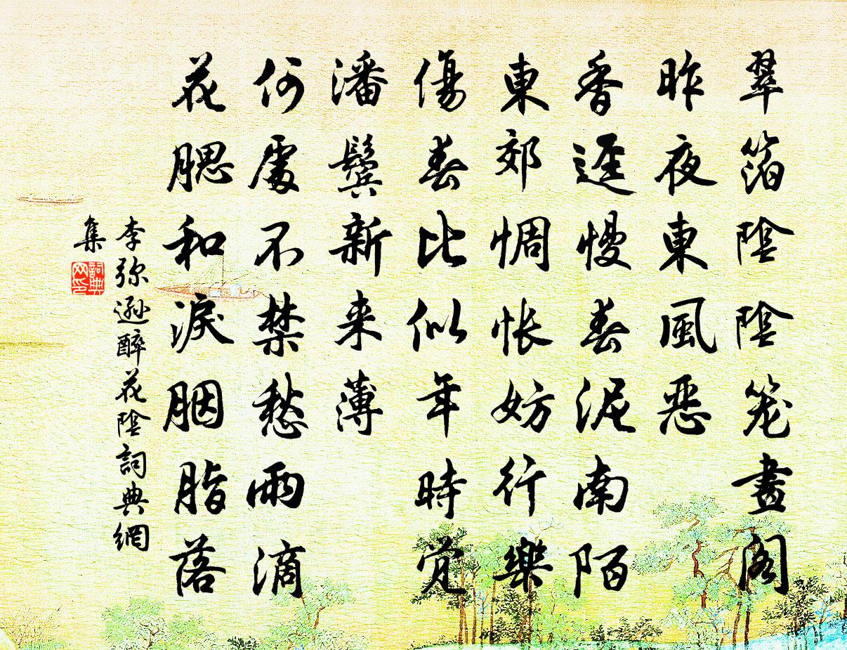 詩詞名句歷史字典書法欣賞書法字典國語詞典說文解字康熙字典古漢語字典標 題 作 者 詩 句 醉花陰作者:李彌遜 朝代:宋代醉花陰原文翠箔陰陰籠畫閣。昨夜東風惡。香逕慢春泥,南陌東郊,惆悵妨行樂。傷春比似年時覺。潘鬢新來薄。何處不禁愁,雨滴花腮,和淚胭脂落。詩詞問答問:醉花陰的作者是誰?答:李彌遜問:醉花陰寫於哪個朝代?答:宋代問:醉花陰是什麼體裁?答:詞李彌遜醉花陰書法欣賞醉花陰書法作品詩詞推薦晚泊李流謙〔宋代〕薄霧初迷岸,微風早繫舟。山青只欲遠,江闊不勝流。取酒深深酌,將詩緩緩謳。去家萬餘里,聊此散千憂。南歌子(謝送菊花糕)王邁〔宋代〕家裡逢重九,新篘熟濁醪。弟兄乘興共登高。右手茱杯、左手笑持螯。官里逢重九,歸心切大刀。美人痛飲讀離騷送謝子肅提舉寺丞二首楊萬里〔宋代〕誰遣孤舟蘘笠翁,強隨桃李競春風。交情頃刻雲翻手,古意淒涼月印空。可笑能詩今謝朓,也能載酒過楊雄。待渠田父吟五首葉茵〔宋代〕家家柳色染輕黃,柳外歸鴉噪夕陽。屋角有煙青不斷,粞兒飯熟淡齏香。酬所知張詠〔宋代〕皇風浩蕩吹天地,天下英髦連鳳起。海鵬一飛一萬里,三尺微風何足謂。再扈從游小山二首過孟玉〔宋代〕仙闕岧嶢紫翠凝,蓬萊樓觀喜重登。桫欏樹老當金殿,靈壁峰高倚玉繩。輦路苔深龍瓮古,瀛洲風靜海波澄。分明瓦店雨作四首楊萬里〔宋代〕詩人長怨沒詩材,天遣斜風細雨來。領了詩材還又怨,問天風雨幾時開。寄倪好問趙蕃〔宋代〕問訊永州倪戶曹,別來歲月已滔滔。賢居幕府定餘暇,舟過浯溪今幾遭。頌出次山微自顯,詩成太史貶無褒。因來游洞霄宮樓鑰〔宋代〕宿雨頑雲撥不開,紫霄佳處訪樓台。青山九鎖固奇甚,古洞一深如此哉。拔地千林俱秀潤,擎天一柱最崔嵬。出山紅菊蔡戡〔宋代〕為愛東籬九日黃,孤標正色占秋光。如何卻被胭脂污,也學人間時世妝。和襲美女墳湖(即吳王葬女之所)陸龜蒙〔唐代〕水平波淡繞回塘,鶴殉人沉萬古傷。應是離魂雙不得,至今沙上少鴛鴦。送覺師西遊乞御書李覯〔宋代〕累聖多材藝,留神翰墨間,皇墳非小道,玉版遍藏山。上士持三學,西行謁九關。奎華如可捧,歸伴白雲閒。福慶寺毛滂〔宋代〕欄乾倚盡赤旃檀,盧橘花開秀巘寒。會取虛庵留客意,小窗疏日上 * 。大風二首趙蕃〔宋代〕頗愛峽江江上山,幾回陶冶付毫端。眼中誰為善圖貌,貌與桐江相併看。商翁劉克莊〔宋代〕初隱靈芝處,終逃小橘中。誰言秦法密,網不得商翁。贈地理游曉山王炎〔宋代〕仙人白鶴渺煙霞,野日昏昏噪暮鴉。城外土饅同此味,牆頭濁酒且須賒。堪輿信有玄通理,造物能私富貴家。宜爾客中蔡槃〔宋代〕舉酒吟詩易,居貧作客難,一番思世事,半日倚闌乾。霜重竹籬薄,風高石徑寒。無言搔短髮,望眼到長安。上元口號呈莫令三首趙蕃〔宋代〕一琖華燈直萬錢,誰知下里取薪然。綺紈照耀輿台體,民得褐衣猶破穿。夕秀軒郭章〔宋代〕柳暗西津橋步斜,長川練練若縈蛇。晚來不為東風惡,與子留連待月華。緣識宋太宗〔宋代〕五色雲煙聚十洲,蓬萊海浪壓鰲頭。化成宮闕遙瞻禮,大眾神仙玉洞游。名句推薦裊裊兮秋風,洞庭波兮木葉下。屈原《九歌·湘夫人》 鵬北海,鳳朝陽。辛棄疾《鷓鴣天·送廓之秋試》 竹柏皆凍死,況彼無衣民。白居易《村居苦寒》 桃李務青春,誰能貫白日。李白《長歌行》 盡道豐年瑞,豐年事若何羅隱《雪》 綠遍山原白滿川,子規聲里雨如煙。翁卷《鄉村四月》 薄霧濃雲愁永晝,瑞腦銷金獸。李清照《醉花陰·薄霧濃雲愁永晝》 和平處事,勿矯俗為高;正直居心,勿設機以為智。王永彬《圍爐夜話·第六五則》 江深竹靜兩三家,多事紅花映白花。杜甫《江畔獨步尋花七絕句》 凡與敵戰,若我勝彼負,不可驕惰,當日夜嚴備以待之。佚名《百戰奇略·第六卷·勝戰》