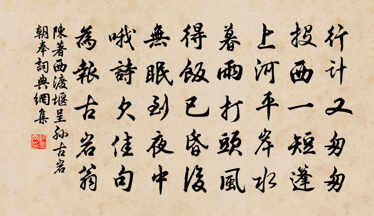 詩詞名句歷史字典書法欣賞書法字典國語詞典說文解字康熙字典古漢語字典標 題 作 者 詩 句 西渡堰呈孫古岩朝奉作者:陳著 朝代:宋代西渡堰呈孫古岩朝奉原文行計又匆匆,投西一短篷。上河平岸水,暮雨打頭風。得飯已昏後,無眠到夜中。喔詩欠佳句,為報古岩翁。詩詞問答問:西渡堰呈孫古岩朝奉的作者是誰?答:陳著問:西渡堰呈孫古岩朝奉寫於哪個朝代?答:宋代陳著西渡堰呈孫古岩朝奉書法欣賞西渡堰呈孫古岩朝奉書法作品詩詞推薦山亭柳王哲〔元代〕春景精研。花草新鮮。夏日赫綻紅蓮。忽然秋早至,見山亭、柳上鳴蟬。飈地朔風來到,飄白雪、遍山川。百歲光高其佩指頭畫虎乾隆〔清代〕鐵嶺老人閻李流,畫不用筆用指頭,縱橫揮灑饒奇趣,晚年手法彌警遒。為吾染指畫蒼虎,氣橫幽壑寒颼颼,落墨絕句五首劉子翬〔宋代〕目送孤鴻獨倚樓,晚風吹淚更橫流。蕉花落處蠻煙碧,六十三程是白州。錦香囊歐陽修〔宋代〕一寸相思無著處。甚夜長難度。燈花前、幾轉寒更,桐葉上、數聲秋雨。真箇此心終難負。況少年情緒。已交共、題石魚佚名〔宋代〕諸公討未決。朝忌其事夕失功。詎可因循守常法。人心感處是天心,至誠解使金石裂。形勢不宜久冷落,鼓作須及好事近趙聞禮〔宋代〕小枕夢催閒,飛雨時鳴高屋。掛起西窗人靜,聽春禽聲續。鴨塘溪綠漲輕痕,煙柳媚新綠。誰伴瘦筇尊酒,弄岩泉知府提舉訪求前守凌公遺蹟忽於庭廡雨壓複壁趙蕃〔宋代〕不因風雨壁寧隳,雅志安和萬言中。乃知複壁遮防意,是謂知公亦愛公。送徐榷院奉戶檄之九江等郡鄧林〔宋代〕中邊瑩徹似冰壺,空盡時情意氣殊。已向銅龍梯要路,又隨玉馱駕征塗。風生湓浦江流急,雲滿康廬夜月孤。竭到海上春夕旅懷寄左偃李中〔唐代〕柳過清明絮亂飛,感時懷舊思淒淒。月生樓閣雲初散,家在汀洲夢去迷。發白每慚清鑒啟,酒醒長怯子規啼。北山登少陵原,望秦中諸川,太原王至德妙用呂溫〔唐代〕少陵最高處,曠望極秋空。君山噴清源,脈散秦川中。荷鍤自成雨,由來非鬼工。如何盛明代,委棄傷豳風。涇灞宿木蘭院皮日休〔唐代〕木蘭院裡雙棲鶴,長被金鉦聒不眠。今夜宿來還似爾,到明無計夢雲泉。行香子王哲〔元代〕五鼓才成,土德行香。偏能將、四象包藏。如今盡顯,聚在中央。沒白歸青,紅歸黑,不歸黃。已證空虛,便出昆相和歌辭。棹歌行徐堅〔唐代〕棹女飾銀鉤,新妝下翠樓。霜絲青桂楫,蘭栧紫霞舟。水落金陵曙,風起洞庭秋。扣船過曲浦,飛帆越回流。影入張右相生日二首曹勛〔宋代〕玉律歌無射,金風下四蓂。三台丞相位,一德將臣星。弼亮時師表,文章世典刑。百神扶大手,遠業慶千齡。客中戲書釋紹嵩〔宋代〕杖屨行崖表,江山故作妍。捫蘿懷鳥道,踏石過溪泉。野濕禾中露,秋明樹外天。白頭何所恨,隨處一欣然。太湖石白居易〔唐代〕煙翠三秋色,波濤萬古痕。削成青玉片,截斷碧雲根。風氣通岩穴,苔文護洞門。三峰具體小,應是華山孫。桂江曹松〔唐代〕未識佳人尋桂水,水雲先解傍壺觴。筍林次第添斑竹,雛鳥參差護錦囊。乳洞此時連越井,石樓何日到仙鄉。如飛諸人頗有和余百梅詩者各賦一首劉克莊〔宋代〕盤屈高才入短章,卷中字字挾冰霜。直探寶藏珠盈掬,倒瀉金莖露浣腸。鐵笛一枝橫夜月,水沉三舍避天香。妙年以王家酒寄陳北山得二絕句誚酒味不如舊日之劉克莊〔宋代〕醇醪易入醉人鄉,勁酒難逢醒者嘗。王媼區區真小黠,隨時增損甕中方。夏初湖村雜題陸游〔宋代〕寒泉自換菖蒲水,活火閒煎橄欖茶。自是閒人足閒趣,本無心學野僧家。名句推薦里仁為美,擇不處仁,焉得知?孔子弟子《論語·里仁篇》 那年離別日,只道住桐廬。劉采春《囉嗊曲·那年離別日》 柴門聞犬吠,風雪夜歸人。劉長卿《逢雪宿芙蓉山主人》 同天下之利者,則得天下;擅天下之利者,則失天下。姜子牙《六韜·文韜·文師》 著葉滿枝翠羽蓋,開花無數黃金錢杜甫《秋雨嘆三首》 請君看取東流水,方識人間別意長。嚴仁《鷓鴣天·惜別》 燈火萬家城四畔,星河一道水中央。白居易《江樓夕望招客》 攀出牆朵朵花,折臨路枝枝柳。關漢卿《一枝花·不伏老》 長於春夢幾多時,散似秋雲無覓處。晏殊《木蘭花·燕鴻過後鶯歸去》 君子內省不疚,無惡於志。君子之所不可及者,其唯人之所不見乎。子思《中庸·第三十三章》