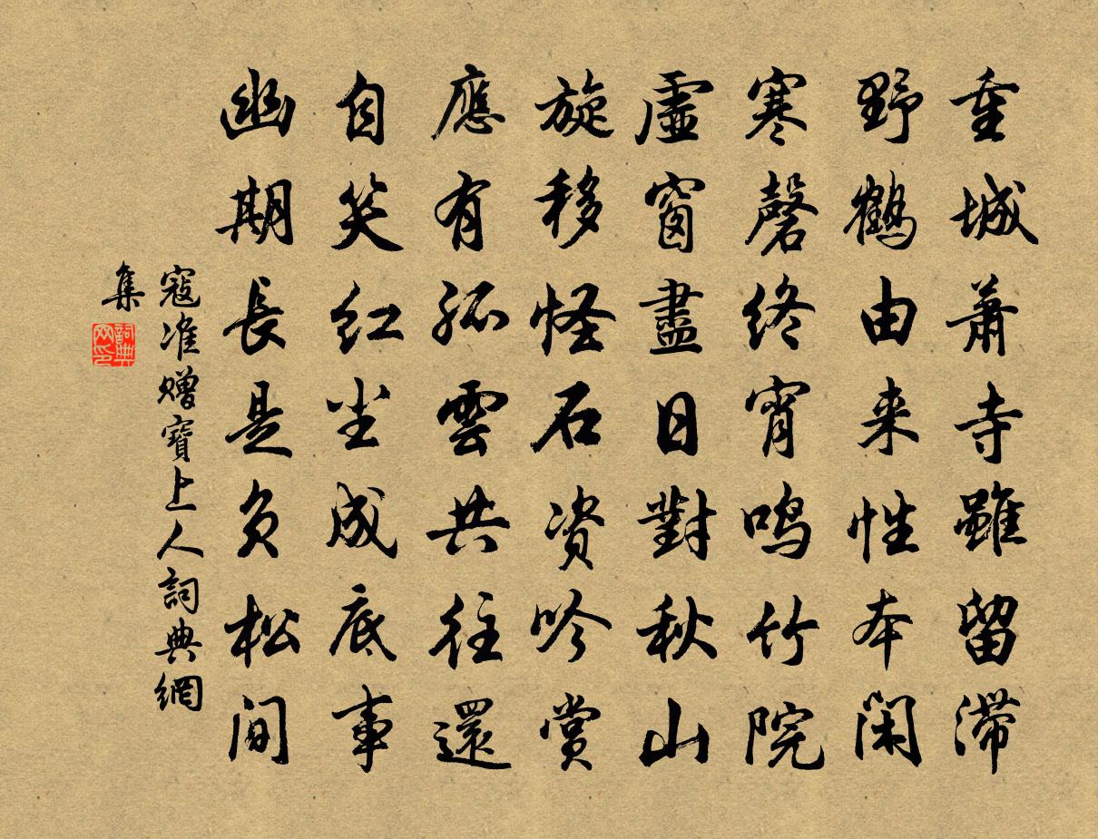 詩詞名句歷史字典書法欣賞書法字典國語詞典說文解字康熙字典古漢語字典標 題 作 者 詩 句 贈寶上人作者:寇準 朝代:宋代贈寶上人原文重城蕭寺雖留滯,野鶴由來性本閒。寒磬終宵鳴竹院,虛窗盡日對秋山。旋移怪石資吟賞,應有孤雲共往還。自笑紅塵成底事,幽期長是負松間。詩詞問答問:贈寶上人的作者是誰?答:寇準問:贈寶上人寫於哪個朝代?答:宋代問:寇準的名句有哪些?答:寇準名句大全寇準贈寶上人書法欣賞贈寶上人書法作品詩詞推薦庭竹祝慶夫〔宋代〕庭前修竹長琅玕,任是隆冬不畏寒。戛玉篩金承雨露,亭亭青翠拂雲端。生日病腹疾書事方回〔宋代〕今年六十二,棄官八年矣。生世業已休,來日凜無幾。孰謂嘗作郡,旦暮窘薪米。少時頗豪宕,晚乃窮如此。此事別林和卿二首曾豐〔宋代〕甚矣身如幻,加之跡若浮。妙山孤倜儻,良友貳遨遊。水挾月涵夜,風推雨郁秋。物來吾不拒,隨件以詩收。次季奕見懷趙蕃〔宋代〕雨腳何其厚,雲頭不易空。病憐山叟甚,詩喜故人通。慰藉殷勤里,吟喔悵望中。地爐無熱火,林屋但鳴風。頌古五十七首釋道昌〔宋代〕前面有虎,元來是汝。更問如何,冤苦冤苦。再次韻贈張德恭陳造〔宋代〕同門誰定肯論朋,拙似苕鳩懶似僧。病減不辭詩語拙,歸來少貸客愁凝。老欺鬢髮絲千丈,糴仰官倉日五升。台合柳枝詞何希堯〔唐代〕大堤楊柳雨沉沉,萬縷千條惹恨深。飛絮滿天人去遠,東風無力系春心。送覺新上人還越周弼〔宋代〕古越多精藍,名僧遞相接。青林瓶盂聚,丹壑樓觀疊。今乘秋濤便,莫待寒雨涉。何處聞鳴蛩,虛廊掃黃葉。歲暮感懷貽馮同年中允王禹偁〔宋代〕謫宦商於郡,閒門車馬稀。塵侵書命筆,香散入朝衣。燒盡峰巒出,霜晴木葉飛。夜來天欲雪,寒夢不成歸。聞道林諸友嘗茶因有寄齊己〔唐代〕槍旗冉冉綠叢園,穀雨初晴叫杜鵑。摘帶岳華蒸曉露,碾和松粉煮春泉。高人夢惜藏岩里,白硾封題寄火前。應念題妙覺寺朱利賓〔宋代〕有民增吏役,無事愛僧家。不憚山頭路,來煎飯後茶。鍾魚雖闃寂,松竹自交加。掃榻須盤薄,吾生會有涯。木蘭花慢 混一後賦劉秉忠〔元代〕望乾坤浩蕩,曾際會,好風雲。想漢鼎初成,唐基始建,生物如春。東風吹遍原野,但無言、紅綠自紛紛。花月流劍浦思歸王克功〔宋代〕韶華客里一番老,自嘆此生行路多。獨上危樓望鄉國,闌乾倚遍奈愁何。古柳枝頭啼暮鴉,清明時候又天涯。故園苔蘚山歌顧況〔唐代〕野人夜夢江南山,江南山深松桂閒。野人覺後長嘆息,帖蘚粘苔作山色。閉門無事任盈虛,終日欹眠觀四如。一如酬王檀見寄喻鳧〔唐代〕馳心棲杳冥,何物比清泠。夜月照巫峽,秋風吹洞庭。酬難塵鬢皓,坐久壁燈青。竟晚蒼山詠,喬枝有鶴聽。和永叔晉祠詩梅堯臣〔宋代〕并州古來稱近胡,山雄氣壯民足儲。山根晉水發源處,平若皎監潛決疏。漸流漸急不可測,以至{左浮右虎}{左水調歌頭李昴英〔宋代〕野趣在城市,崛起此台高。誰移蓬島,馮夷夜半策靈鰲。十萬人家甃碧,四面峰巒涌翠,遠岫拍銀濤。插漢筆雙塔滿庭芳(八月十六日醴陵作)袁去華〔宋代〕雨送涼來,風將雲去,晚天千頃玻璃。嬋娟依舊,出海較些遲。玉兔秋毫可數,疏星外、烏鵲南飛。今何夕,空浮桂管童謠佚名〔唐代〕大蟲來。周公禮殿李石〔宋代〕蜀侯作頖錦水湄,先聖先師同此室。巍然夫子據此座,殿以周公名自昔。聖人現金兩如一家,均是周人先後出。想名句推薦平生塞北江南,歸來華發蒼顏。辛棄疾《清平樂·獨宿博山王氏庵》 一樹斜陽蟬更咽,曾綰灞陵離別納蘭性德《淡黃柳·詠柳》 城邊有古樹,日夕連秋聲。李白《沙丘城下寄杜甫》 歸志寧無五畝園,讀書本意在元元。陸游《讀書》 不識廬山真面目,只緣身在此山中。蘇軾《題西林壁》 君知否,是山西將種,曾系詩盟。劉過《沁園春·張路分秋閱》 松雪飄寒,嶺雲吹凍,紅破數椒春淺。周密《獻仙音·吊雪香亭梅》 見兔而顧犬,未為晚也;亡羊而補牢,未為遲也。劉向《戰國策·楚四·莊辛謂楚襄王》 卜鄰近三徑,植果盈千樹。孟浩然《田園作》 他人有心,予忖度之。佚名《巧言》