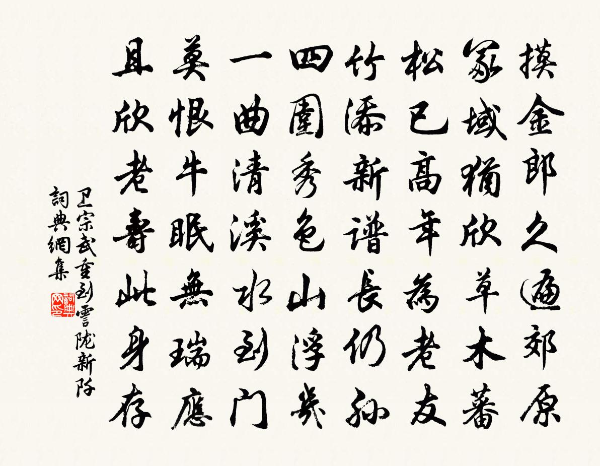 詩詞名句歷史字典書法欣賞書法字典國語詞典說文解字康熙字典古漢語字典標 題 作 者 詩 句 重到霅隴新阡作者:衛宗武 朝代:宋代重到霅隴新阡原文摸金郎久遍郊原,冢域猶欣草木蕃。松已高年為老友,竹添新譜長仍孫。四圍秀色山浮幾,一曲清溪水到門。莫恨牛眠無瑞應,且欣老壽此身存。詩詞問答問:重到霅隴新阡的作者是誰?答:衛宗武問:重到霅隴新阡寫於哪個朝代?答:宋代衛宗武重到霅隴新阡書法欣賞重到霅隴新阡書法作品詩詞推薦山中與幽人對酌李白〔唐代〕兩人對酌山花開,一杯一杯復一杯。我醉欲眠卿且去,明朝有意抱琴來。依韻酬葛秋岩陶體四首釋文珦〔宋代〕東原風正和,西山氣尤爽。坐我於其中,此心日以廣。腰間豈須重,眼下何必兩。顏原陋巷居,歌有金石響。秦望山二首曾豐〔宋代〕六國爭雄已坐擒,更何所望此登臨。真成馭鶴乘鸞去,未愜秦皇好大心。習家池舊臨官路今路改而東池半入驛吏引自桑項安世〔宋代〕步入荒林問習家,江吞古岸入平沙。枯池舊歲猶生藕,病柳新年尚著芽。草上醉人眠未醒,桑間游女笑相遮。東風贈天台王處士林嵩〔唐代〕深隱天台不記秋,琴台長別一何愁。茶煙岩外雲初起,新月潭心釣未收。映宇異花叢發好,穿松孤鶴一聲幽。赤城一翦梅 蔡州作王寂〔元代〕懸瓠城高百尺樓。荒煙村落,疏雨汀洲。天涯南去更無州。坐看兒童,蠻語吳謳。過盡賓鴻過盡秋。歸期杳杳,歸多麗(七夕游蓮盪作)葛立方〔宋代〕破波光如鏡,三翼輕舟。對雨余、重岩疊嶂,何妨影墮清流。望芙蕖、渺然如海,張雲錦、掩映汀洲。出水奇姿,賦得青城山歌,送楊、杜二郎中赴蜀軍錢起〔唐代〕蜀山西南千萬重,仙經最說青城峰。青城嶔岑倚空碧,遠壓峨嵋吞劍壁。錦屏雲起易成霞,玉洞花明不知夕。星台莫春張弋〔宋代〕日日雨霏霏,閉門無所知。謾尋花發處,已過絮飛時。替紙蠶生遍,修巢燕立危。但催人老去,羞作送春詩。憶江南·歌起處王世貞〔明代〕歌起處,斜日半江紅。柔綠篙添梅子雨,淡黃衫耐藕絲風。家在五湖東。雜曲歌辭。自君之出矣李康成〔唐代〕自君之出矣,弦吹絕無聲。思君如百草,撩亂逐春生。大中後進士語佚名〔唐代〕欲得命通,問瑝嵎都雍。春秋戰國門少孺周曇〔唐代〕寶貴親仁與善鄰,鄰兵何要互相臻。螳螂定是遭黃雀,黃雀須防挾彈人。挽座主吳倅許月卿〔宋代〕菊翁去後菊園荒,壽不如花儘自香。進學解成誰貝錦,題輿字濕已黃粱。眾流出壑三秋暮,明月照松千仞罔。冷落歲暮嘆三首張耒〔宋代〕寥寥野空禾黍荒,北風日夜鳴空桑。南山碧天青不極,渺渺洛水東流長。山空水寒行客少,鴻雁飛急天初霜。蕭蕭賢者之孝二百四十首路隋林同〔宋代〕兒貌酷類父,母知兒不知。可堪引鏡照,正復益兒悲。登台遇雨避於山亭晚霽乃歸陸游〔宋代〕溽暑不堪蝸舍陋,瘦藤扶我上危台。搏禽俊鶻橫空去,卷雨狂風掠野來。壯觀深知化工妙,幽尋卻蹋夕陽回。悠然寄題永嘉林氏真意堂洪咨夔〔宋代〕萱草逕庭寂,橘花窗戶明。我惟天地性,物自古今情。玄酒無窮味,朱弦不盡聲。道從涵泳得,寬作讀書程。西囿盧橘數株方窮秋蕭索間詫然敷榮薿薿可愛廖行之〔宋代〕寂寂園林秋暮時,可人盧橘玉英胎。祗應籬菊返魂在,滿慰金行得意歸。僵立凍峰攢翅白,霏微繁李綴枝稀。天公瑞鷓鴣方岳〔宋代〕中元過後恰三朝。因甚庭闈喜氣飄。李謫若非當此夕,甲生應是在今宵。滿斟綠醑歌檀口,慢拍紅牙舞柳腰。富貴名句推薦燎沉香,消溽暑。周邦彥《蘇幕遮·燎沉香》 來掃千山雪,歸留萬國花。袁枚《春風》 金谷園中柳,春來似舞腰。李益《上洛橋》 何處它年寄此生,山中江上總關情。虞集《院中獨坐》 君子以遏惡揚善,順天休命。佚名《易傳·象傳上·大有》 無限枝頭好顏色,可憐開不為重陽。丘浚《詠菊》 斜髻嬌娥夜臥遲,梨花風靜鳥栖枝。唐寅《美人對月》 樵人歸欲盡,煙鳥栖初定。孟浩然《宿業師山房期丁大不至 / 宿業師山房待丁大不至》 謝公宿處今尚在,淥水蕩漾清猿啼李白《夢遊天姥吟留別/夢遊天姥山別東魯諸公》 城裡夕陽城外雪,相將十里異陰晴。王守仁《次韻陸僉憲元日春晴》