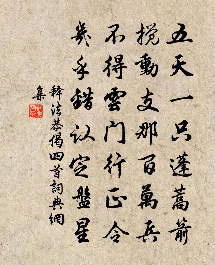 詩詞名句歷史字典書法欣賞書法字典國語詞典說文解字康熙字典古漢語字典標 題 作 者 詩 句 偈四首作者:釋法恭 朝代:宋代偈四首原文五天一隻蓬蒿箭,攪動支1|1那百萬兵。不得雲門行正令,幾乎錯認定盤星。詩詞問答問:偈四首的作者是誰?答:釋法恭問:偈四首寫於哪個朝代?答:宋代釋法恭偈四首書法欣賞偈四首書法作品詩詞推薦別鄂倅趙有孚章采〔宋代〕芙蓉花下把離觴,江漢秋生夕漲涼。騕褭神駒行地急,迢遙仙鶴去天長。蜀兵未解星辰赤,淮哨將來日月黃。近世覽翠亭王輝〔宋代〕亭倚古台邊,環亭翠蔚然。芝蘭深雨露,梧竹老風煙。窗戶香霏濕,闌乾爽氣連。登臨忘世慮,逸興發林泉。栽竹劉學箕〔宋代〕綠筠移種不多時,添我溪南一段奇。會看明年春雨後,滿林頭角籜龍兒。游曾無慍園可賦者十餘處其大莫如樂山次莫如曾豐〔宋代〕一身鵝超忽白雲鵝表,雙眼鵝低回白苹鵝杪。沙隨風卷黃莫涯,莫與天連青未了。摩詰胸中幾麋丸,詩寫其真更留仙船岩劉邊〔宋代〕仙舟等奡湯,萬仞架雲表。木石渾莫分,風雨能不朽。恐因堯年水,艚櫂寄嚴實。獨勝夜壑藏,有力莫負走。奈何維摩贊釋子益〔宋代〕俗氣不除,病在一默。扁鵲盧醫,醫你不得。又次銛朴翁韻四首陳造〔宋代〕聞為詩魔掩貝多,辭源袞袞倒洪河。遙知傳誦日千紙,淇上高唐無善歌。偈頌一百三十六首釋惟一〔宋代〕六年雪嶺竟無成,練得身形似鶴形。盡謂見明星悟道,何曾悟道見明星。入山何富,出山何貧,知心能幾人。頌古四十五首釋慧遠〔宋代〕家常侍客勸三杯,鴆酒不消吃一盞。當時裂破夜叉頭,頂門突出醯羅眼。題楊康功醉道士石秦觀〔宋代〕黃冠初飲何人酒,徑醉頹然不知久。風吹化石楚山阿,藤蔓纏身蘚封口。常隨白鶴亦飛去,但有衣冠同不朽。異物芳草渡(別恨)周邦彥〔宋代〕昨夜裡,又再宿桃源,醉邀仙侶。聽碧窗風快,珠簾半卷疏雨。多少離恨苦。方留連啼訴。鳳帳曉,又是匆匆,獨和孫廷平坦嵩山十首秋原菊韓維〔宋代〕秋風原上菊,百草同蕃滋。霜至草已死,黃花始離離。君子不獨異,顯晦顧有時。謹和老人春行洪咨夔〔宋代〕抗疏明時效伏伽,一歸七度試春紗。柔風綠遍庭前草,細雨紅催陌上花。惠遠買來猶濁酒,趙州吃去只粗茶。回頭題潔齋書院姚穎〔宋代〕鵝湖鹿洞兩優遊,吾道南來誰與儔。鄮地傳心化已洽,堇山遺教澤長留。空階向日春風度,棟宇凌雲化雨周。聲譽鄭檢法久病將起以詩速之項安世〔宋代〕詩人貪睡費朝衙,臥看香奩暉碧鴉。已向中秋阻丹桂,莫教重九負黃花。曈曈初日關農事,冉冉閒情近物華。已辨論語絕句一百首張九成〔宋代〕三千七十固多哉,好學如何獨有回。若論不遷並不貳,更無人向此中來。八月二十五日聞布新條舒岳祥〔宋代〕民命無魂鹿,烹庖幾日休。紛紛渾未悟,炯炯為深憂。並和隣舂相,分漁步網收。聊為目前計,翁碗汲新篘。醉筆劉克莊〔宋代〕無復戴花能起舞,有時逢曲尚流涎。年齡絳縣老人長,交友青州從事賢。司業送錢真愛我,侍郎取榼亦欣然。吾詩送郎使君赴郢州司空曙〔唐代〕使君持節去,雲水滿前程。楚寺多連竹,江檣遠映城。登樓向月望,賽廟傍山行。若動思鄉詠,應貽謝步兵。答劉錄事夜月懷湘西友人見寄喻鳧〔唐代〕相逢仍朔漠,相問即波濤。江思葦花折,笛聲關月高。簿書君閱倦,章句我吟勞。竟夕空憑閣,長河漴石壕。名句推薦見而不見,聞而不聞,知而不知。韓非及後人《韓非子·主道》 岸旁青草長不歇,空中白雪遙旋滅。岑參《熱海行送崔侍御還京》 莫笑他人老,終須還到老。佚名《增廣賢文·上集》 夫尚儉者開福之源,好奢者起貧之兆。魏收《魏書·列傳·卷五十》 淒淒歲暮風,翳翳經日雪。陶淵明《癸卯歲十二月中作與從弟敬遠》 魯酒不可醉,齊歌空復情。李白《沙丘城下寄杜甫》 綠竹入幽徑,青蘿拂行衣。李白《下終南山過斛斯山人宿置酒》 仕宦當作執金吾,娶妻當得陰麗華。范曄《後漢書·本紀·皇后紀上》 松竹翠蘿寒,遲日江山暮。曹組《卜運算元·蘭》 霰淅瀝而先集,雪粉糅而遂多。謝惠連《雪賦》