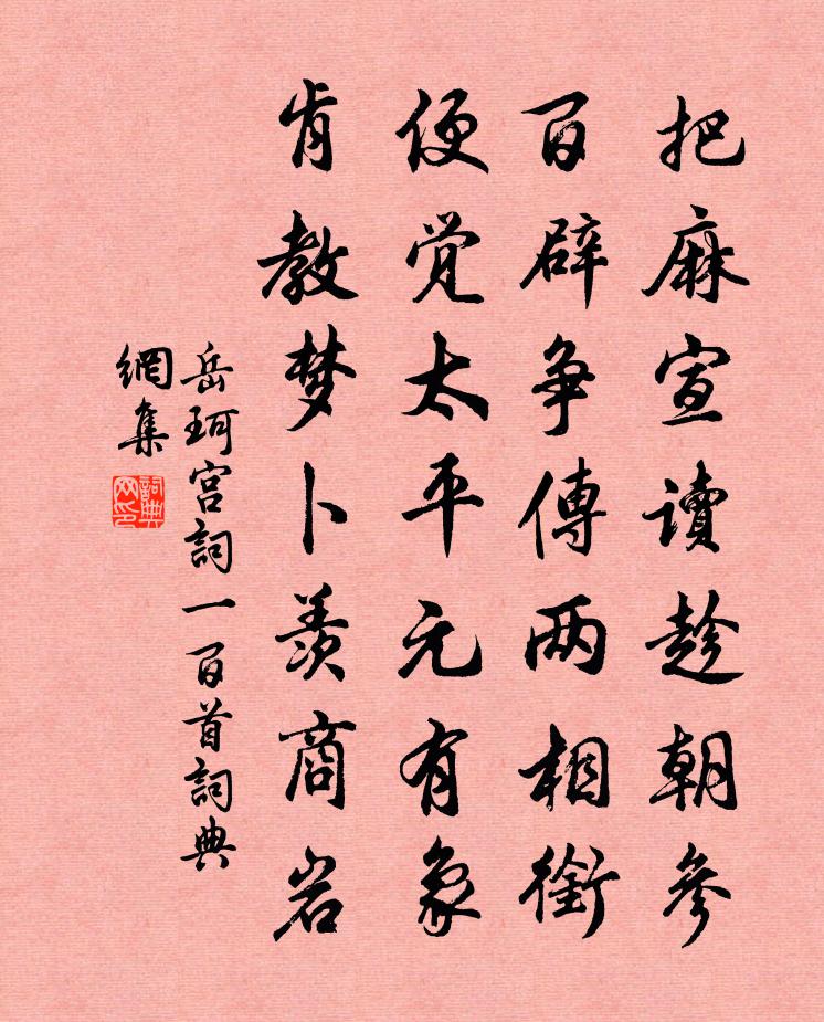 詩詞名句歷史字典書法欣賞書法字典國語詞典說文解字康熙字典古漢語字典標 題 作 者 詩 句 宮詞一百首作者:岳珂 朝代:宋代宮詞一百首原文把麻宣讀趁朝參,百辟爭傳兩相銜。便覺太平元有象,肯教夢卜羨商岩。詩詞問答問:宮詞一百首的作者是誰?答:岳珂問:宮詞一百首寫於哪個朝代?答:宋代岳珂宮詞一百首書法欣賞宮詞一百首書法作品詩詞推薦和趙主簿韻賦梅花項安世〔宋代〕曷日鮮晴后土乾,川原遠近踏春寒。詩人不問花開落,為雨為霞總愛看。郴江百詠並序題春波亭阮閱〔宋代〕數葉荷衣一短藜,春波亭上倚餘暉。無人會得詩中畫,憑盡闌乾又獨歸。與劉左史同別楊少卿於南郊舟中用宋兵部韻魏了翁〔宋代〕玉龍老子訪仙鶴,沖佑散人歸瑞烏。俗事只今長刺促,可人自昔費招呼。憂時恨不百子駿,背我寧堪二大夫。艤櫂寓嘆陸游〔宋代〕江上霜風透弊袍,區區無奈簿書勞。衰遲始憶壯遊樂,仕宦更知歸臥高。人怪羊裘忘富貴,我從牛儈得賢豪。俗間寄僧野和尚貫休〔唐代〕鳥外更誰親,諸峰即四鄰。白頭寒枕石,青衲爛無塵。橡栗堆行徑,猿猴繞定身。儻然重結社,願作掃壇人。瑞鶴仙佚名〔宋代〕五雲翔碧漢。望卿月光中,老人星現。黃堂盛華宴。慶君恩、許奉安輿游衍。鹿城壯觀。幸王母、人間得見。望君西山亭留題張昱〔元代〕馬頭曾為使君回,北望新亭道路開。於越地形緣海盡,句吳山色過江來。英雄有恨余湖水,天地忘懷入酒杯。珍重相和歌辭。王昭君令狐楚〔唐代〕錦車天外去,毳幕雲中開。魏闕蒼龍遠,蕭關赤雁哀。女冠子尹鶚〔唐代〕雙成伴侶,去去不知何處。有佳期,霞帔金絲薄,花冠玉葉危。懶乘丹鳳子,學跨小龍兒。叵耐天風緊,挫腰肢。年少春遊真山民〔宋代〕錦袍朱帶玉花驄,著意追歡紫陌東。只道春風屬楊柳,不知楊柳有秋風。送張能父天定赴瑞州教二首王邁〔宋代〕大學穿楊巧,青春斫桂榮。心燈傳老宿,文印授諸生。德履華嵩重,襟期玉雪清。君王他日問,張姓複其名。哭女樊四十韻(虢州長史時作)元稹〔唐代〕逝者何由見,中人未達情。馬無生角望,猿有斷腸鳴。去伴投遐徼,來隨夢險程。四年巴養育,萬里硤回縈。病是尚書打球小驄步驟最奇因有所贈徐夤〔唐代〕善價千金未可論,燕王新寄小龍孫。逐將白日馳青漢,銜得流星入畫門。步驟最能隨手轉,性靈多恐會人言。桃花黯淡院賈青〔宋代〕溪聲灘外急,草色兩中深。客意自南北,山光無古今。歸興呈吳夢祥華岳〔宋代〕魚雁音書少,關山夢寐遙。對花思粉面,遇□□□□。喜意鵲應報,歸心馬更驕。西風綽鞭{左革右登},飛□□六言四首方回〔宋代〕樓中老子無事,座上梅花盛開。閉目不閉鼻孔,暗□□□自來。奉和九月九日登慈恩寺浮圖應制孫佺〔唐代〕應節萸房滿,初寒菊圃新。龍旗煥辰極,鳳駕儼香闉。蓮井偏宜夏,梅梁更若春。一忻陪雁塔,還似得天身。菩薩蠻(又名子夜歌、巫山一片雲、重疊金)李曄〔唐代〕登樓遙望秦宮殿,茫茫只見雙飛燕。渭水一條流,千山與萬丘。遠煙籠碧樹,陌上行人去。安得有英雄,迎歸大內浣溪沙范成大〔宋代〕十里西疇熟稻香。槿花籬落竹絲長。垂垂山果掛青黃。濃霧知秋晨氣潤,薄雲遮日午陰涼。不須飛蓋護戎裝。題左翰林三友亭黃棨〔宋代〕勁節虬枝水月香,軒前高坐勝尋常。翰林此意知非淺,曾有堅心秉雪霜。名句推薦所作福德不應貪著。鳩摩羅什譯《金剛經·不受不貪》 湖清霜鏡曉,濤白雪山來。李白《送友人尋越中山水》 兄弟不睦,則子侄不愛顏之推《顏氏家訓·兄弟篇》 斷送一生憔悴,只銷幾個黃昏。趙令畤《清平樂·春風依舊》 爾我同心,曰金蘭;朋友相資,日麗澤。程登吉《幼學瓊林·卷二·朋友賓主》 虛牖傳寒柝,孤燈照絕編。歐陽詹《除夜長安客舍》 紅臉青腰,舊識凌波女。晏幾道《蝶戀花·笑艷秋蓮生綠浦》 話說多,不如少。惟其是,勿佞巧。李毓秀《弟子規·信》 十五入漢宮,花顏笑春紅。李白《怨歌行》 今宵剩把銀釭照,猶恐相逢是夢中。晏幾道《鷓鴣天·彩袖殷勤捧玉鍾》