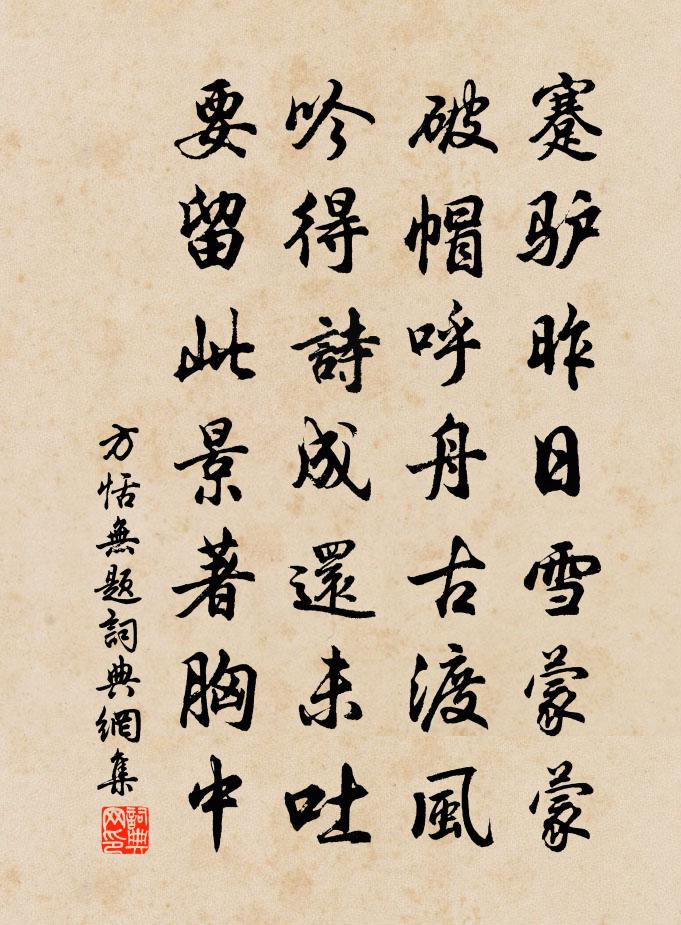 詩詞名句歷史字典書法欣賞書法字典國語詞典說文解字康熙字典古漢語字典標 題 作 者 詩 句 無題作者:方恬 朝代:宋代無題原文蹇驢昨日雪蒙蒙,破帽呼舟古渡風。吟得詩成還未吐,要留此景著胸中。詩詞問答問:無題的作者是誰?答:方恬問:無題寫於哪個朝代?答:宋代方恬無題書法欣賞無題書法作品詩詞推薦謝芝峰交隨惠茶釋智愚〔宋代〕揀芽芳字出山南,真味那容取次參。曾向松根烹瀑雪,至今齒頰尚余甘。臨別送張諲入蜀李頎〔唐代〕出門便為客,惘然悲徒御。四海維一身,茫茫欲何去。經山復歷水,百恨將千慮。劍閣望梁州,是君斷腸處。孤雲句羅壽可〔宋代〕追思往事真堪恨,誤卻南兵是蔡州。西郊養疾聞暢校書有新什見贈久佇不至先寄此詩韋應物〔唐代〕養病愜清夏,郊園敷卉木。窗夕含澗涼,雨餘愛筠綠。披懷始高詠,對琴轉幽獨。仰子游群英,吐詞如蘭馥。還聞上嚴州烏石灘楊萬里〔宋代〕人語相聞數尺間,其如灘惡費人夢。已從灘下過灘上,卻立前船待後船。臨安送鄭左藏陳宓〔宋代〕還家香稻薦新紅,樂歲佳辰定不空。綠醑好邀山月飲,紫鱗長與海朝通。不妨香火尋高士,只恐經綸欠此翁。我亦自在白居易〔唐代〕杲杲冬日光,明暖真可愛。移榻向陽坐,擁裘仍解帶。小奴捶我足,小婢搔我背。自問我為誰,胡然獨安泰?安泰次韻和人豐歲蘇轍〔宋代〕風雨迎寒欲勞農,今年真不負元豐,蓋藏共荷官無擾,眠食安知帝有功。草笠黃冠將蠟祀,羔羊朋酒亦豳風。請君錦堂春(壽李仁山)王夢應〔宋代〕淺幘分秋,涼尊試月,西風未雁猶蟬。看芙蓉影里,綠鬢年年。日上雲帆壓海,塵清玉馬行天。更煙樓鳳舉,風幕公舍春日丁謂〔宋代〕綠楊垂線草鋪茵,觸處煙光舉眼新。一品也須妨白髮,千金莫惜買青春。鶯聲圓滑堪清耳,花艷鮮明欲照身。獨向荊江漁父竹枝詞九首和夔師□侍郎韻為荊師範項安世〔宋代〕六歌漁父壽詩聲,一聲聲帶竹枝情。大枝千歲不改色,小枝孫子滿林生。水龍吟莫崙〔宋代〕鏡寒香歇江城路,今度見春全懶。斷雲過雨,花前歌扇,梅邊酒盞。離思相欺,萬絲縈繞,一襟銷黯。但年光暗換并州道中杜牧〔唐代〕行役我方倦,苦吟誰復聞?戍樓春帶雪,邊角暮吹雲。極目無人跡,回頭送雁群。如何遣公子?高臥醉醺醺。和顏長官百詠客路朱繼芳〔宋代〕屈指秋風與雁期,陽關西去到何時。側身一望腸堪斷,天似穹廬碧四垂。小孤二絕句李流謙〔宋代〕瑤池縹緲是吾家,嘗憶清觴覆九霞。霧鬢風鬢天下飾,可須人世俗鉛華。開禧元年四月自中都挈家還鄉寓居城南十二月汪莘〔宋代〕築室深山裹,開門古澗邊。月高猿子叫,日晏虎兒眠。帶雪挑黃菜,敲冰取碧泉。不知居士樂,空受俗人憐。贈汲郡太守詩陸雲〔魏晉〕我有好爵。既成爾服。入贊崇華。遂登帷幄。時文聖宰。天祚方谷。朔風徽止。鴻漸雲岳。即事虞儔〔宋代〕春工投老日駸駸,閱遍芳菲又綠陰。不復椅梧傾宿鳳,幾番淮海變鳴禽。太阿自撫為知己,焦尾誰彈莫賞音。高下訣別書卓文君〔兩漢〕春華競芳,五色凌素,琴尚在御,而新聲代故!錦水有鴛,漢宮有木,彼物而新,嗟世之人兮,瞀於淫而不悟!朱蘇州十詠其十南園范仲淹〔宋代〕西施台下見名園,百草千花特地繁。欲問吳王當日事,後來桃李若為言。名句推薦竹深樹密蟲鳴處,時有微涼不是風。楊萬里《夏夜追涼》 甘井近竭,招木近伐。墨子《墨子·01章 親士》 策馬自沙漠,長驅登塞垣。高適《薊中作》 貞女貴徇夫,捨生亦如此。孟郊《列女操 / 烈女操》 沉恨細思,不如桃杏,猶解嫁東風。張先《一叢花令·傷高懷遠幾時窮》 秋木萋萋,其葉萎黃,有鳥處山,集於苞桑。王昭君《怨詞》 積於不涸之倉者,務五穀也管仲《管子·牧民》 晝出耘田夜績麻,村莊兒女各當家。范成大《夏日田園雜興·其七》 君懷良不開,賤妾當何依。曹植《明月上高樓》 微雨如酥,草色遙看近卻無。蘇軾《減字木蘭花·鶯初解語》