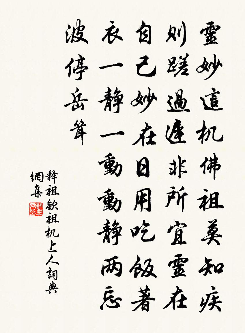詩詞名句歷史字典書法欣賞書法字典國語詞典說文解字康熙字典古漢語字典標 題 作 者 詩 句 祖機上人作者:釋祖欽 朝代:宋代祖機上人原文靈妙這機,佛祖莫知。疾則蹉過,遲非所宜。靈在自己,妙在日用。吃飯著衣,一靜一動。動靜兩忘,波停岳聳。詩詞問答問:祖機上人的作者是誰?答:釋祖欽問:祖機上人寫於哪個朝代?答:宋代釋祖欽祖機上人書法欣賞祖機上人書法作品詩詞推薦丹鳳吟(越調)周邦彥〔宋代〕迤邐春光無賴,翠藻翻池,黃蜂游閣。朝來風暴,飛絮亂投簾幕。生憎暮景,倚牆臨岸,杏靨夭斜,榆錢輕薄。晝金陵懷古六首周文璞〔宋代〕孫伯陵頭水最悲,蔣侯廟下月來遲。夜深行客心驚恐,猿掛晉朝楓樹枝。偈三十五首釋祖珍〔宋代〕高而無上不可極,淵而無下不可測。欲知步步透雙關,看取清風生兩腋。戲題山庵二首劉克莊〔宋代〕曾批龍鱗捋虎鬚,君恩天大偶全軀。入華胥國渾成夢,移太行山得許愚。無劍拄頤但樵服,有衾覆首勝珠襦。他時次韻和王道損風雨戲寄梅堯臣〔宋代〕小雪才過大雪前,蕭蕭風雨紙窗穿。而今共唱新詞飲,切莫相邀薄暮天。除夜言懷,兼贈張常侍白居易〔唐代〕三百六旬今夜盡,六十四年明日催。不用嘆身隨日老,亦須知壽逐年來。加添雪興憑氈帳,消殺春愁付酒杯。唯恨挽故知容州朝請陶公危彪〔宋代〕世態紛紛等觸蠻,惟公打透利名關。八州不作士衡夢,三徑謾為元亮還。苦淡平生安北巷,孤高一節照西山。想應柳州陶弼〔宋代〕黃柑無樹井無泉,思柳亭中雨愴然。蠻越至今猶畫像,聖唐何事獨遺賢。途中有懷溫庭筠〔唐代〕驅車何日閒,擾擾路岐間。歲暮自多感,客程殊未還。亭皋汝陽道,風雪穆陵關。臘後寒梅發,誰人在故山。洋州三十景灙泉亭鮮于侁〔宋代〕泉聲日琮琤,泉水深浩渺。可愛主人心,亭中狎鷗鳥。已亥雜詩 141龔自珍〔清代〕鐵師講經門徑仄,鐵詩念佛頗得力。似師畢竟勝狂禪,師今遟我蓮花國。詠史詩黃河胡曾〔唐代〕博望沉埋不復旋,黃河依舊水茫然。沿流欲共牛郎語,只得靈槎送上天。秋懷十首韓元吉〔宋代〕朝行佛屋魚千里,暮借僧床鷯一枝。窗下秋蟲解人意,似憐羈客伴喔詩。落花圖詠唐寅〔明代〕春盡愁中與病中,花枝遭雨又遭風。鬢邊舊白增新白,樹底深紅換淺紅。漏刻已隨香篆了,錢囊甘為酒杯空。向來渡江杜甫〔唐代〕春江不可渡,二月已風濤。舟楫欹斜疾,魚龍偃臥高。渚花兼素錦,汀草亂青袍。戲問垂綸客,悠悠見汝曹。送和北虜使馬戴〔唐代〕路始陰山北,迢迢雨雪天。長城人過少,沙磧馬難前。日入流沙際,陰生瀚海邊。刀環向月動,旌纛冒霜懸。逐獸汾陰十首真宗〔宋代〕至誠旁過,柔祗格思。奉以琮幣,致誠在茲。句李燾〔宋代〕平蓋神仙院,武陽山水鄉。登九華山曹清〔宋代〕浮生江路水茫茫,彭澤原非令故鄉。為訪子明尋玉澗,也因太白宿雲房。詩摩古壁搜遺韻,井煉丹砂辨舊方。從此丹景山至德寺徐氏〔唐代〕周回雲水游丹景,因與真妃眺上方。晴日曉升金晃曜,寒泉夜落玉丁當。松梢月轉琴棲影,柏徑風牽麝食香。虔炸名句推薦槐陰別院宜清晝,入座春風秀。美人圖子阿誰留。元好問《虞美人·槐陰別院宜清晝》 詩言志,歌永言佚名《尚書·虞書·舜典》 梧桐更兼細雨,到黃昏、點點滴滴。李清照《聲聲慢·尋尋覓覓》 立身成敗,在於所染吳兢《貞觀政要·卷十·論慎終》 江涵秋影雁初飛,與客攜壺上翠微。杜牧《九日齊山登高》 火冷燈稀霜露下,昏昏雪意雲垂野。蘇軾《蝶戀花·密州上元》 歌舞尊前,繁華鏡里,暗換青青發。薩都剌《念奴嬌·登石頭城次東坡韻》 山無陵,江水為竭。佚名《上邪》 士有妒友,則賢交不親。荀子《荀子·大略》 忽然一夜清香發,散作乾坤萬里春。王冕《白梅》