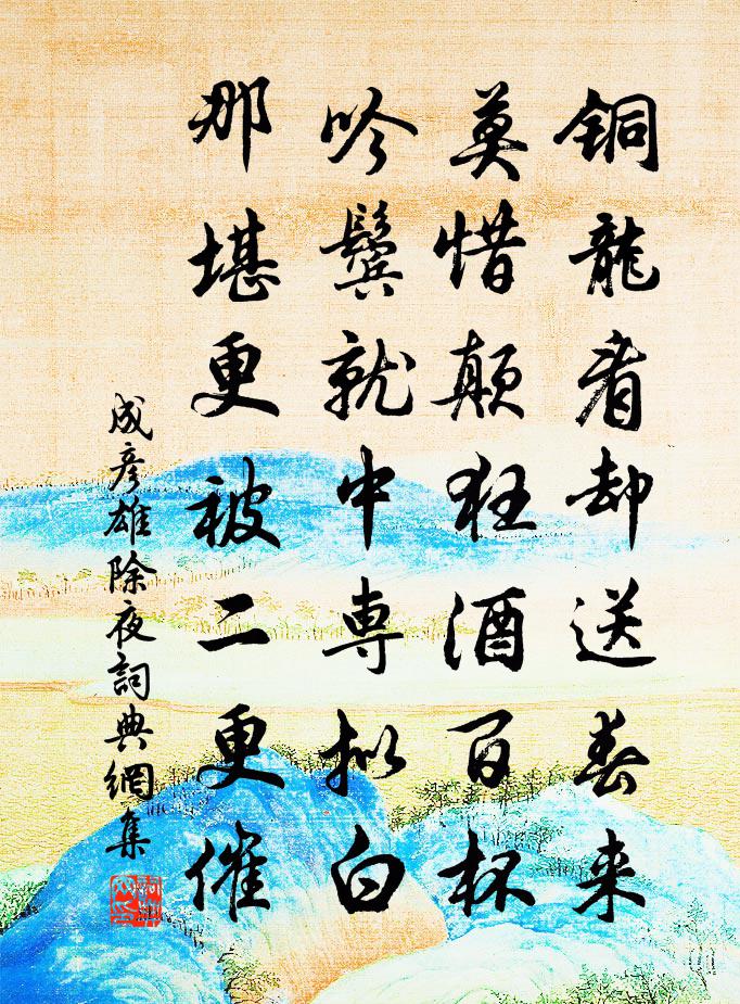 詩詞名句歷史字典書法欣賞書法字典國語詞典說文解字康熙字典古漢語字典標 題 作 者 詩 句 除夜作者:成彥雄 朝代:唐代除夜原文銅龍看卻送春來,莫惜顛狂酒百杯。吟鬢就中專擬白,那堪更被二更催。詩詞問答問:除夜的作者是誰?答:成彥雄問:除夜寫於哪個朝代?答:唐代問:除夜是什麼體裁?答:七絕成彥雄除夜書法欣賞除夜書法作品注釋全唐詩:卷759-16詩詞推薦生查子 獨游西岩辛棄疾〔宋代〕青山招不來,偃蹇誰憐汝。歲晚太寒生,喚我溪邊住。山頭明月來,本在高高處。夜夜入清溪,聽讀離騷去。落梅風貫雲石〔元代〕新秋至,人乍別,順長江水流殘月。悠悠畫船東去也!這思量起頭兒一夜。太白興禪師贊釋智遇〔宋代〕泯跡深藏一塢雲,仙官何事苦相親。修行不是無靈驗,懶作關門閒戶人。游九鎖楊邁〔宋代〕尋幽向何處,大滌山水好。九峰拔奇秀,下有松石老。白雲和紅葉,滿徑無人掃。振衣長風生,一笑登木杪。南鄉子(監田渡)李洪〔宋代〕掛席泛安流。細雨斜風到渡頭。萬疊雲鬟真似畫,雲州。自古詩人幾個游。旌旆去悠悠。別駕無功愧食浮。卻憶五自喜陸游〔宋代〕身閒僊不遠,食足富何加。庭臥長生犢,園開手種花。狂歌聲跌宕,醉草筆橫斜。八十明年是,衰殘豈復嗟。水調歌頭(丙戌壽蜀閫)李曾伯〔宋代〕千一載英傑,百二國山河。提封幾半宇宙,萬里仗天戈。十乘晉軍旗鼓,三歲秦關扃鎖,地利屬人和。位次功第一題百五叔自得齋壁林泳〔宋代〕矮屋匡床兩鬢皤,逍遙委順奈吾何。三千世界醉鄉大,十二時中靜坐多。疎懶對人如素隱,等閒出語似禪和。便須挽歐陽幼立彭龜年〔宋代〕行輩多名宦,鄉閭愛老成。身名了無恨,韋布卻為榮。久矣追談笑,居然隔死生。朔風搜宇宙,何日閉佳城。過淮河宿闞石有感文天祥〔宋代〕北征垂半年,依依只南土。今晨渡淮河,始覺非故宇。江鄉已無家,三年一羈旅。龍翔在何方,乃我妻子所。昔也題義門胡氏華林書院呂文仲〔宋代〕世世趨庭列雁行,煙蘿泉石繞書堂。分題月下聯書版,聚宴花前獻壽觴。旌表異恩逢新地,隱居佳致接仙鄉。因知七月十一日雨後夜坐戶外觀月陸游〔宋代〕浴罷淡無事,岸幘臨前軒。雷雨始退散,雲月相吐吞。風蟬斷還續,枝間終夕喧。露螢闔復開,熠熠綴草根。殘暑東籬雜題陸游〔宋代〕終日在東籬,清和適此時。鶯聲如妒夢,花氣欲撩詩。愛客茶新蹍,留僧飯別炊。流年隨手過,不覺近期頤。走筆和張功父玉照堂十絕楊萬里〔宋代〕老見千花眼便昏,憶梅長為賦招魂。只今身住西湖上,不羨淮南嶺上村。小築釋善珍〔宋代〕小築林間憩倦遊,莫年幽事勝西州。松陰猿嘯閒行藥,日夕鴉歸獨倚樓。山色齊奴開步障,葉聲楚客賦悲秋。一生宮詞三十三首曹勛〔宋代〕潮隨春漲雪千尋,南越山藏暗浪深。欲識錢塘兩回汛,便如萬國奉君心。秋晚園中二首孫岩〔宋代〕籬落園秋色,株梢罥晚暉。菊花供麴盡,桐葉飼魚稀。游西洞庭山葉茵〔宋代〕漫遊三十載,屐齒暈蒼苔。兩地無多里,一生能幾回。洞深龍未蟄,丹熟灶無灰。已覺忘身世,松梢有鶴來。瑣窗寒張炎〔宋代〕絕響矣。余悼之玉笥山,所謂長歌之哀,過於痛哭。斷碧分山,空簾剩月,故人天外。香留酒殢。蝴蝶一生花里。得家問羅公升〔宋代〕萬里平泉夢,誰憐創業難。已聞封樹伐,敢惜賜書殘。鷹擊寧論飽,烏棲不奈寒。長平門下客,知復幾任字。名句推薦那堪旅館經殘臘,只把空書寄故鄉。王建《維揚冬末寄幕中二從事》 父耕原上田,子劚山下荒。聶夷中《田家》 碧湖湖上柳陰陰,人影澄波浸,常記年時歡花飲。楊果《小桃紅·碧湖湖上柳陰陰》 祿不患其不來,患祿來,而不能無愧其祿。王永彬《圍爐夜話·第四四則》 停車數行日,勸酒問回期。王建《送人游塞》 滄浪之水清兮,可以濯我纓;佚名《滄浪歌》 還作江南會,翻疑夢裡逢。戴叔倫《客夜與故人偶集 / 江鄉故人偶集客舍》 澹月梨花,借夢來、花邊廊廡。史達祖《解佩令·人行花塢》 路入南中,桄榔葉暗蓼花紅。歐陽炯《南鄉子·路入南中》 村北村南布穀忙,村前村後稻花香。方向《詠儋耳二首》