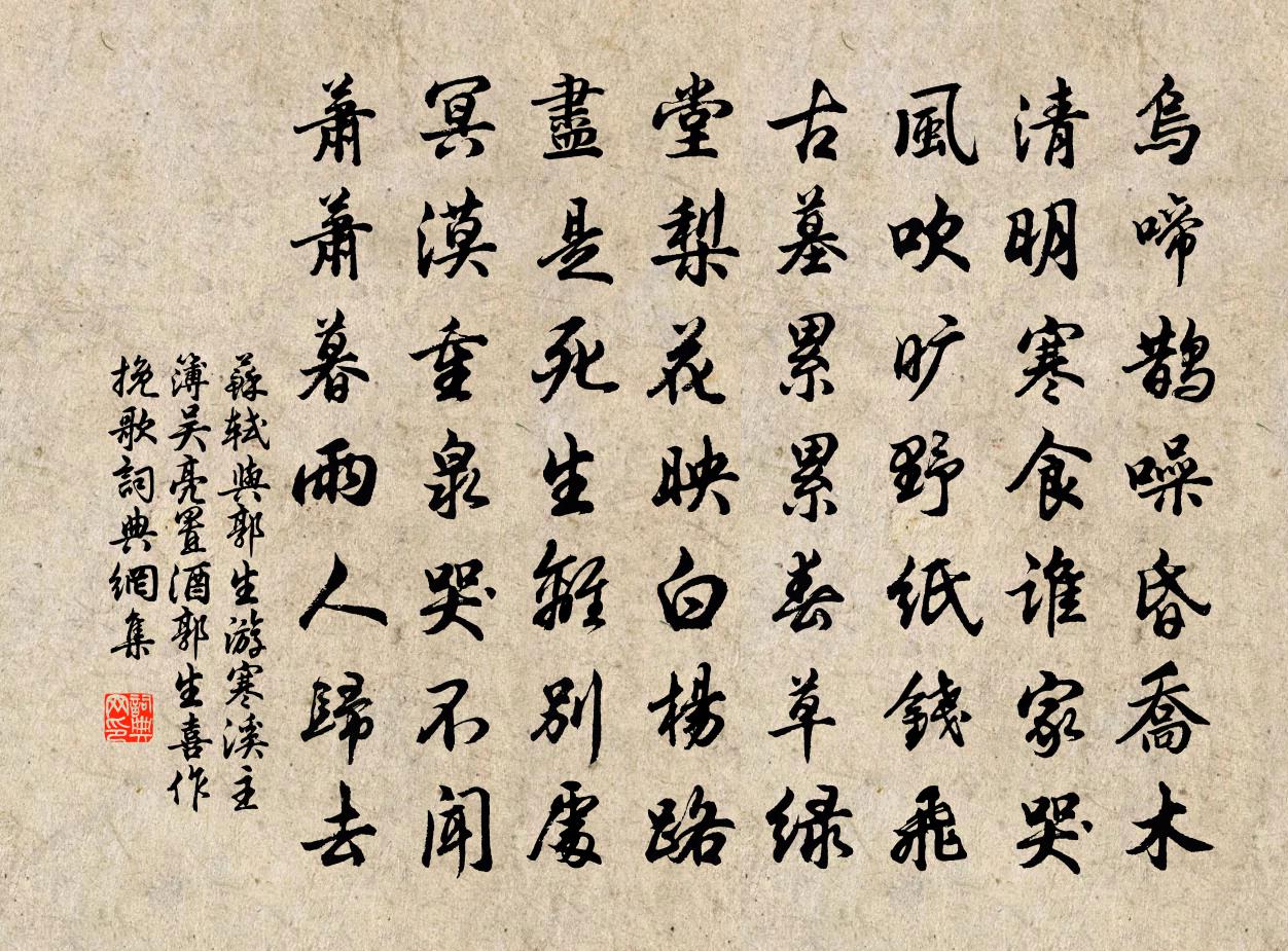 烏啼鵲噪昏喬木,清明寒食誰家哭。風吹曠野紙錢飛,古墓累累春草綠。