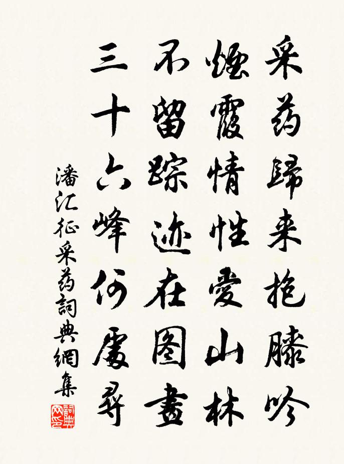 詩詞名句歷史字典書法欣賞書法字典國語詞典說文解字康熙字典古漢語字典標 題 作 者 詩 句 採藥作者:潘匯征 朝代:宋代採藥原文採藥歸來抱膝吟,煙霞情性1/1愛山林。不留蹤跡在圖畫,三十六峰何處尋。詩詞問答問:採藥的作者是誰?答:潘匯征問:採藥寫於哪個朝代?答:宋代潘匯征採藥書法欣賞採藥書法作品詩詞推薦寄福清翅山舅陳夢寔敖陶孫〔宋代〕路岐引人不作長,野梅官柳野風光。看山看水入詩眼,歲月不覺鬚眉蒼。請從丈人開肺腸,身非石人忘故鄉。五年漁父詞/漁父趙構〔宋代〕一湖春水夜來生。幾疊春山遠更橫。煙艇小,釣絲輕。贏得閒中萬古名。梅鄭谷〔唐代〕江國正寒春信穩,嶺頭枝上雪飄飄。何言落處堪惆悵,直是開時也寂寥。素 * 尊桃莫比,孤香黏袖李須饒。離人次徐徑坂四言韻趙汝騰〔宋代〕欹枕肱曲,匱藏美玉。造道高深,庭草交綠。中庸致曲,學記琢玉。子過仙柯,瞻彼淇綠。良坦侄再轉福清縣贈行趙與辟〔宋代〕甲年謝策志應酬,今日分符力已優。好把丹心懸北闕,春風次第荷綸褒。峽州渡江入寺李復〔宋代〕江上招提古,蕭疏對郡城。延賓竹榻靜,過雨石堂清。齋接荊州供,題多蜀士名。老僧飛錫倦,歸坐聽江聲。唐兒歌(杜豳公之子)李賀〔唐代〕頭玉磽磽眉刷翠,杜郎生得真男子。骨重神寒天廟器,一雙瞳人剪秋水。竹馬梢梢搖綠尾,銀鸞睒光踏半臂。東家頌古七首釋祖璇〔宋代〕大悲手眼問來親,王老酬機列主賓。倒轉鑰頭來快便,從茲六國絕煙塵。五代曾極〔宋代〕弒篡起交爭,中原戰血腥。王庭更五姓,民戶乏孤丁。耕織常年弛,干戈甚日停。聖人祈早降,香霧達高冥。跋徐蜚英四世祖神童事方回〔宋代〕□□□□□□□,□□□□□□□。□□□□□□□,□軍不復過前村。鷓鴣天張孝忠〔宋代〕豆蔻梢頭春意濃。薄羅衫子柳腰風。人間乍識瑤池似,天上渾疑月殿空。眉黛小,髻雲松。背人慾整又還慵。多應感春十三首張耒〔宋代〕浮雲起南山,冉冉朝復雨。蒼鳩鳴竹間,兩兩自相語。老農城中歸,沽酒飲其婦。共言今年麥,新綠已映土。去年次韻黃子虛同飲葛次顏家釀玉友沈與求〔宋代〕先生早年忘掃白,懶飯青菁借顏色。獨餘歡伯為友朋,熟不暇篘巾自瀝。何須引泉連百井,飲莽長虹太豪猛。細斟夏日簡王尉方岳〔宋代〕松蘿為屋芰荷衣,只與鳧鷗共釣磯。雌霓橫溪遮雨斷,雄風吹雨作塵飛。山林誰可閒來往。世俗難論真是非。頗喜又寄徐璣〔宋代〕庭深自無暑,苔徑復縈紆。賓客不長到,兒童亦可娛。茶花晴帶粉,蒲葉曉凝珠。與爾城闉隔,茲歡息不殊。謝新胥口監生趙立之程公許〔宋代〕魯壁嶧碑遠莫睹,艱哉河流訊鞀鼓。披荒摸搭不厭多,繙閱端能助稽古。向來四壁風雨秋,誰遣彯纓群玉府。終年橫吹曲辭。關山月張籍〔唐代〕秋月朗朗關山上,山中行人馬蹄響。關山秋來雨雪多,行人見月唱邊歌。海邊漠漠天氣白,胡兒夜度黃龍磧。軍中和即事張耒〔宋代〕溪如圓塹木如城,魚鳥從游信此情。啅雀踏枝飛尚裊,仰荷承雨側還傾。彈琴廢久重尋譜,種藥求多旋記名。於世觀裴秀才松石障歌皎然〔唐代〕誰工此松唯拂墨,巧思丹青營不得。初寫松梢風正生,此中勢與真松爭。高柯細葉動颯颯,乍聽幽飀如有聲。左右逢僧文禮周弼〔宋代〕空山落日又逢僧,雨雜塵灰滿帽紋。但憶來時門不掩,麝香偷臥石床雲。名句推薦夫惜草茅者耗禾穗,惠盜賊者傷良民。韓非及後人《韓非子·難二》 羌管悠悠霜滿地,人不寐,將軍白髮征夫淚。范仲淹《漁家傲·秋思》 萬物並育而不相害。道並行而不相悖。小德川流;大德敦化。子思《中庸·第三十章》 何時倚虛幌,雙照淚痕乾。杜甫《月夜》 行行重行行,與君生別離。佚名《行行重行行》 事在四方,要在中央。韓非及後人《韓非子·揚權》 春未綠,鬢先絲。人間別久不成悲。姜夔《鷓鴣天·元夕有所夢》 無言暗將紅淚彈。闌珊,香銷輕夢還。納蘭性德《河傳·春淺》 遠夢歸侵曉,家書到隔年。杜牧《旅宿》 災人者,人必反 災之。莊子《莊子·內篇·人間世》
