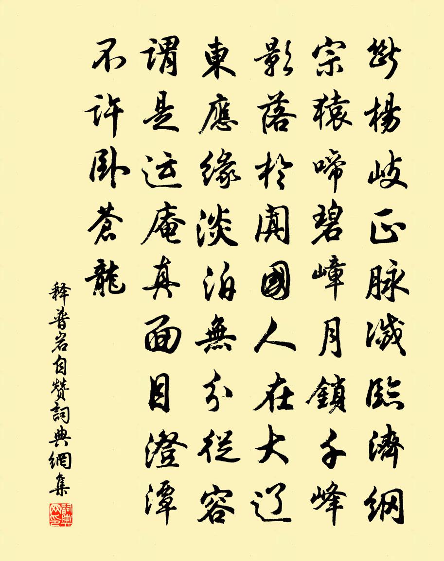 詩詞名句歷史字典書法欣賞書法字典國語詞典說文解字康熙字典古漢語字典標 題 作 者 詩 句 自贊作者:釋普岩 朝代:宋代自贊原文斷楊岐正脈,滅臨濟綱宗。猿啼碧嶂,月鎖千峰。影落於闐國,人在大遼東。應緣淡泊,無分從容。謂是運庵真面目,澄潭不許臥蒼龍。詩詞問答問:自贊的作者是誰?答:釋普岩問:自贊寫於哪個朝代?答:宋代釋普岩自贊書法欣賞自贊書法作品詩詞推薦梅梁堰陳允平〔宋代〕廟近雲濤觀,山遙翠欲重。只應溪上木,便是洞中龍。堰折潮歸海,欞迎浪答鍾。斷碑荒鮮合,終古載靈蹤。辛卯元日三首方回〔宋代〕十年爭席聽漁樵,辦著心情耐寂寥。老覺歲華殊易邁,愁嫌日晷似難消。縱無詩句題桃板,也有春光到柳條。何限神移泉釋惟岳〔宋代〕岩頭瀑布瀉寒煙,井底澄清浸月圓。性水真空周法界,神從何處更移泉。山前王安石〔宋代〕山前溪水漲潺潺,山後雲埋不見山。不趁雨來耕水際,即穿雲去臥山間。送朱子式從軍馬廷鸞〔宋代〕折鏃奇勳在,衝冠怒氣深。堯天日月大,禹甸噎霾侵。塞下將軍令,隆中梁甫吟。酒行君可起,快展擊胡心。秋夜長張玉孃〔宋代〕秋風生夜涼,風涼秋夜長。貧看山月白,清露溫衣裳。次歲雪後作衛宗武〔宋代〕伊耆令將行,玄冥車載轄。玉律歲肇新,一白至再白。三冬望上瑞,猶喜在窮臘。霅然沖氣布,潛可弭凶札。積之月岩陳宓〔宋代〕人間元有廣寒宮,誰道仙凡路不通。借問蓬萊相近否,不須七碗去乘風。和范景仁王景彝殿中雜題三十八首並次韻其三梅堯臣〔宋代〕紫微垣里月光飛,玉佩腰間正陸離。天上去來知幾日,蟠桃結子是歸時。作詩劉叉〔唐代〕作詩無知音,作不如不作。未逢賡載人,此道終寂寞。有虞今已歿,來者誰為托。朗詠豁心胸,筆與淚俱落。偶題陳去疾〔唐代〕魂夢天南垂,宿昔萬里道。池台花氣深,到處生春草。瀑布泉陳沂〔〕雲間瀑布三千尺,天外回峰十二重。滿耳怒雷飛急雨,轉頭紅日在青松。次余仲庸松風閣韻十九首 其十八裘萬頃〔宋代〕坡谷遺書那復有,向來一紙抵千金。誰知懸腕與臥筆,如用大都留此心。王道者韋莊〔唐代〕五雲遙指海中央,金鼎曾傳肘後方。三島路岐空有月,十洲花木不知霜。因攜竹杖聞龍氣,為使仙童帶橘香。應笑覽古四十二首 其三十二楊維楨〔元代〕嘗疑王孝子,素履朴且莊。門生服縣役,逕行想不揚。孝子躬饁具,罄折在道旁。門生役已脫,詭道由此行。舟次金山貽了元張舜民〔宋代〕何年靈鷲鳥,飛落大江心。石壁雖難轉,風波不易禁。樓台分左右,日月見浮沉。便欲歸休庇,長嗟世累深。送黃尉解官因簡黃德亨廖行之〔宋代〕夫君解紐去通泉,十幅風帆下碧川。寶劍詩成光射斗,扶搖路穩翼垂天。湖山桂老乘秋興,越水梅開近日邊。丹扆句吳璋〔宋代〕衣無錦繡勞心織,味乏膏粱困舌耕。偈頌七首釋思岳〔宋代〕世尊不說一個字,大藏小藏從此出。達磨九年面壁來,得皮得髓分優劣。秦州雜詩二十首·其八杜甫〔唐代〕聞道尋源使,從天此路回。牽牛去幾許,宛馬至今來。一望幽燕隔,何時郡國開。東征健兒盡,羌笛暮吹哀。名句推薦鴻雁在雲魚在水。惆悵此情難寄。晏殊《清平樂·紅箋小字》 楊花落,燕子橫穿朱閣。李清臣《謁金門·楊花落》 貞女貴徇夫,捨生亦如此。孟郊《列女操 / 烈女操》 夜夜相思更漏殘,傷心明月憑闌乾,想君思我錦衾寒。韋莊《浣溪沙·夜夜相思更漏殘》 掩柴扉,謝他梅竹伴我冷書齋。沈自晉《玉芙蓉·雨窗小詠》 龜游蓮葉上,鳥宿蘆花里。李白《姑孰十詠》 君子之學進於道,小人之學進於利。王通《中說·卷二·天地篇》 水中可居者曰洲,小洲曰陼,小陼曰沚,小沚曰坻。佚名《爾雅·釋水》 邊月隨弓影,胡霜拂劍花。李白《塞下曲六首》 日照香爐生紫煙,遙看瀑布掛前川。李白《望廬山瀑布》