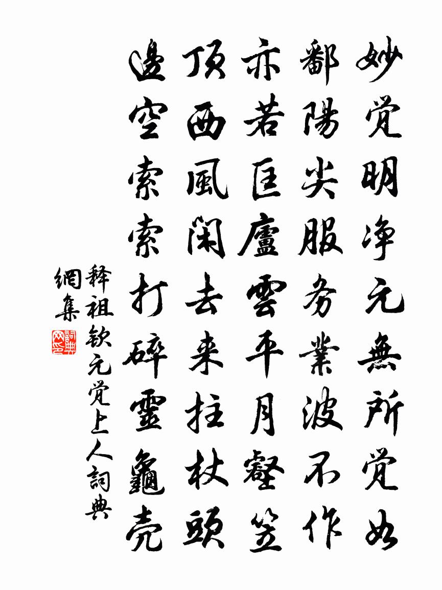 詩詞名句歷史字典書法欣賞書法字典國語詞典說文解字康熙字典古漢語字典標 題 作 者 詩 句 元覺上人作者:釋祖欽 朝代:宋代元覺上人原文妙覺明淨,元無所覺。如鄱陽尖服務業波不作。亦若匡廬,雲平月壑。笠頂西風閒去來,拄杖頭邊空索索,打碎靈龜殼。詩詞問答問:元覺上人的作者是誰?答:釋祖欽問:元覺上人寫於哪個朝代?答:宋代釋祖欽元覺上人書法欣賞元覺上人書法作品詩詞推薦偈頌七十一首釋了惠〔宋代〕瞿塘三峽山波險,棧閣連雲行路難。烽眾相連兵刃接,一封鄉信報平安。水調歌頭(湯坡見和、用韻為謝)辛棄疾〔宋代〕白日射金闕,虎豹九關開。見君諫疏頻上,高論挽天回。千古忠肝義膽,萬里蠻煙瘴雨,往事莫驚猜。政恐不免耳少年游(雙調)張先〔宋代〕紅葉黃花秋又老,疏雨更西風。山重水遠,雲閒天淡,遊子斷腸中。青樓薄倖何時見,細說與、這忡忡。念遠離情沙岡趙方〔宋代〕問鄧何酷愛沙岡,奇秀山光接水光。槐樹綠陰剛似蓋,天風吹動蟄龍翔。減字木蘭花沈瀛〔宋代〕蓬門居止。竹見賓來先嘯喜。窗外敲風。果有賓朋姓字通。莫嫌村酒。且祝佳賓萬千壽。無用辭何。日出明朝事更行路難戴叔倫〔唐代〕出門行路難,富貴安可期。淮陰不免惡少辱,阮生亦作窮途悲。顛倒英雄古來有,封侯卻屬屠沽兒。長安車馬隨輕題蔡潤畫李耕〔宋代〕雨過天如沐,回山濃翠侵。平橋帶野水,涓涓繞竹林。茅屋闃無人,案上橫素琴。白鷺正熟睡,杳無羨魚心。維舟東林一枝庵鄧肅〔宋代〕世間傑棟俯飛翰,簾旌不動天風寒。但得一身自安逸,誰思寒士三萬間。東林天下推第一,淨幾明窗萬禪客。主人書異元稹〔唐代〕孟冬初寒月,渚澤蒲尚青。飄蕭北風起,皓雪紛滿庭。行過冬至後,凍閉萬物零。奔渾馳暴雨,驟鼓轟雷霆。傳雲喜葉謙夫歸薛師石〔宋代〕老思忽蕭爽,親朋得意歸。菊觴奉親壽,柳色上儒衣。宅旺看山勢,門清有釣磯。我來聊問字,澹坐月侵扉。行葦佚名〔先秦〕敦彼行葦,牛羊勿踐履。方苞方體,維葉泥泥。戚戚兄弟,莫遠具爾。或肆之筵,或授之幾。肆筵設席,授幾有緝重修龍興觀寄呈江吳二尊師金君卿〔宋代〕壇宇榛蕪幾十年,遺基重葺控長川。羽人便是雙飛鶴,仙籍須增一洞天。藍嶠逢秋無敗葉,龜池經夏有甘泉。操舟鹿泉成士王覺民頗有杜子美不徹之惱和東坡憶王之道〔宋代〕鹿泉居士身若槁,不慣看花夢顛倒。桐廬有客燕新錯,妄托嬌痴重伊惱。凍雲垂地雪欲落,斷雁叫群天尚早。一枝永佑陵喻良能〔宋代〕小臣生長宣和初,深仁浹髓淪肌膚。只今白首馮唐似,何幸清齋拜鼎湖。題李次雲窗竹白居易〔唐代〕不用裁為鳴鳳管,不須截作釣魚竿。千花百草凋零後,留向紛紛雪裡看。好事近王以寧〔宋代〕白石讀書房,世有斗南人傑。一段素襟清韻,似玉壺冰雪。仙家赤酒薦交梨,道眼況超越。來往十州三島,跨一輪春趙葵〔宋代〕綠竹移陰抹書牆,倚欄紅藥殿春光。風開簾幙催香篆,坐聽鶯聲春書長。蕭巽葛敏修二學子和予食筍詩次韻答之二首黃庭堅〔宋代〕北饌厭羊酪,南庖豐筍菜。自北初落南,幾為兒所賣。習知價廉平,百態事烹宰。鹽曦枯臘瘦,蜜漬真味壞。就根雨中看花胡仲弓〔宋代〕頑雲痴雨霸春寒,李白桃紅總失歡。試問東君因底事,卻來花上作艱難。詩三首釋邁賢〔宋代〕心間增道氣,忍事敵災屯。謹言終少禍,節儉勝求人。名句推薦砌下落花風起,羅衣特地春寒。馮延巳《清平樂·雨晴煙晚》 近者不親,無務求遠墨子《墨子·02章 修身》 簾外雨潺潺,春意闌珊。李煜《浪淘沙令·簾外雨潺潺》 扁舟一棹歸何處?家在江南黃葉村。蘇軾《書李世南所畫秋景》 東風吹雨過青山,卻望千門草色閒。盧綸《長安春望》 誰道人生無再少?門前流水尚能西!休將白髮唱黃雞。蘇軾《浣溪沙·游蘄水清泉寺》 不見又思量,見了還依舊。李之儀《謝池春·殘寒銷盡》 過目成誦,出口成章。馮夢龍《警世通言·卷三》 日夕涼風至,聞蟬但益悲。孟浩然《秦中感秋寄遠上人 / 秦中寄遠上人》 木蘭舟上,何處吳娃越艷:藕花紅照臉。孫光憲《河傳·風颭》