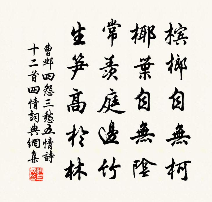 詩詞名句歷史字典書法欣賞書法字典國語詞典說文解字康熙字典古漢語字典標 題 作 者 詩 句 四怨三愁五情詩十二首。四情作者:曹鄴 朝代:唐代原文檳榔自無柯,椰葉自無陰。常羨庭邊竹,生筍高於林。詩詞問答問:《四怨三愁五情詩十二首。四情》的作者是誰?答:曹鄴問:該詩寫於哪個朝代?答:唐代書法欣賞四怨三愁五情詩十二首。四情書法作品注釋全唐詩詩詞推薦成伯家宴造坐無由輒欲效顰而酒已盡入夜不欲蘇軾〔宋代〕道士令嚴難繼和,僧伽帽小卻空回。隔籬不喚鄰翁飲,抱瓮須防吏部來。頌古一○一首釋子淳〔宋代〕日午煙凝山突兀,夜央天淡月嬋娟。混然寂照寒宵永,明暗圓融未兆前。滿庭芳楊 * 〔宋代〕春過園林,雨餘池沼,嫩荷點點青圓。晝長人靜,芳樹欲生煙。一徑幽通邃竹,松風漱、石齒濺濺。平生志,功名十二時洪邁〔宋代〕璧門雙闕轉蒼龍。德壽儼祇宮。軒屏正坐,天子親拜天公。儀紳笏,羅鵷鷺,粲庭中。仙家歡不盡,人世壽無窮。積雨小霽楊萬里〔宋代〕雨足山雲半欲開,新秧猶待小暄催。一雙百舌花梢語,四顧無人忽下來。寄元均石介〔宋代〕君為儒者豈知兵,何事欣隨壁馬行。裴度樽前坐韓愈,趙成帳下立荀卿。御戎誰道全無策,對壘寧妨一下枰。須信次邦憲宣德紅梅詩韻吳頤〔宋代〕絕品花逢絕俗人,吟看屢倒接?巾。剸煩自昔多餘刃,痛飲於今莫負春。喜事擅名雖有素,屢空此語恐非真。典衣孤翼吟劉子翬〔宋代〕哀哀孤飛禽,聲鳴何悲酸。含情若有訴,口訥無由宣。瞻雲憶舊侶,悠悠隔山川。勿言異類微,聚散同悲歡。零霜古風其三十二李白〔唐代〕蓐收肅金氣。西陸弦海月。秋蟬號階軒。感物憂不歇。良辰竟何許。大運有淪忽。天寒悲風生。夜久眾星沒。惻惻次韻答景仁喜雨韓維〔宋代〕涼雲四向復,沴氣一消沉。上天垂景貺,高秋沾喜霖。槁苗變新實,時菊抽芳心。聆君得意句,起我掉頭吟。游山五題游大峒山余靖〔宋代〕十里松檜風,萬仞斗峭壁。陽崖雷自奔,陰壑雪猶積。勢爭衡霍雄,地控楚越扼。胡為千載間,名未光圖籍。物乃雨涼曉思方回〔宋代〕一榻涼如水,空山夜雨聲。病身筋骨在,往事夢魂驚。老壽知何益,憂危半此生。吾窮終不怨,稍已竊詩名。松江俞桂〔宋代〕香飄菡萏短篷中,水色山光一樣同。行止又非人所料,今年兩度上垂虹。安陽好/憶江南韓琦〔宋代〕安陽好,形勢魏西州。曼衍山川環故國,昇平歌吹沸高樓。和氣鎮飛浮。籠畫陌,喬木幾春秋。花外軒窗排遠岫,送章安世赴舉楊億〔宋代〕螢燭辛勤十載餘,藹然高價滿州閭。一枝未折仙人桂,千里又隨鄉老書。梁苑雪花成賦後,禹門雷鼓化鱗初。山城離京作寇準〔宋代〕致君才業本無能,戀闕情懷老不勝。欲過龍津重回首,朣朧初日上觚稜。再用韻十首楊公遠〔宋代〕村深林密處,路向小橋分。屋老誅茅葺,腸枯借酒醺。廢興隨反掌,富貴等浮雲。近更澆漓甚,傷懷不忍聞。奉和聖制送張說上集賢學士賜宴(賦得華字)韋述〔唐代〕修文中禁啟,改字令名加。台座征人傑,書坊應國華。賦詩開廣宴,賜酒酌流霞。雲散明金闕,池開照玉沙。掖垣煉丹砂 詠玄牝示眾李道純〔元代〕玄牝少人通。說與諸公。休言南北與西東。不在四維並上下,不在當中。闔*妙無窮。天地根宗。生生化化運神功賦得枕上聞雁賀鑄〔宋代〕朔吹飄驚雁,寒聲徹枕前。遠違沙漠雪,不下汶陽田。客夢悲中夜,歸期隔故年。莓苔與菰米,何處是湘天。名句推薦曉窗移枕,酒困香殘,春陰簾卷。吳文英《燭影搖紅·元夕雨》 當時明月在,曾照彩雲歸。晏幾道《臨江仙·夢後樓台高鎖》 半壁見海日,空中聞天雞。李白《夢遊天姥吟留別 / 別東魯諸公》 淮水悠悠。萬頃煙波萬頃愁。淮上女《減字木蘭花·淮山隱隱》 於事事物物上求至善,卻是義外也。王陽明《傳習錄·卷上·徐愛錄》 使殺生之機,奪予之要在大臣,如是者侵。韓非及後人《韓非子·三守》 奇外無奇更出奇,一波才動萬波隨。元好問《論詩三十首·二十二》 即從巴峽穿巫峽,便下襄陽向洛陽。杜甫《聞官軍收河南河北》 軍中宜劍舞,塞上重笳音。張說《幽州夜飲》 孤雁不飲啄,飛鳴聲念群。杜甫《孤雁 / 後飛雁》
