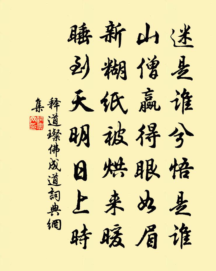 詩詞名句歷史字典書法欣賞書法字典國語詞典說文解字康熙字典古漢語字典標 題 作 者 詩 句 佛成道作者:釋道璨 朝代:宋代佛成道原文迷是誰兮悟是誰,山僧贏得眼如眉。新糊紙被烘來暖,睡到天明日上時。詩詞問答問:佛成道的作者是誰?答:釋道璨問:佛成道寫於哪個朝代?答:宋代釋道璨佛成道書法欣賞佛成道書法作品詩詞推薦慶春時晏幾道〔宋代〕倚天樓殿,昇平風月,彩仗春移。鸞絲鳳竹,長生調里,迎得翠輿歸。雕鞍游罷,何處還有心期。濃熏翠被,深停泛舟過吉澤陸游〔宋代〕蕭蕭菰蒲如荻林,五月已覺秋意深。煙波滅沒有漁艇,浦漵飛鳴多水禽。稽山出雲極奇變,陸子岸幘方微吟。一聲西叔兄生日魏了翁〔宋代〕花底班行錦樣明,中閒寧少紫青人。更無入誦成都賦,擬抗聲來問大鈞。夜懷張逸人釋智圓〔宋代〕默坐懷幽趣,誰知動鬱陶。窗虛殘月在,天靜少微高。書去言難盡,眠來夢亦勞。終期冒風雪,乘興泛輕舠。紹興以後祀五方帝六十首佚名〔宋代〕猗歟先農,筆茲黍稷。既殖既播,有此粒食。秬經潔清,比罇疏冪。竭我瑤斝,莫報嘉績。春末題池州弄水亭杜牧〔唐代〕使君四十四,兩佩左銅魚。為吏非循吏,論書讀底書?晚花紅艷靜,高樹綠陰初。亭宇清無比,溪山畫不如。嘉賓憂旱章甫〔宋代〕貧賤甘羈旅,淹留賴薄田。悠悠將送老,比比不逢年。旱魃工為虐,雷公豈易鞭。醉能忘萬事,安得酒如川。青玉案·乙酉重九葛守坐上作胡銓〔宋代〕宜霜開盡秋光老。感節物、愁多少。塵事難逢開口笑。滿林風雨,一江煙水,颯爽驚吹帽。玉堂金馬何須道。且斗句祝穆〔宋代〕黃花自與淵明別,不見閒人直到今。細花穿弱縷,盤向綠雲鬟。寄溧水宰李仲鎮曹勛〔宋代〕不見李君久,水雲魚雁沉。調官聊制錦,得句剩關心。每訪民情悅,相望春事深。故鄉與賢者,北首重登臨。題張濬所居壁楊億〔宋代〕三張舊族富英髦,仙墅重經散鬱陶。深喜太邱家法在,須知定國里門高。分題每日搖雞距,合宴常時把蟹螯。獨感寄杜北山顧逢〔宋代〕住與老逋鄰,空湖隔市塵。布衣安破屋,白髮守清貧。引鶴風穿袖,聽猿月滿身。五言吟得苦,一字不投人。仲威復枉粥字韻詩見屬甚厚不可不答趙蕃〔宋代〕盛時無窮民,漢詔優廩粥。邇來詔書行,亦齎帛與肉。薦才職諸侯,因異駕徵卜。共思急賢治,惟日有不足。士生送青神丞劉平仲解官三絕史堯弼〔宋代〕多奇趙北燕南地,還喜超然出冀方。氣習敦龐今復見,餘風千載有陶唐。十報恩 贈段先生 折段字起馬鈺〔元代〕公物外好生涯。火相逢結大砂。女盤桓看大藥。牛哮吼戲靈葩。雲鋪地丹爐赫,子觀天碧眼華。有三生君省悟,中久不雨陳淳〔宋代〕草廬臥龍目未開。岩溪作霖手未抬。蒼生望望亦勞爾,滂霈甘澤從何來。胡邦衡賦琉璃燈簾詩次韻周必大〔宋代〕雞林空詫夜明簾,鰲禁曾迎金炬蓮。卻向江城度元日,同看燈箔樂新年。盤紅坐覺光如晝,鞍白端令意欲仙。歸對趙山甫居玉壺盡得湖山之勝醉後和其韻二章杜范〔宋代〕占盡春光好,湖山一覽余。著身蓬島里,縱目畫屏如。我計還知錯,君謀定不疎。它年同到此,卜築莫躊躇。和士友傅勉之喜雨韻李曾伯〔宋代〕老生本不學軍旅,來護荊州國門戶。慚無善政格休徵,未能雨十與風五。今年甫幸登麥喜,入夏又以槁苗苦。驕陽送黃欽之赴廣州鹽稅三首陳藻〔宋代〕地氣周遭逐處流,五羊漸已似中州。海風吹斷山無瘴,炎月何妨作宦遊。名句推薦飢而欲食,寒而欲暖,勞而欲息,好利而惡害,是人之所生而有也。荀子《荀子·榮辱》 三年不翅,將以長羽翼;不飛不鳴,將以觀民則。雖無飛,飛必沖天;雖無鳴,鳴必驚人。韓非及後人《韓非子·喻老》 表獨立兮山之上,雲容容兮而在下;屈原《九歌》 嘆鳳嗟身否,傷麟怨道窮。李隆基《經鄒魯祭孔子而嘆之》 年方少,勿飲酒。飲酒醉,最為醜。李毓秀《弟子規·謹》 願借天風吹得遠,家家門巷盡成春。李方膺《題畫梅》 更深人去寂靜,但照壁孤燈相映。周邦彥《關河令·秋陰時晴漸向暝》 貴名不可以比周爭也,不可以誇誕有也,不可以勢重脅也荀子《荀子·儒效》 誰念西風獨自涼,蕭蕭黃葉閉疏窗,沉思往事立殘陽。納蘭性德《浣溪沙·誰念西風獨自涼》 高田如樓梯,平田如棋局。楊慎《出郊》