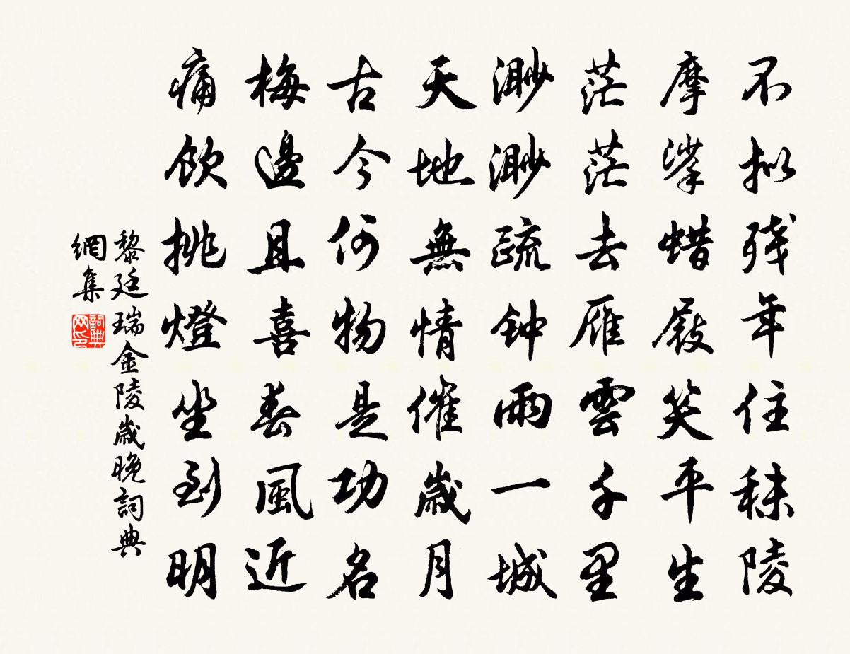 詩詞名句歷史字典書法欣賞書法字典國語詞典說文解字康熙字典古漢語字典標 題 作 者 詩 句 金陵歲晚作者:黎廷瑞 朝代:宋代金陵歲晚原文不擬殘年住秣陵,摩挲蠟屐笑平生。茫茫去雁雲千里。渺渺疏鍾雨一城。天地無情催歲月,古今何物是功名。梅邊且喜春風近,痛飲挑燈坐到明。詩詞問答問:金陵歲晚的作者是誰?答:黎廷瑞問:金陵歲晚寫於哪個朝代?答:宋代黎廷瑞金陵歲晚書法欣賞金陵歲晚書法作品詩詞推薦題丁少瞻林園徐照〔宋代〕州分低嶺外,來向此園行。路改初栽樹,堂成未有名。藥苗如草長,岩溜入池清。欲識懷君意,時聞鶴一鳴。次蕭饒州韻仇遠〔宋代〕愛山如愛士,交友竟忘年。未老先辭祿,能閒始是仙。清談真藥石,雅志樂林泉。笑看衡門外,隨風柳絮顛。六么令·夷則宮七夕吳文英〔宋代〕露蛩初響,機杼還催織。婺星為情慵懶,佇立明河側。不見津頭艇子,望絕南飛翼。雲梁千尺。塵緣一點,回首西謝人惠三峰朱柿陳洎〔宋代〕烏椑珍果益丹名,新折紅林蔕尚青。漿冷夜凝仙掌露,味甘秋割楚江萍。圓堆玉盌櫻難並,賸薦金樽酒易醒。應念酒泉子李珣〔唐代〕寂寞青樓,風觸繡簾珠碎撼。月朦朧,花暗澹,鎖春愁尋思往事依稀夢,淚臉露桃紅色重。鬢欹蟬,釵墜鳳,思悠次韻陳叔易蘆橋二首晃沖之〔宋代〕橋闊狹如馬,蘆高低似人。白苹洲上客,枉恨洞庭春。孤山後寫望林逋〔宋代〕水墨屏風狀總非,作詩除是謝玄暉。溪橋裊裊穿黃葉,樵斧丁丁斫翠微。返照未沉僧獨在,長煙如淡鳥橫飛。南峰言志釋文珦〔宋代〕窮居雖寂寥,苦節諒難改。青青山上薇,朝莫猶可采。薇盡而長飢,餓死亦無悔。古者夷與齊,清風彌億載。送潤州通判屯田歐陽修〔宋代〕船頭初轉兩旗開,清曉津亭疊鼓催。自古江山最佳處,況君談笑有餘才。雲愁海闊驚濤漲,木落霜清畫角哀。善政大滌山葉紹翁〔宋代〕倦身只欲臥林丘,羽客知心解款留。泉溜涓涓中夜雨,天風凜凜四時秋。虎岩月澹迷仙路,龍洞雲深透別州。九鎖西山僅老失牛求一言於邑數語代書樓鑰〔宋代〕一介毛扣門,毛尺毛在手。不是長須饋鯉,乃知中夜忘牛。拽把牽犁,能耕百畝。披毛戴角,方得五春。是何西山收兩京後還上都兼訪一二親故方乾〔唐代〕離堂千里客,歸騎五陵人。路轉函關晚,煙開上苑新。天涯將野服,闕下見鄉親。問得存亡事,裁詩寄海濱。孝宗明堂前朝獻景靈宮八首真宗〔宋代〕華燈熒煌,瑞煙氤氳。威神如在,蠲潔必親。再興於疊,再帨於巾。皇心肅祗,其敢憚勤。憶鶴白玉蟾〔宋代〕洞裡不知城市改,人間再到子孫非。有誰尚自看華表,何處如今叫令威。和魏桐城題三瀑泉贈湯洞卿王之道〔宋代〕奔霆響空山,飛連掛絕壁。毛髮忽森豎,精神共英特。平生丘壑姿,至此意頗適。何必游九華,龍眠自尤物。經亂離後天恩流夜郎憶舊遊書懷贈江夏韋太守良宰李白〔唐代〕天上白玉京,十二樓五城。仙人撫我頂,結髮受長生。 誤逐世間樂,頗窮理亂情。九十六聖君,浮雲掛空名。 送范曙赴天雄太尉辟命石介〔宋代〕伯樂之廄無駑駘,豫章之林多瑰材,相君新坐碧油嶂,之子直上黃金台。秋風蕭蕭動笳鼓,落葉摵摵鳴向罍。將軍哭鄭君瑞長官二首劉克莊〔宋代〕史著陶潛卒,何妨爵秩卑。竟無乞米帖,止有採薇詩。舊友誰為誄,新阡尚欠碑。中年哭同志,孤立可勝悲。小亭落成都官有詩次韻以謝洪皓〔宋代〕我被儒冠誤此身,公緣何事作流人。瓊葩乍折香勝雪,玉版初嘗暖似春。月桂他年應獨拍,瓊林今日遂重新。披襟農家陸游〔宋代〕低垣矮屋俯江流,渾舍相娛到白頭。累世不知名宦樂,百年那識別離愁。飯余常貯新陳谷,農隙閒眠子母牛。聞道名句推薦若似月輪終皎潔,不辭冰雪為卿熱。納蘭性德《蝶戀花·辛苦最憐天上月》 疏懶意何長,春風花草香。黃庭堅《菩薩蠻·半煙半雨溪橋畔》 去年花里逢君別,今日花開已一年。韋應物《寄李儋元錫》 醉別江樓橘柚香,江風引雨入舟涼。王昌齡《送魏二》 隱約遙峰,和淚謝娘眉嫵。史達祖《綺羅香·詠春雨》 里仁為美,擇不處仁,焉得知?孔子弟子《論語·里仁篇》 人生有酒須當醉,一滴何曾到九泉。高翥《清明日對酒》 枝上柳綿吹又少。天涯何處無芳草。蘇軾《蝶戀花·春景》 獵人箭底求傷雁,釣戶竿頭乞活魚。王建《寄舊山僧》 路入南中,桄榔葉暗蓼花紅。歐陽炯《南鄉子·路入南中》